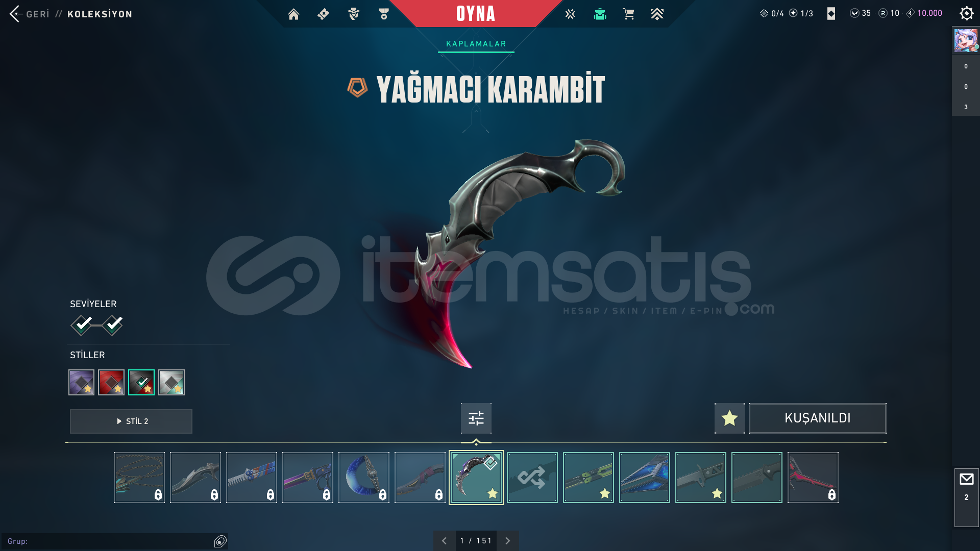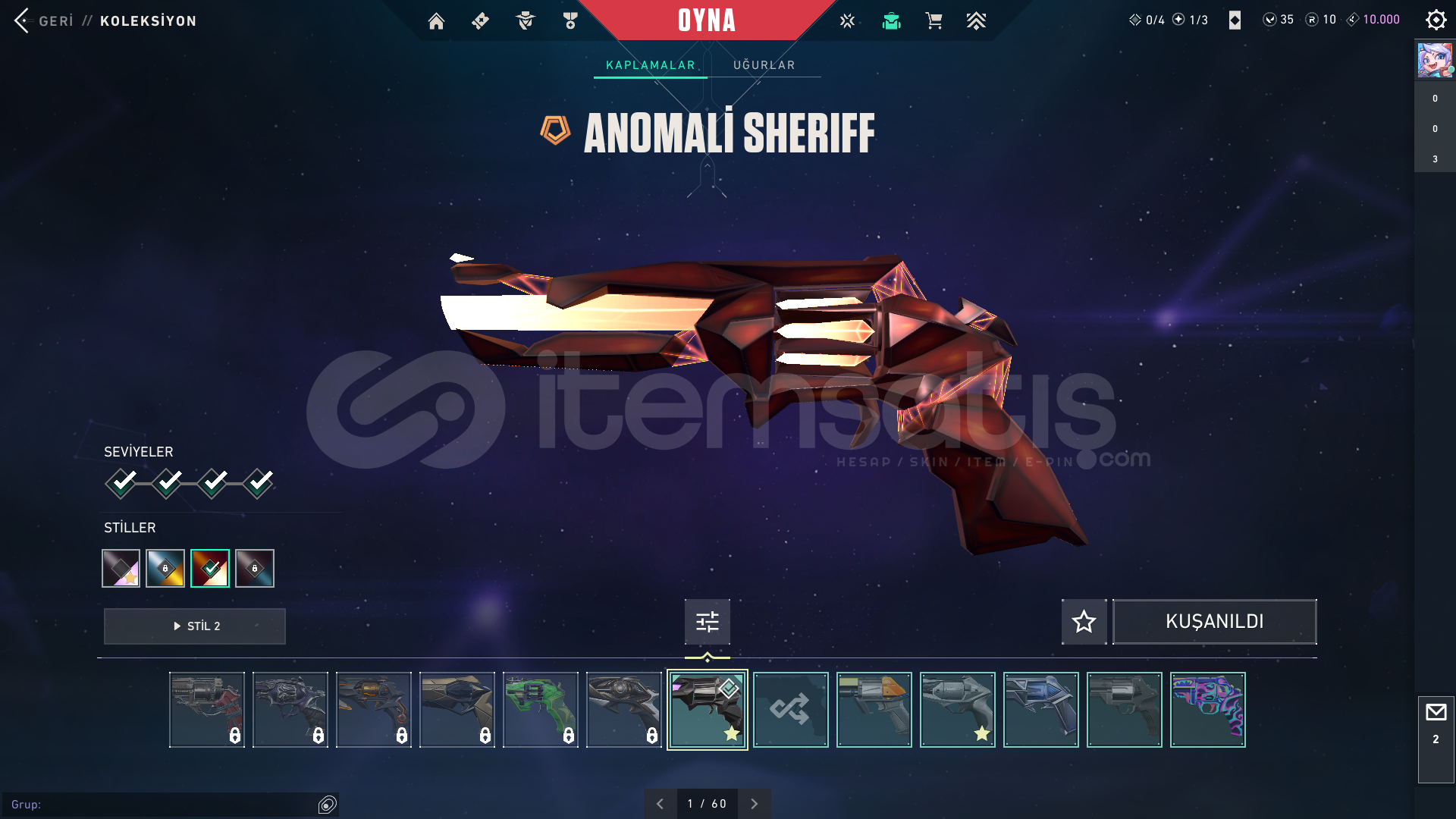 asil classic, fut classic ,ulupençe ghost, fatih ghost, anomali sherif, iyon sherif, rgx guardian, özel harekat phantom, yağmacı phantom, asil vandal, champions 2024 vandal,iyon vandal, kaos vandal, kuronami vandal, zamanın ötesi vandal , soğuk çelik vandal,neptün vandal, rgx karambit, yağmacı karambit, rgx kelebek, uzaylı avcısı bıçaki yıldız belası outlaw, sır çiöeği operatör, cesur yürek operatör