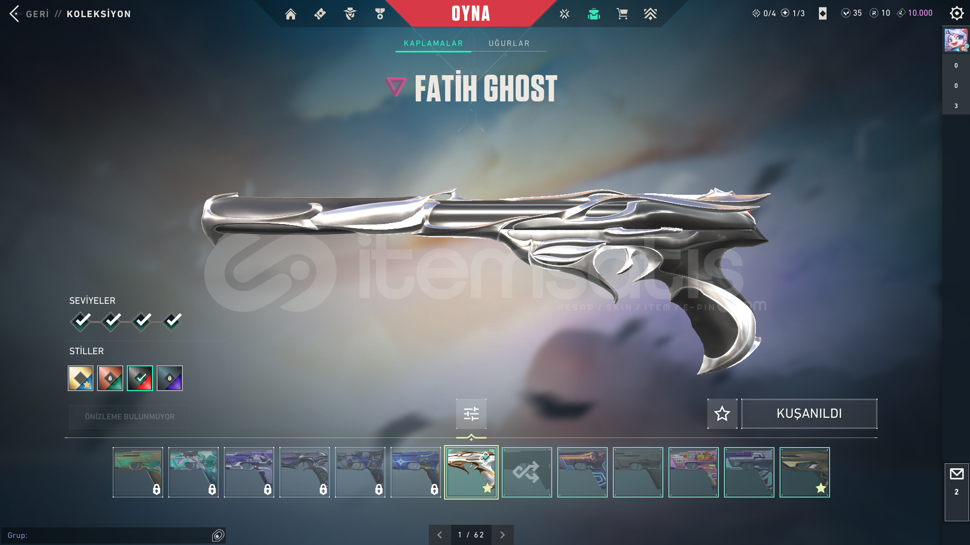 asil classic, fut classic ,ulupençe ghost, fatih ghost, anomali sherif, iyon sherif, rgx guardian, özel harekat phantom, yağmacı phantom, asil vandal, champions 2024 vandal,iyon vandal, kaos vandal, kuronami vandal, zamanın ötesi vandal , soğuk çelik vandal,neptün vandal, rgx karambit, yağmacı karambit, rgx kelebek, uzaylı avcısı bıçaki yıldız belası outlaw, sır çiöeği opera...