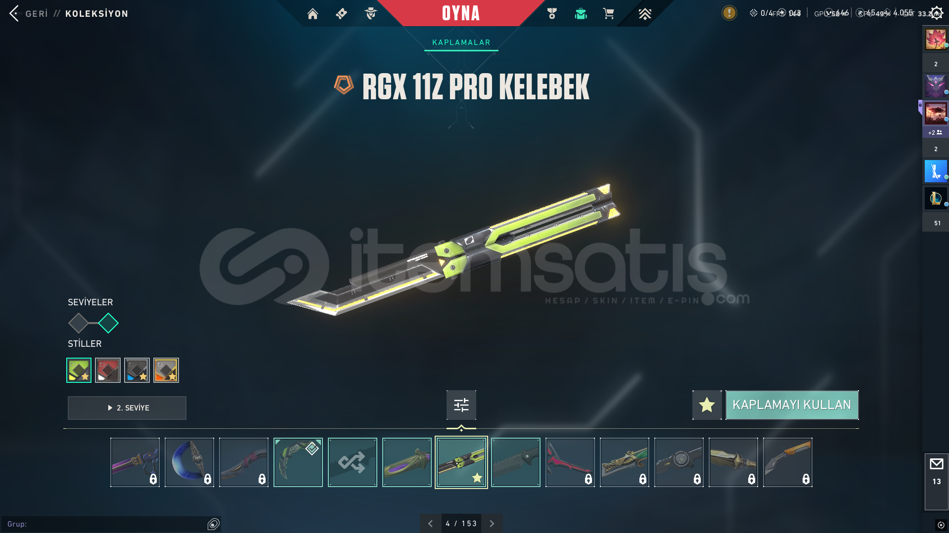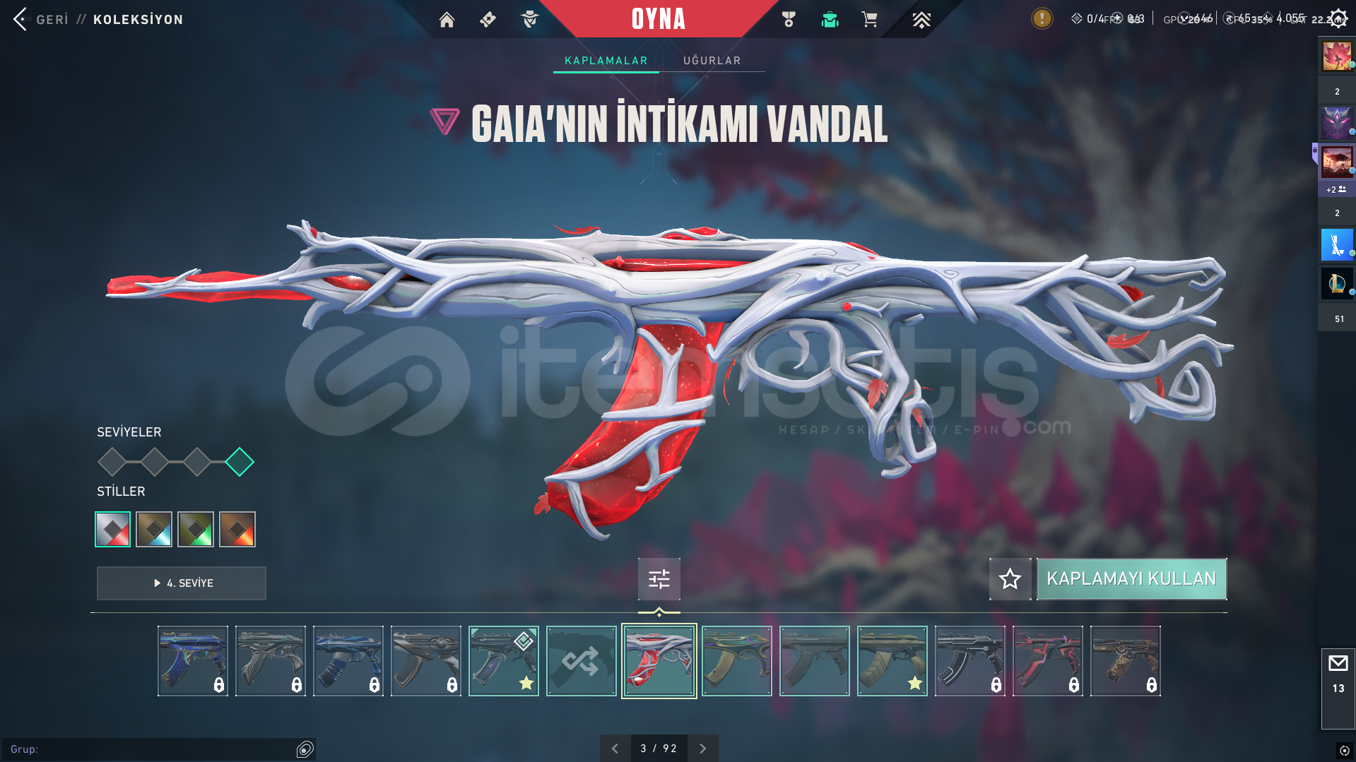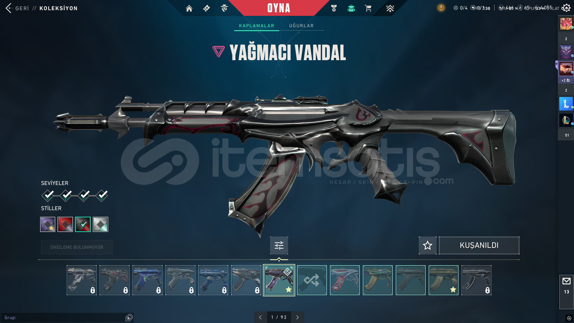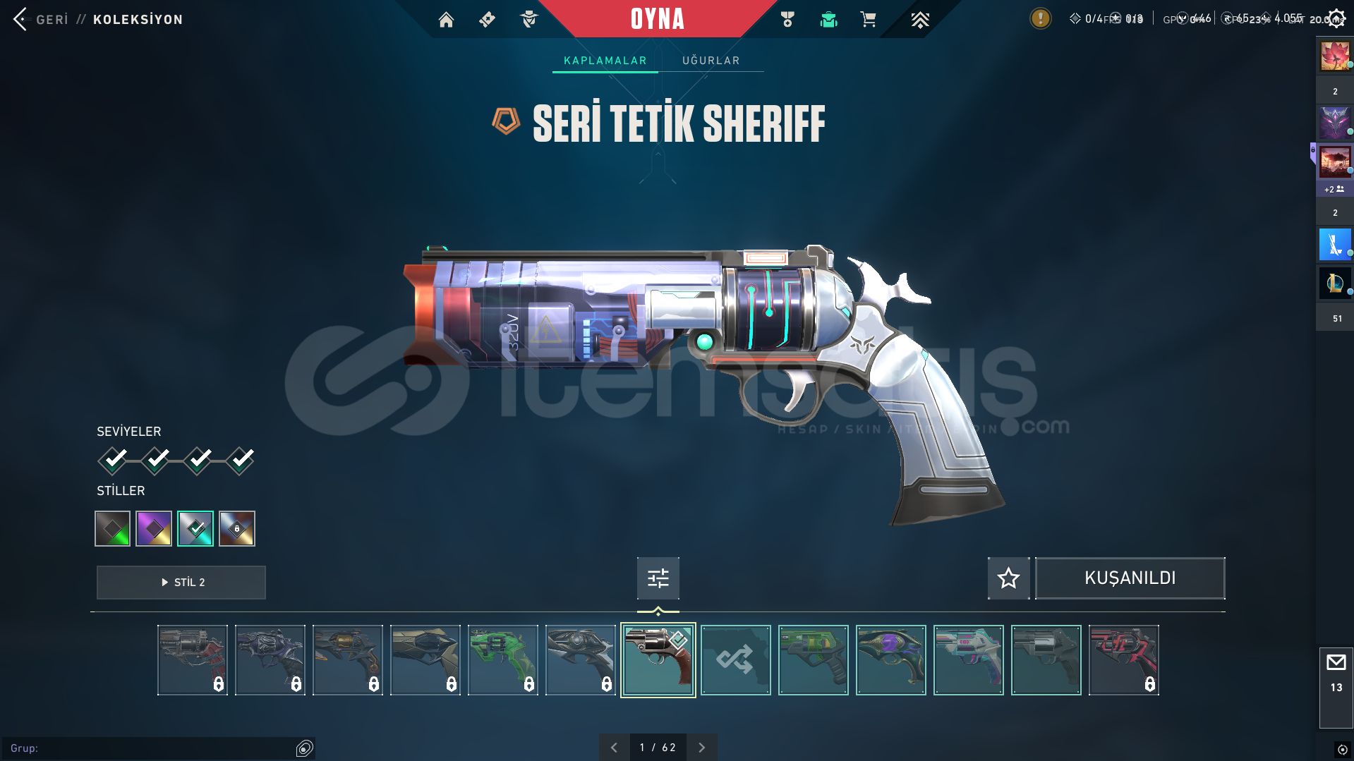 SKİNLERAsil Classic,Seri Tetik SherrifGaia Vandal,Yıldız Belası Vandal,Yağmacı VandalAfet PhantomYıldız Belası OperatörBIÇAKLARRGX KarambitRGX KelebekHESAPTA EKSTRA OLARAK 440VP BULUNMAKTADIR!!!