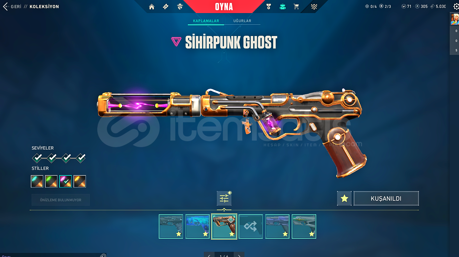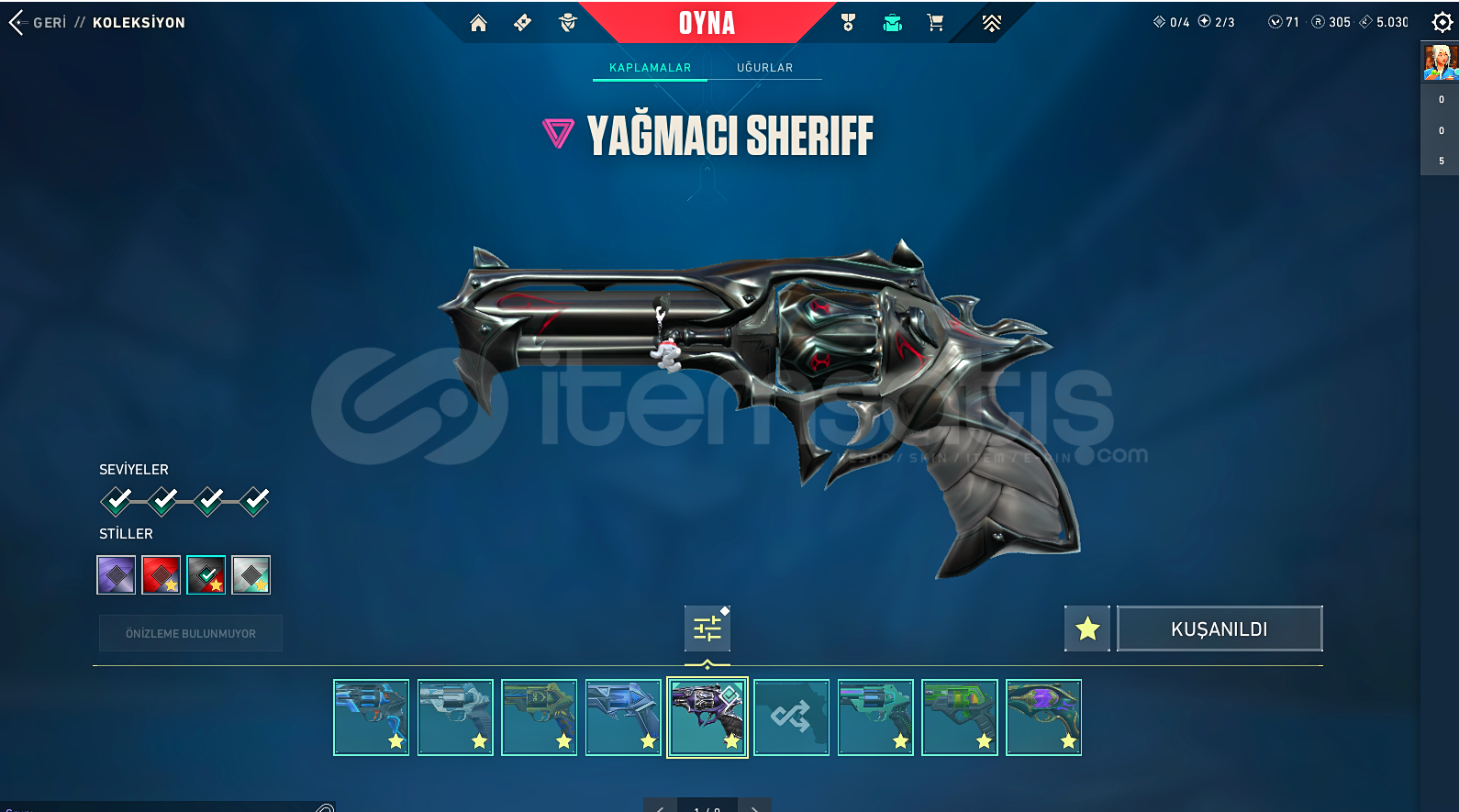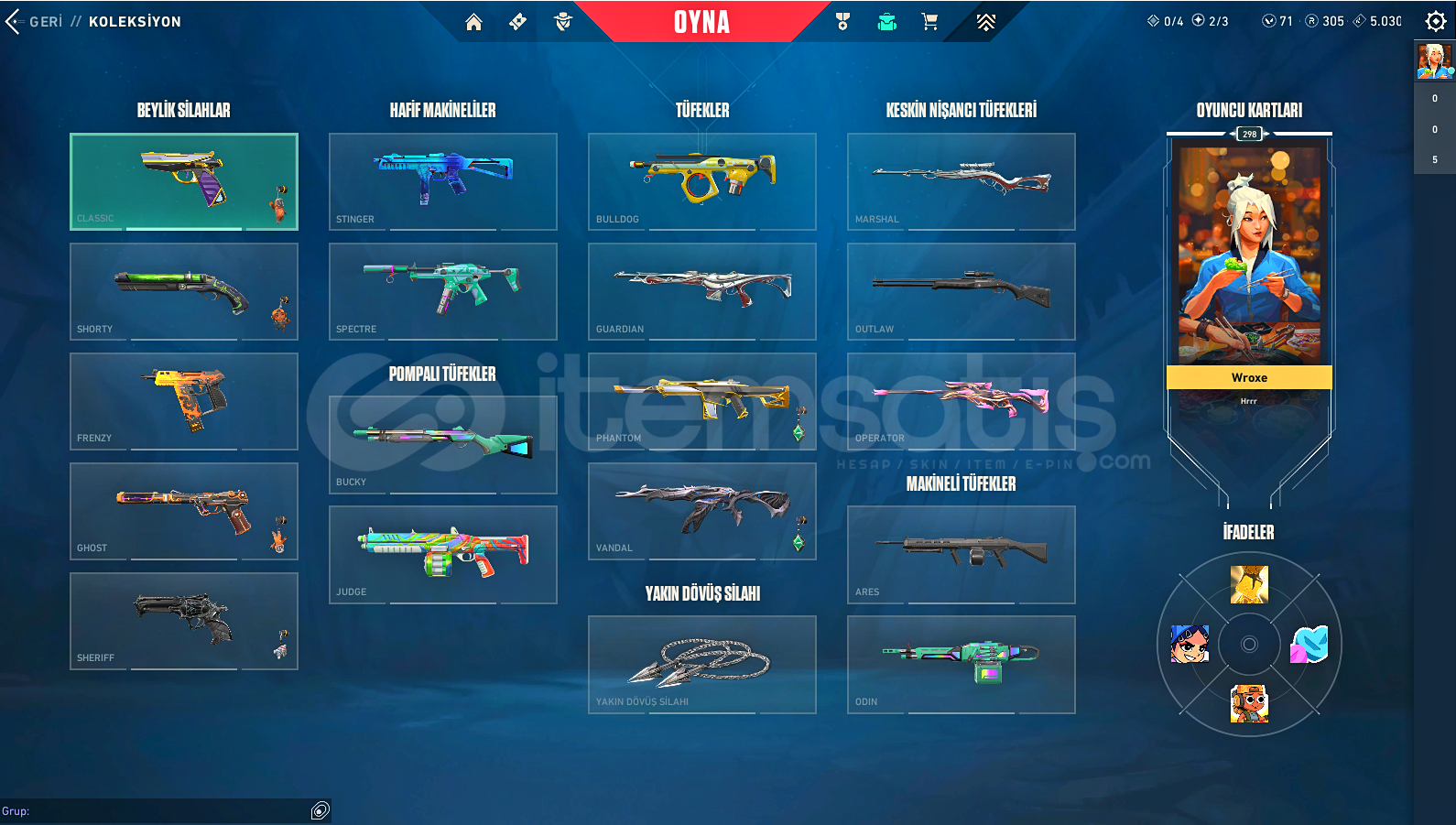 Başlıca SkinlerVandalFelaketin Kalbi VandalCesur Yürek VandalEjder Ateşi VandalExo VandalSürat Canavarı Vandal // +2 adet bp skiniPhantomAsil PhantomÖzel Harekat PhantomOni Phantom // +2 adet bp skiniOPERATÖRSIRÇİÇEĞİ OPERATÖRSHERİFFYağmacı Sheriff // +7 adet bp skiniGHOSTSihirpunk Ghost // +4 adet bp skiniClassicAsil Classic // +6 adet bp skiniEkstralarChampions 25 kupası donatı olanİkililer ...