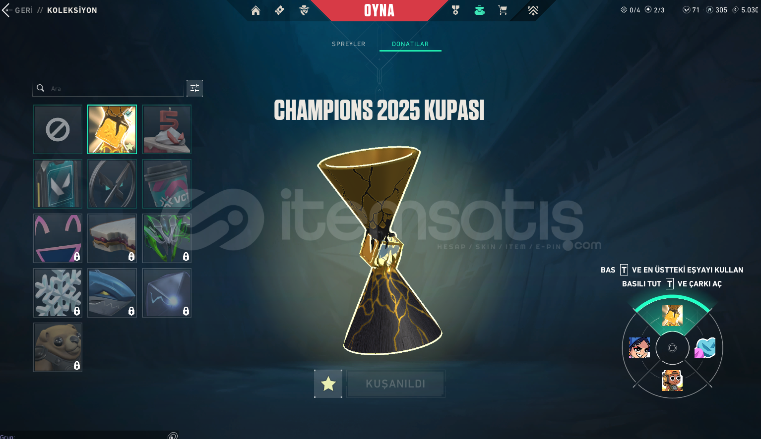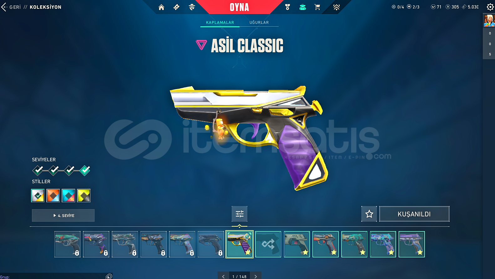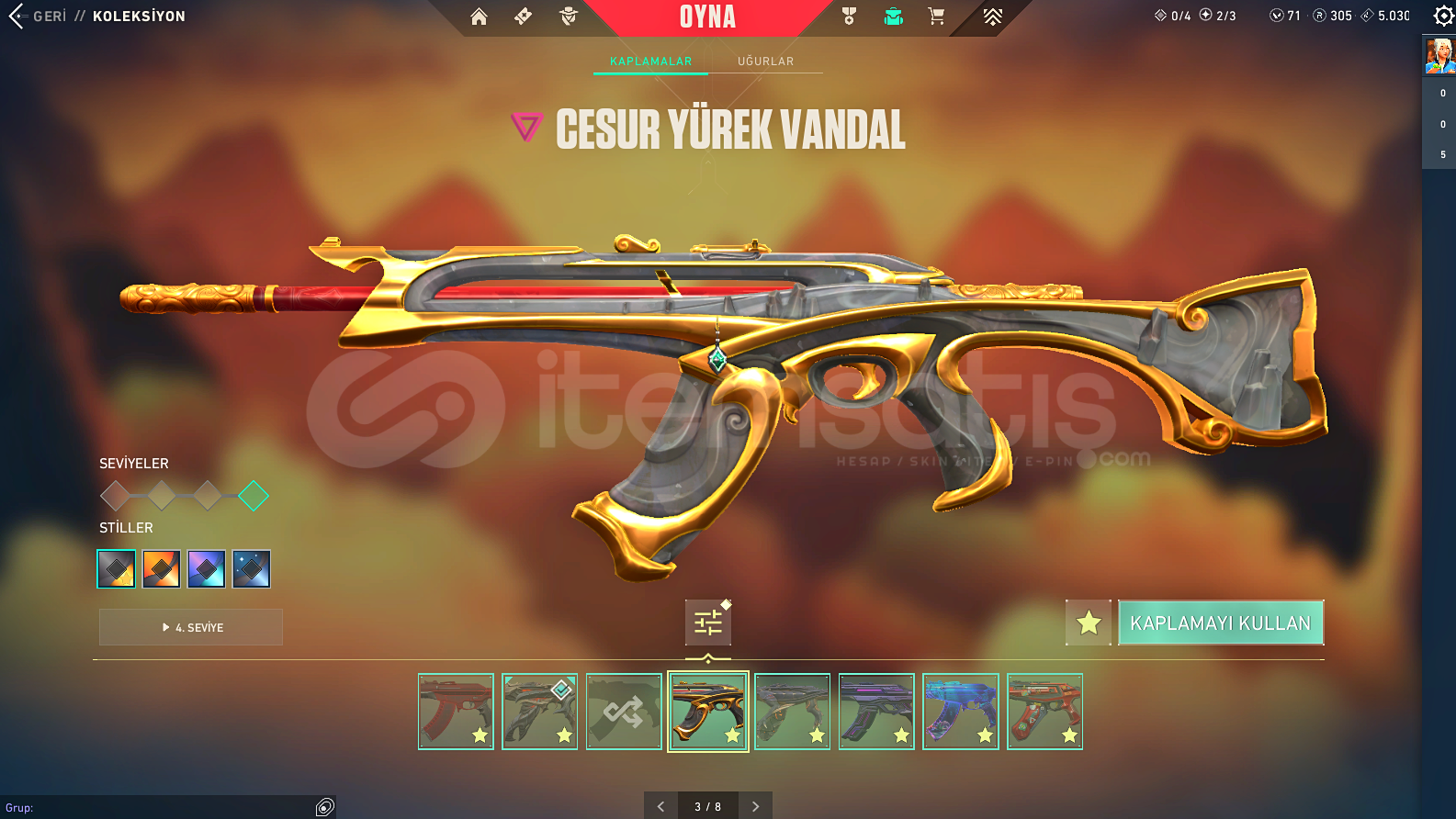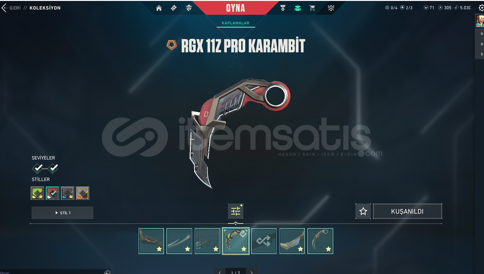 Başlıca SkinlerVandalFelaketin Kalbi VandalCesur Yürek VandalEjder Ateşi VandalExo VandalSürat Canavarı Vandal // +2 adet bp skiniPhantomAsil PhantomÖzel Harekat PhantomOni Phantom // +2 adet bp skiniOPERATÖRSIRÇİÇEĞİ OPERATÖRSHERİFFYağmacı Sheriff // +7 adet bp skiniGHOSTSihirpunk Ghost // +4 adet bp skiniClassicAsil Classic // +6 adet bp skiniEkstralarChampions 25 kupası donatı olanİkililer ...