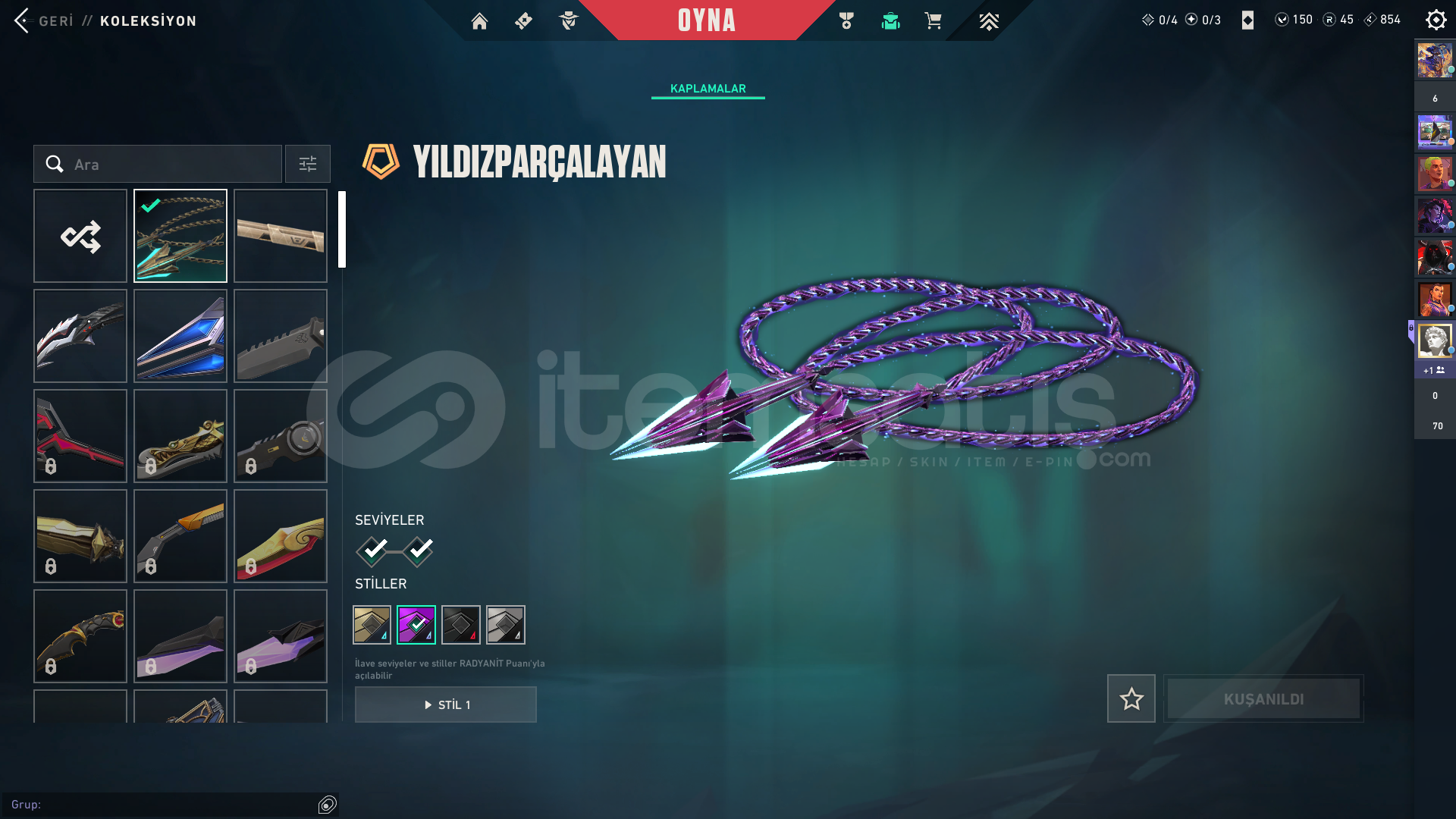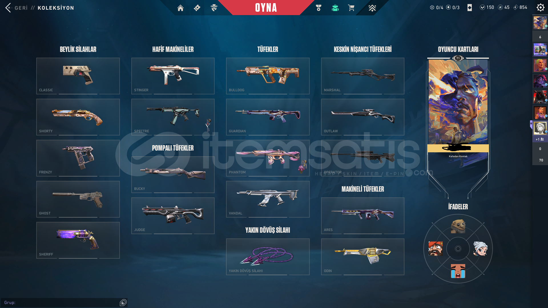 BIÇAK : YILDIZ PARÇALAYAN - ATLAS KMT OP - ECELİN ISIRIĞI - SOLAREX YADİGARIVANDAL : KURONAMİ - ASİL - KAOS - ATLAS KMTPHANTOM : SIRÇİÇEĞİ OPERATÖR : YILDIZ BELASI - YİTİKMARSHALL : ZİFİRİSPECTRE : YAĞMACISHERIFF : SERİ TETİK - ANOMALİODİN : ASİLVE BATTLEPASS SKINLERI HESAP ANLIK 71 SEVİYEDİR.