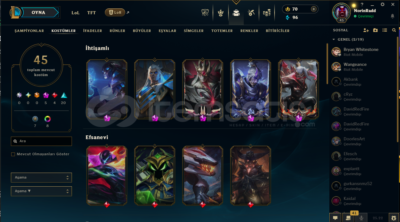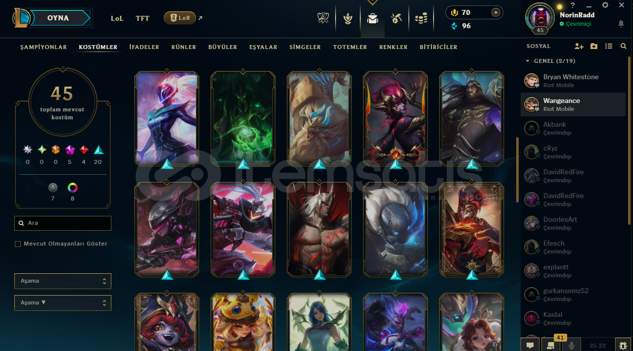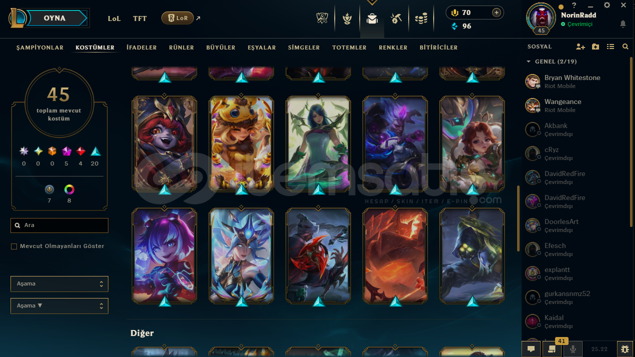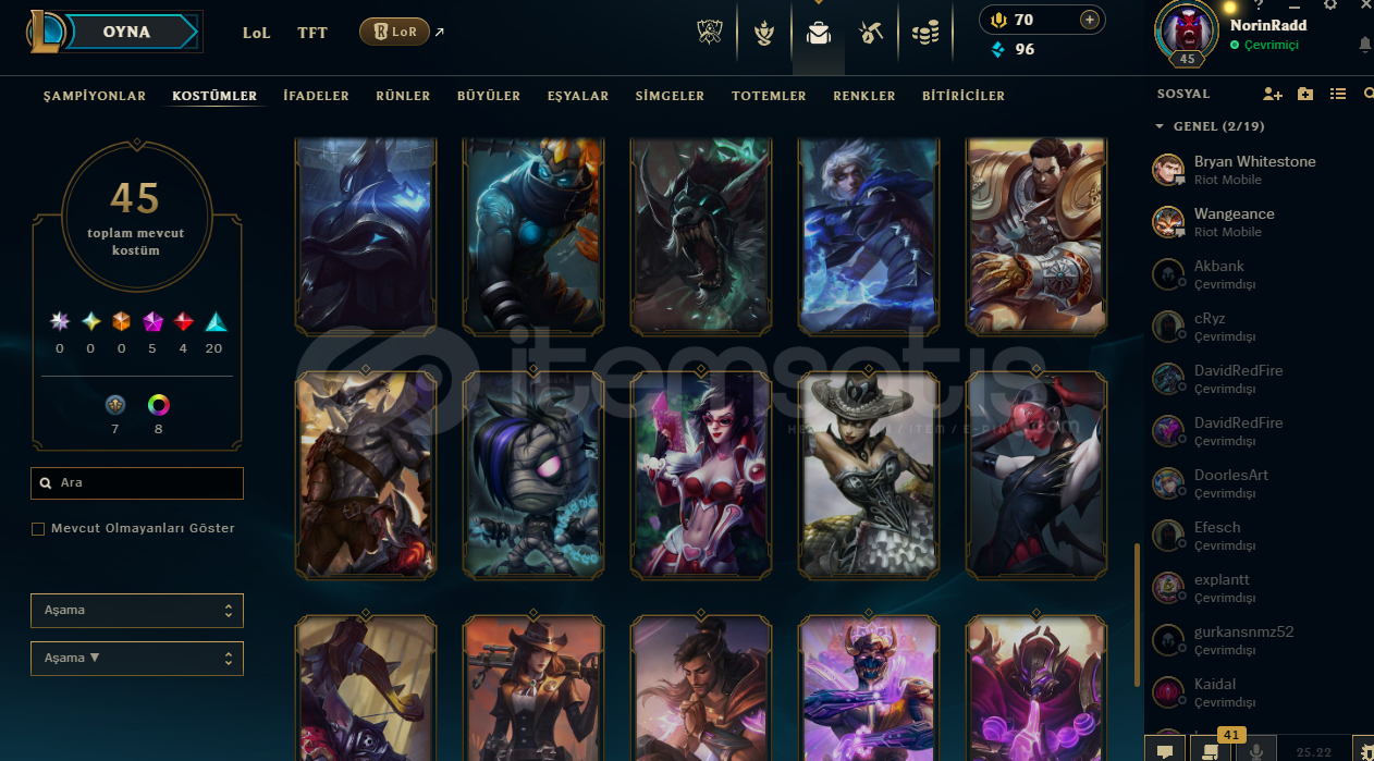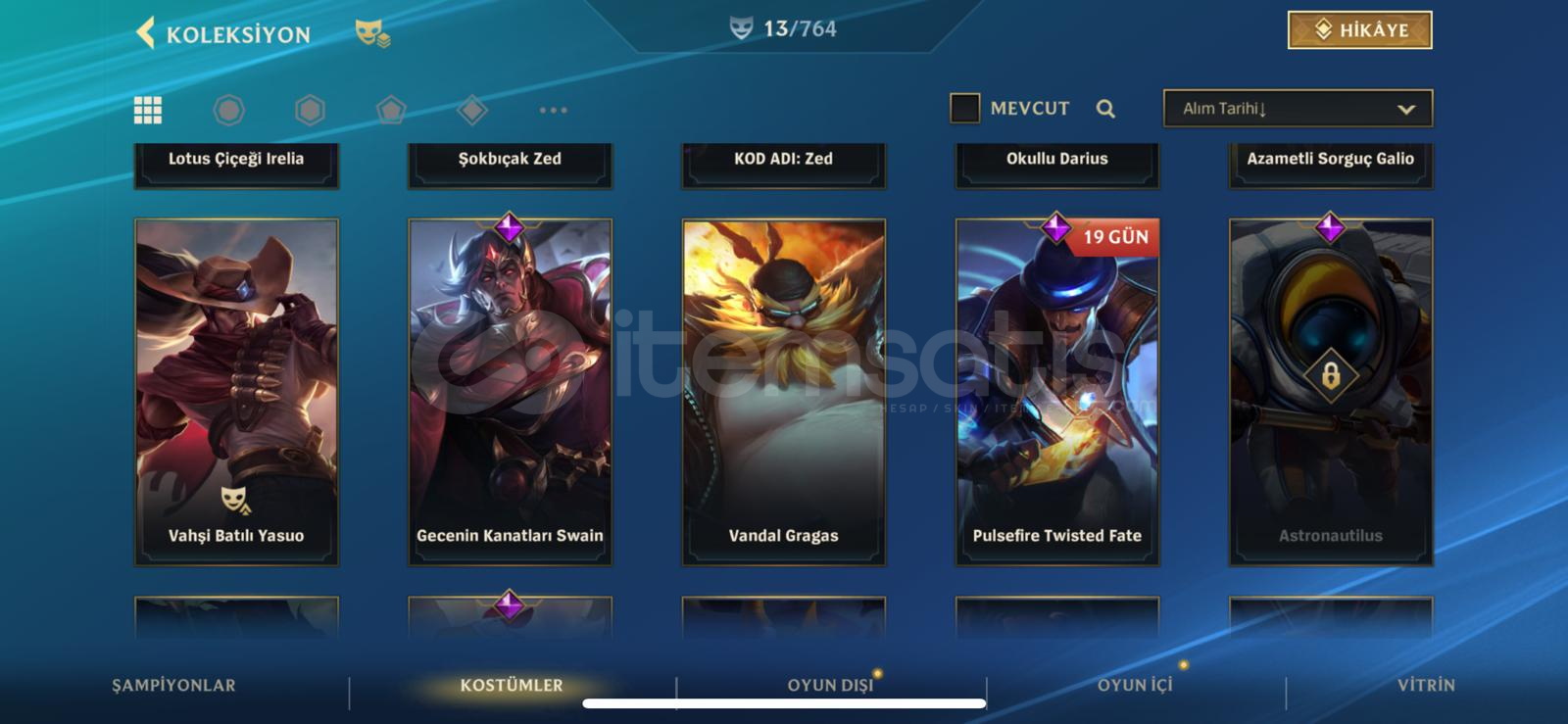 Riot hesabımda hem valorant hem lol hem wild rift oyunlarında güzel skinler mevcut. oyunlardan sıkıldığım için satıyorum. hangi oyunda hangi skinlerim olduğu fotoğraflarda var. lolde battle pass alınmıştır ve yarıya gelinmiştir. wild riftte de güzel kostumler var fakat sınır 10 fotoğraf olduğu için koyamıyorum.