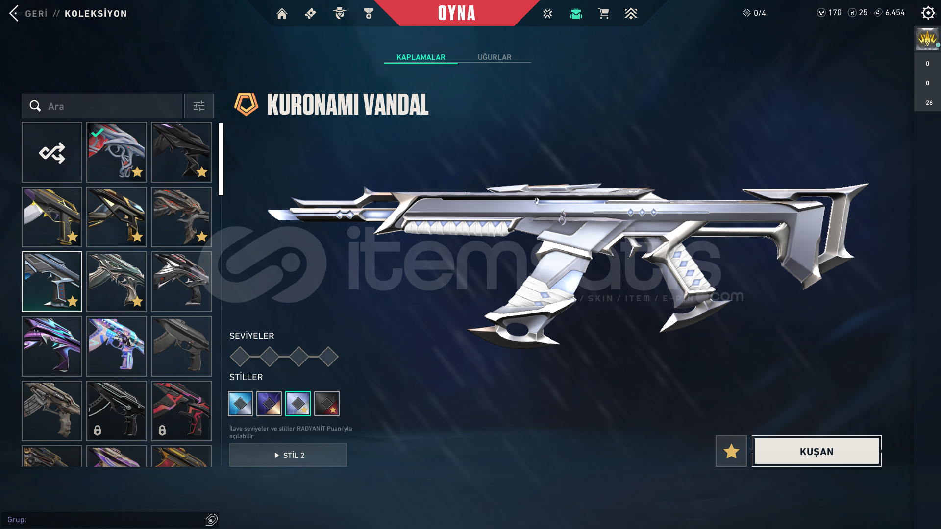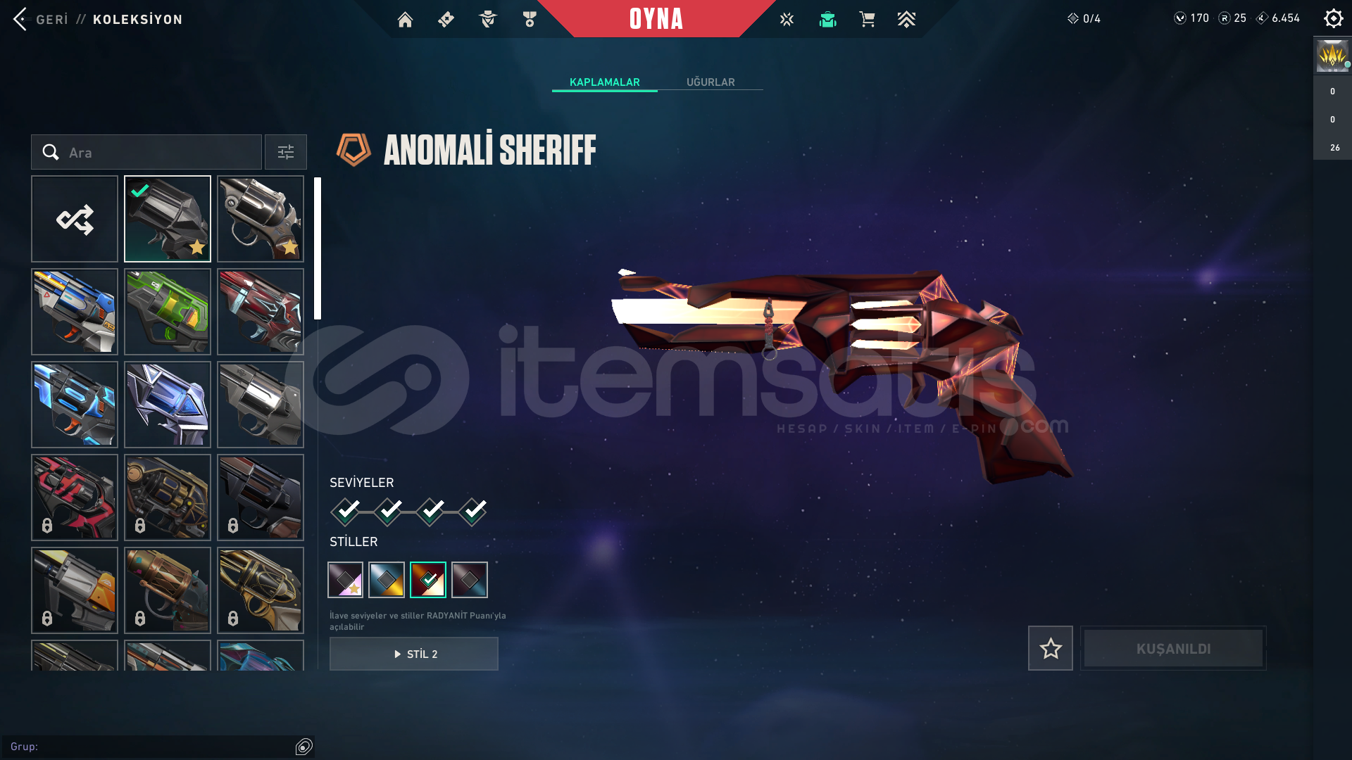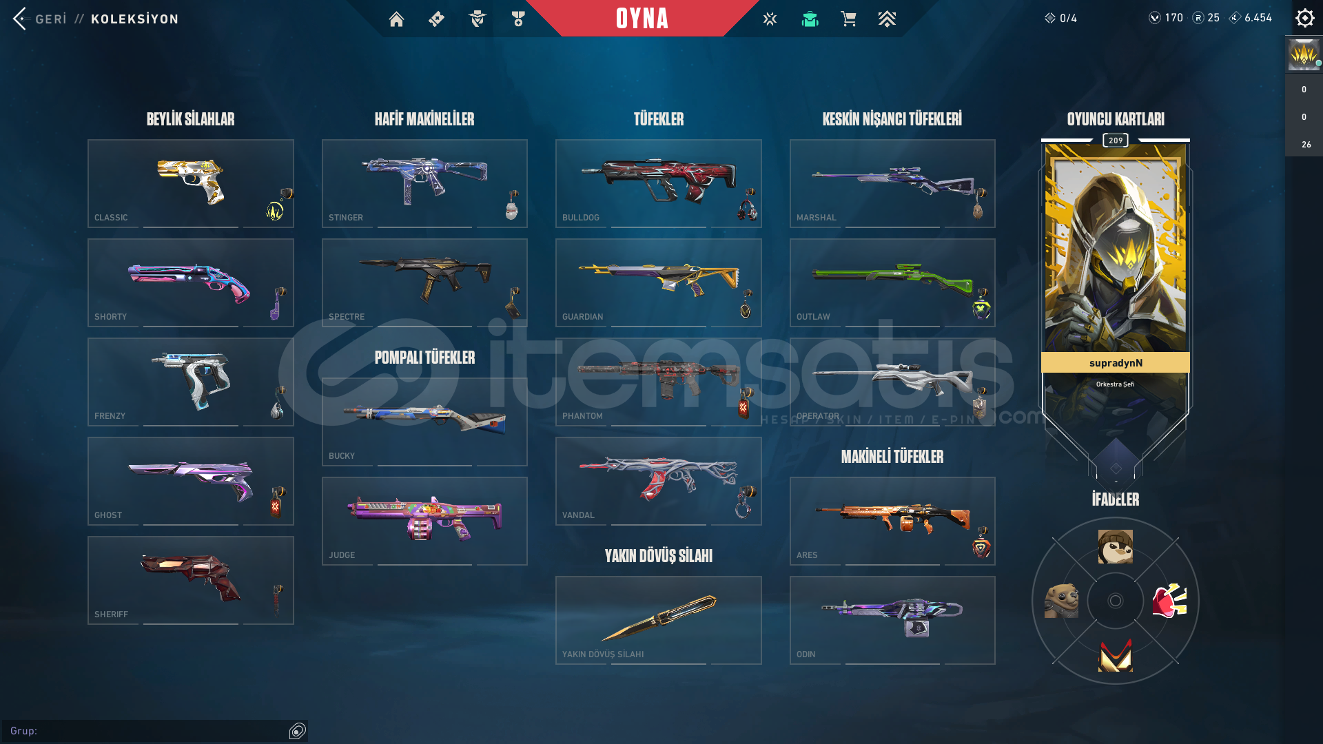 Tüm karakterle açıktır. peak rank dia 2güncel dia 1champions 2025 set7 tane efektli vandal vardır2 tane phantom2 sheriff1 ghost1 operatör1 guardian1 clossic bblvct karambit bıcak, champions 2025 bıcak, rgx 11 pro kelebek, uzaylı avcısı bıçak mevcuttur.