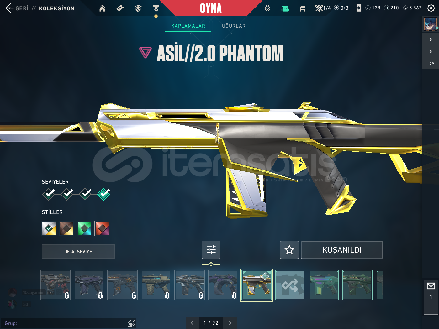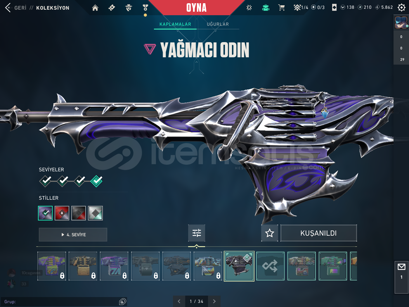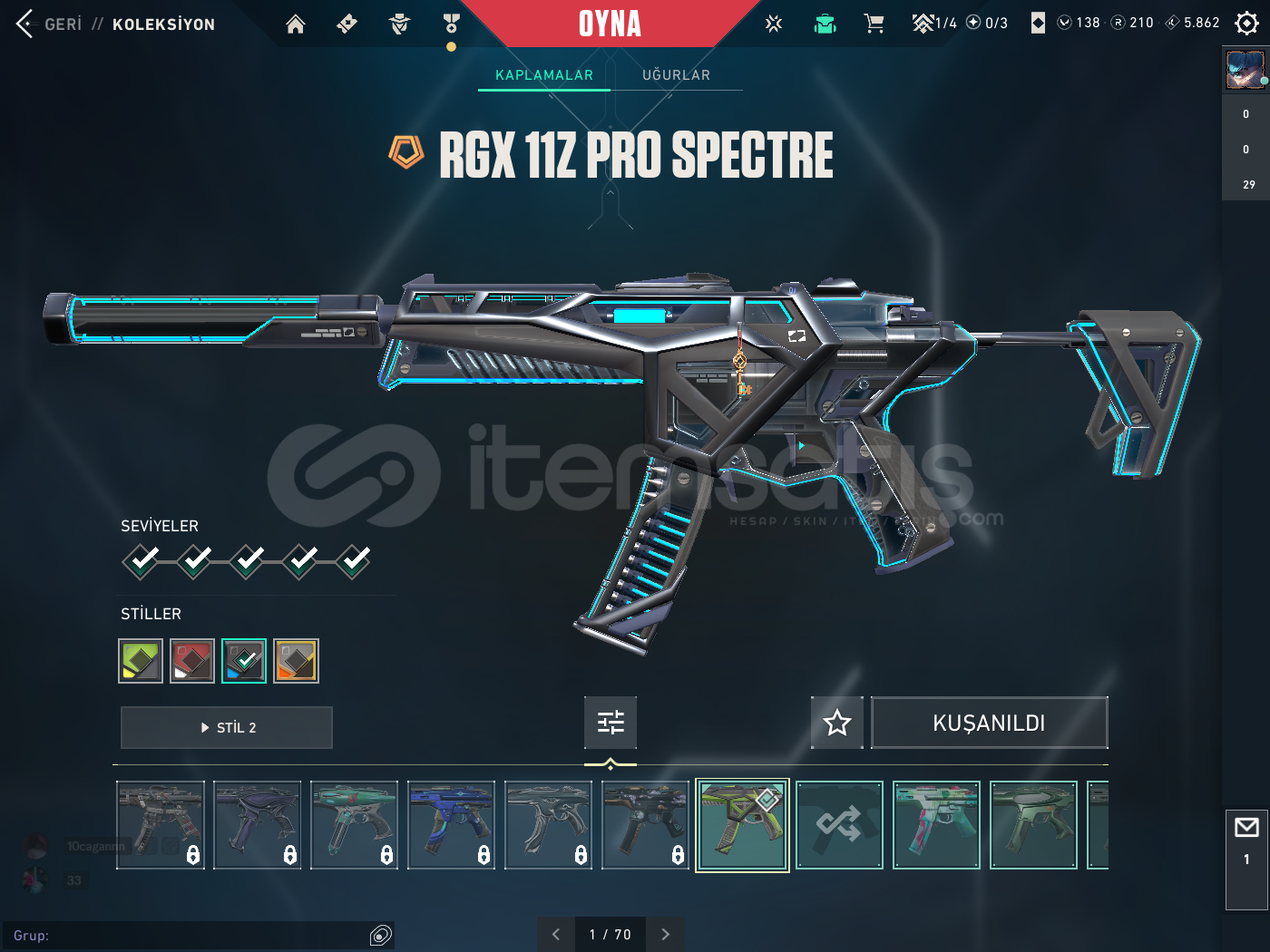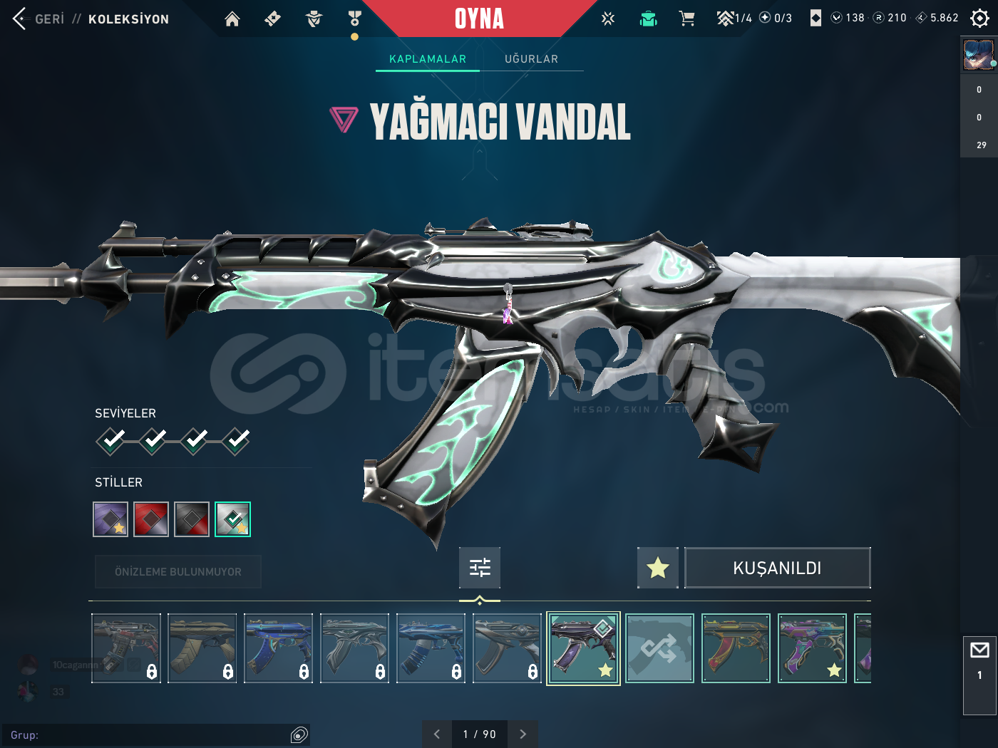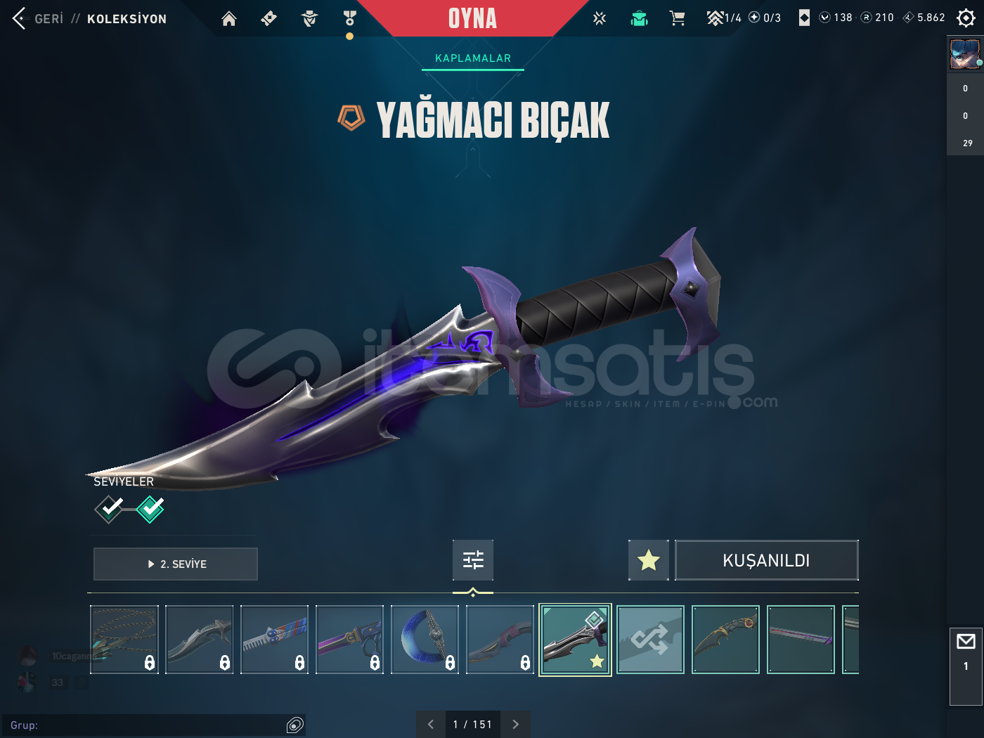 Hesap benim hesabımdır dopdoludur hiç bir riski yokturResimdekinden daha çok skin mevcut Max elmas 2 görmüşYağmacı delipop ve köken vandal vardır rgx spectre mahvolmuş kralın kılıcı gibi skinlerde mevcutBirçok sezonun battlepassi vardirAltın afet hançer vardır