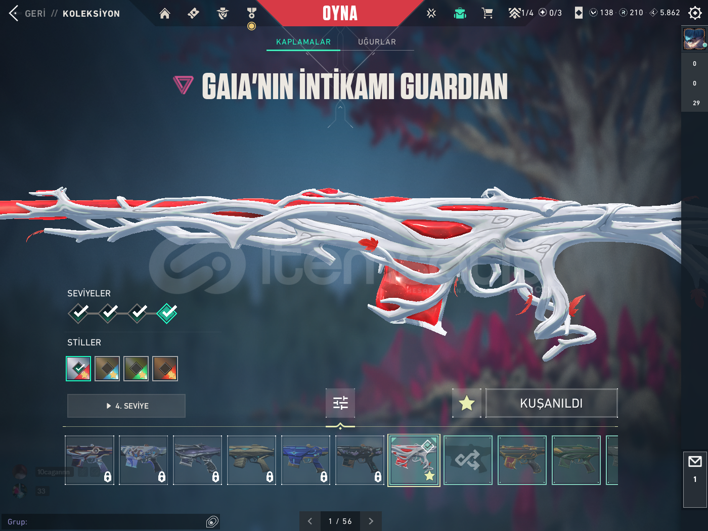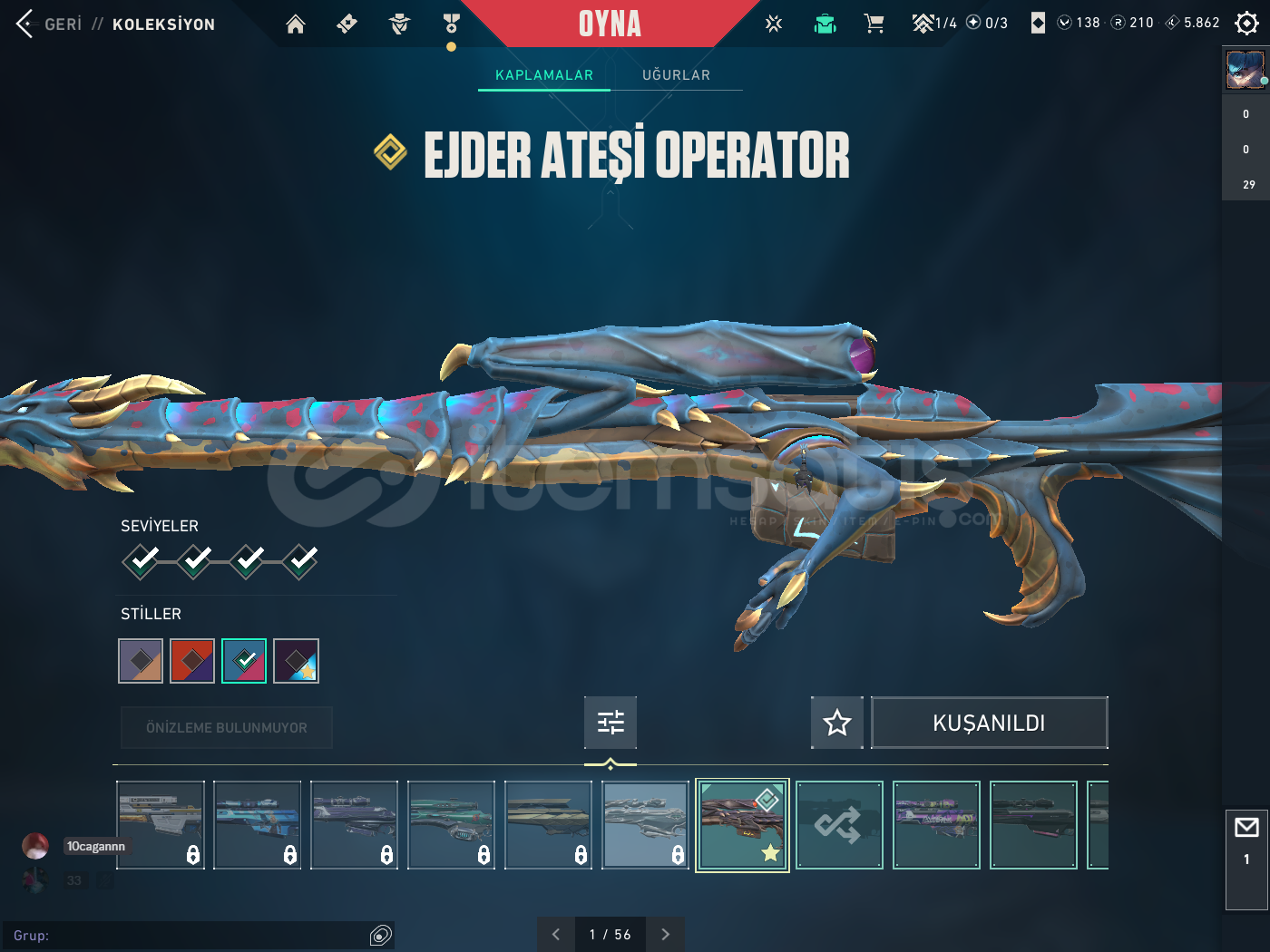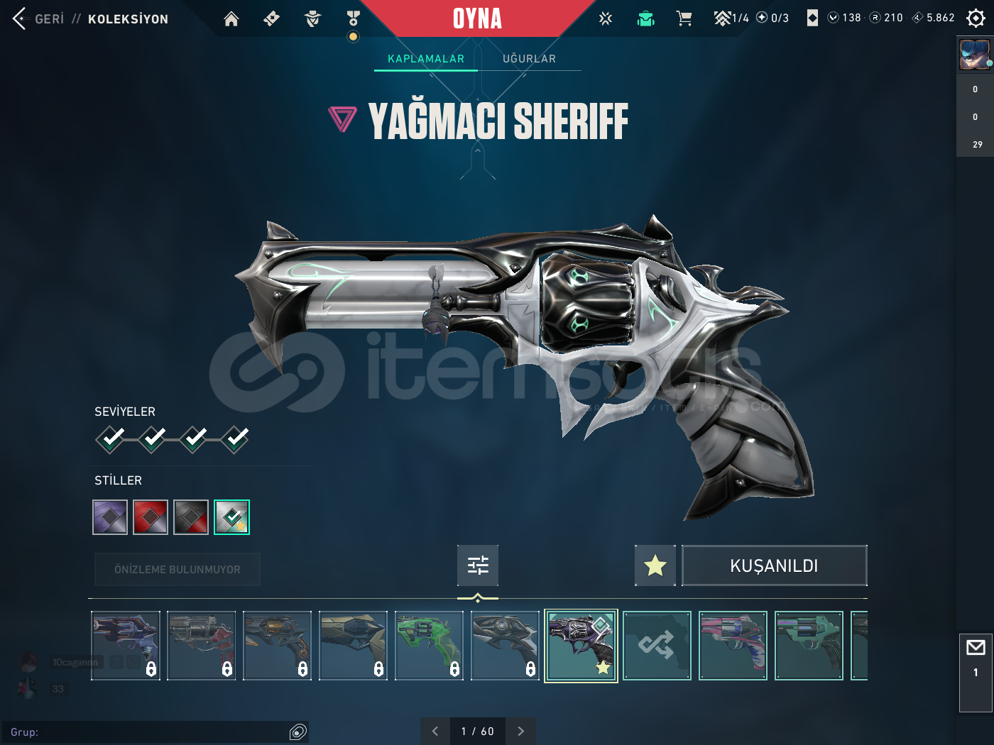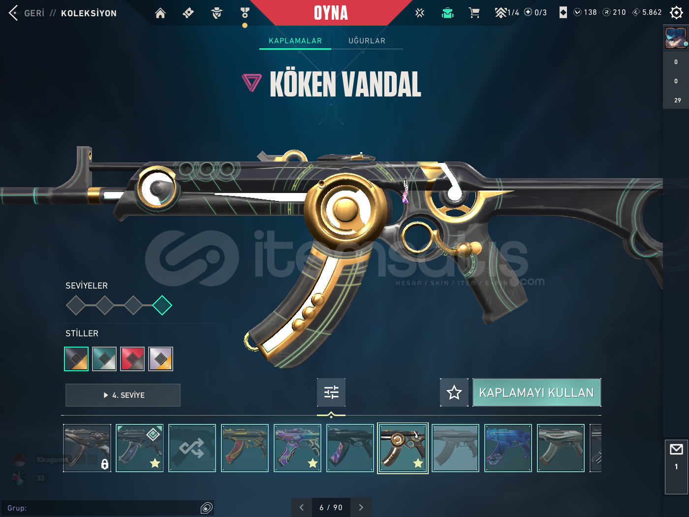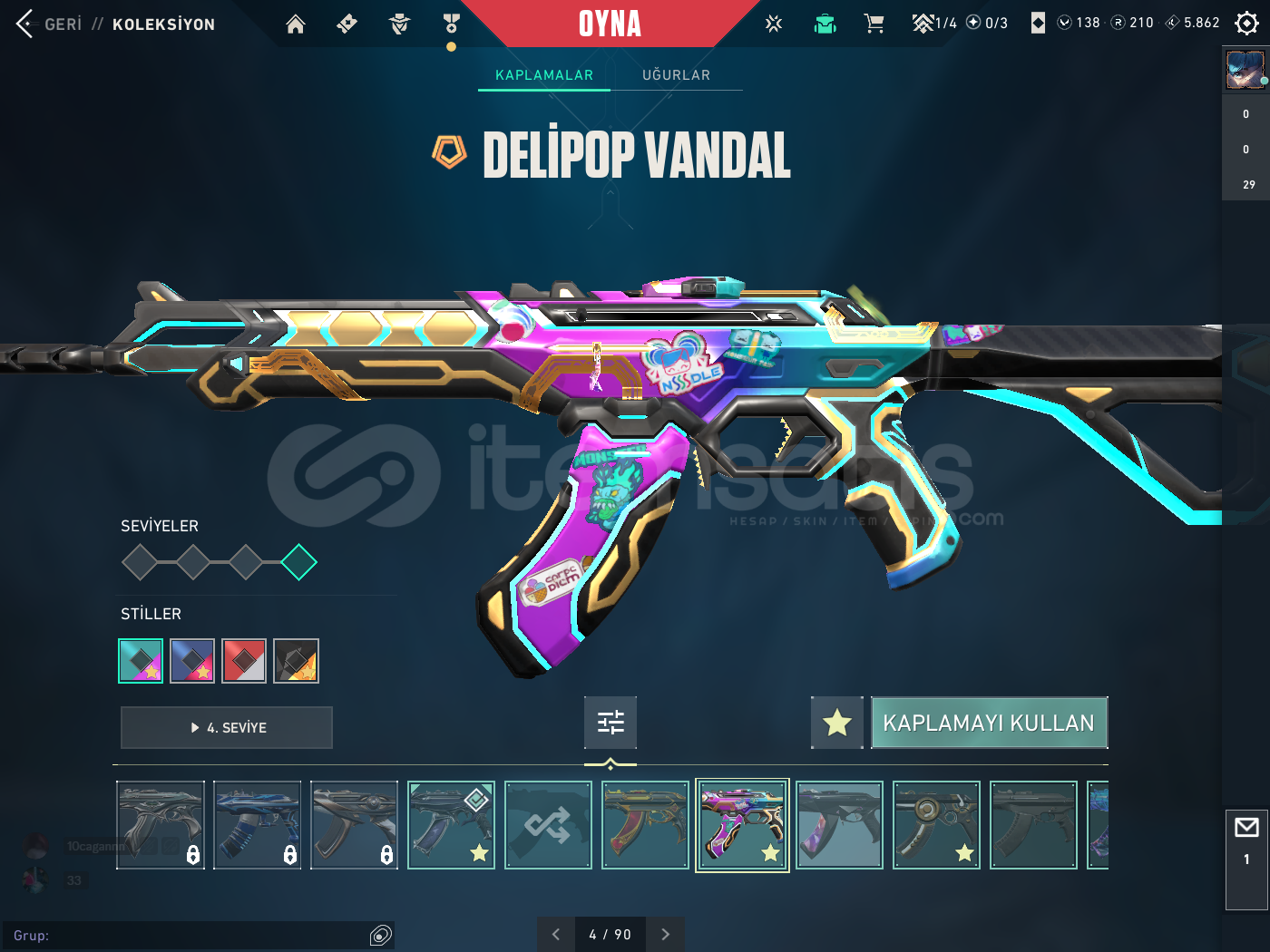 Hesap benim hesabımdır dopdoludur hiç bir riski yokturResimdekinden daha çok skin mevcut Max elmas 2 görmüşYağmacı delipop ve köken vandal vardır rgx spectre mahvolmuş kralın kılıcı gibi skinlerde mevcutBirçok sezonun battlepassi vardirAltın afet hançer vardır