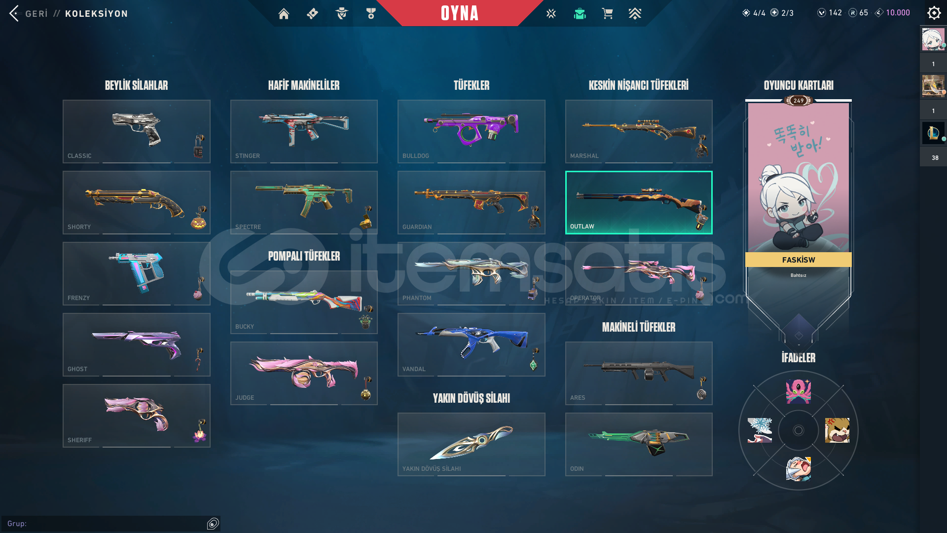 oyunu bıraktığım için satıyorum hesabı yoksa satmak istemem heapta çok fazla şey vardır HESAPTA: -sır çiçeği seti-5 vandal -3 bıçak -ve ulupençe ghost vardır SADECE CİDDİ ALICILAR YAZSIN LÜTFEN ALICAK OLAN VARSA YADA YAZAN AKŞAM 7 DEN SONRA CEVAP VEREBİLİRİM