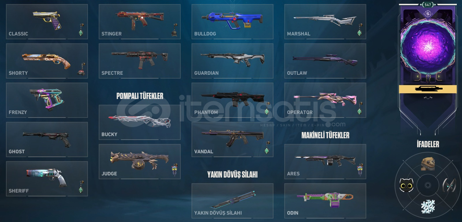 Bilgisayarımı sattığım için oyun hesabımı da satmak istiyorum.Hesapta 20 Vandal 10 tane phantom vardır. Çok sayıda savaş bileti açtım.Dolu dolu güzel hesap alan arkadaşı üzmez.Video ' da kaos shorty sonrada aldığım için yoktur şuan hesapta içiniz rahat olabilir.VandalKaos , Arcane , Asil , Cyrax , Delipop , Ejder , Evori , Exo , Felaketin Kalbi , Gaia , Işık...