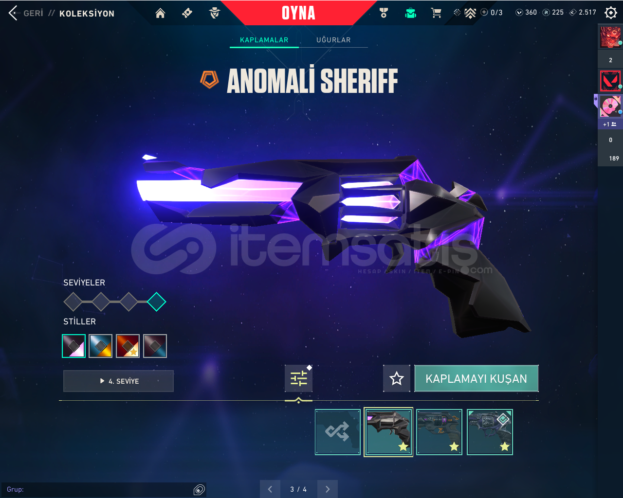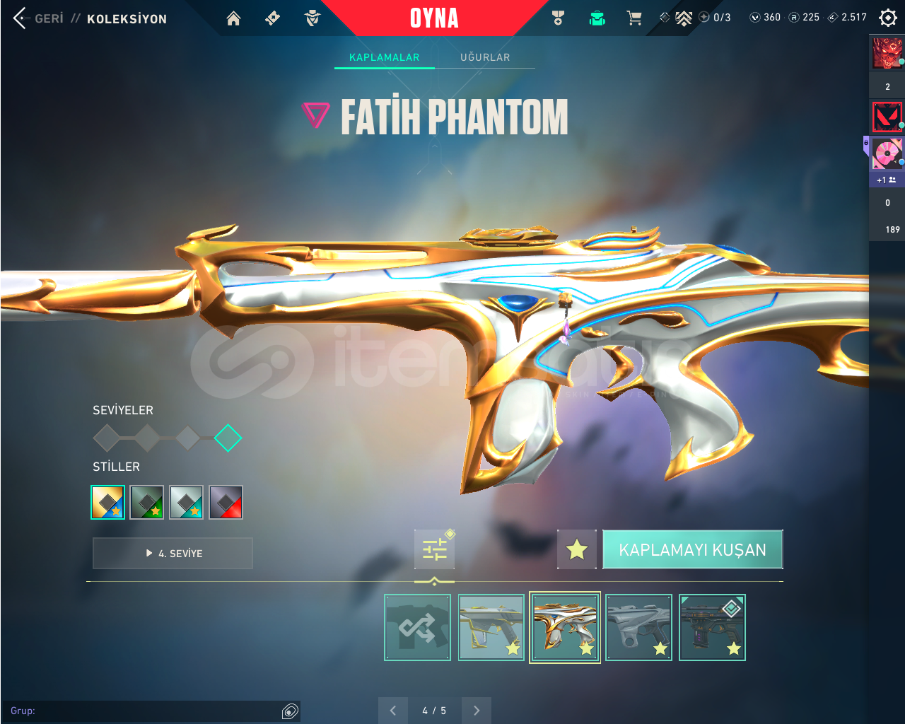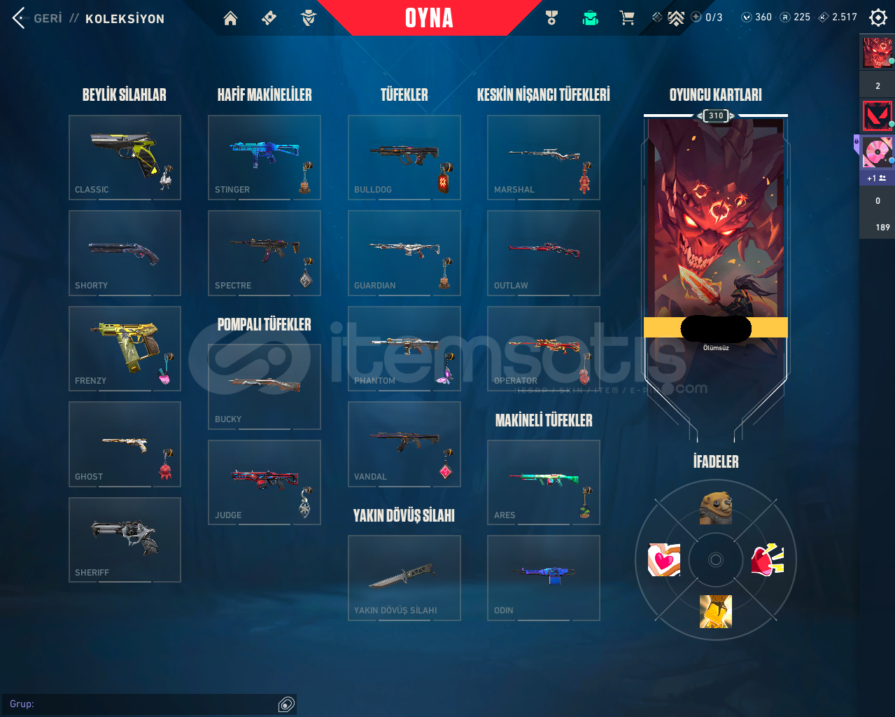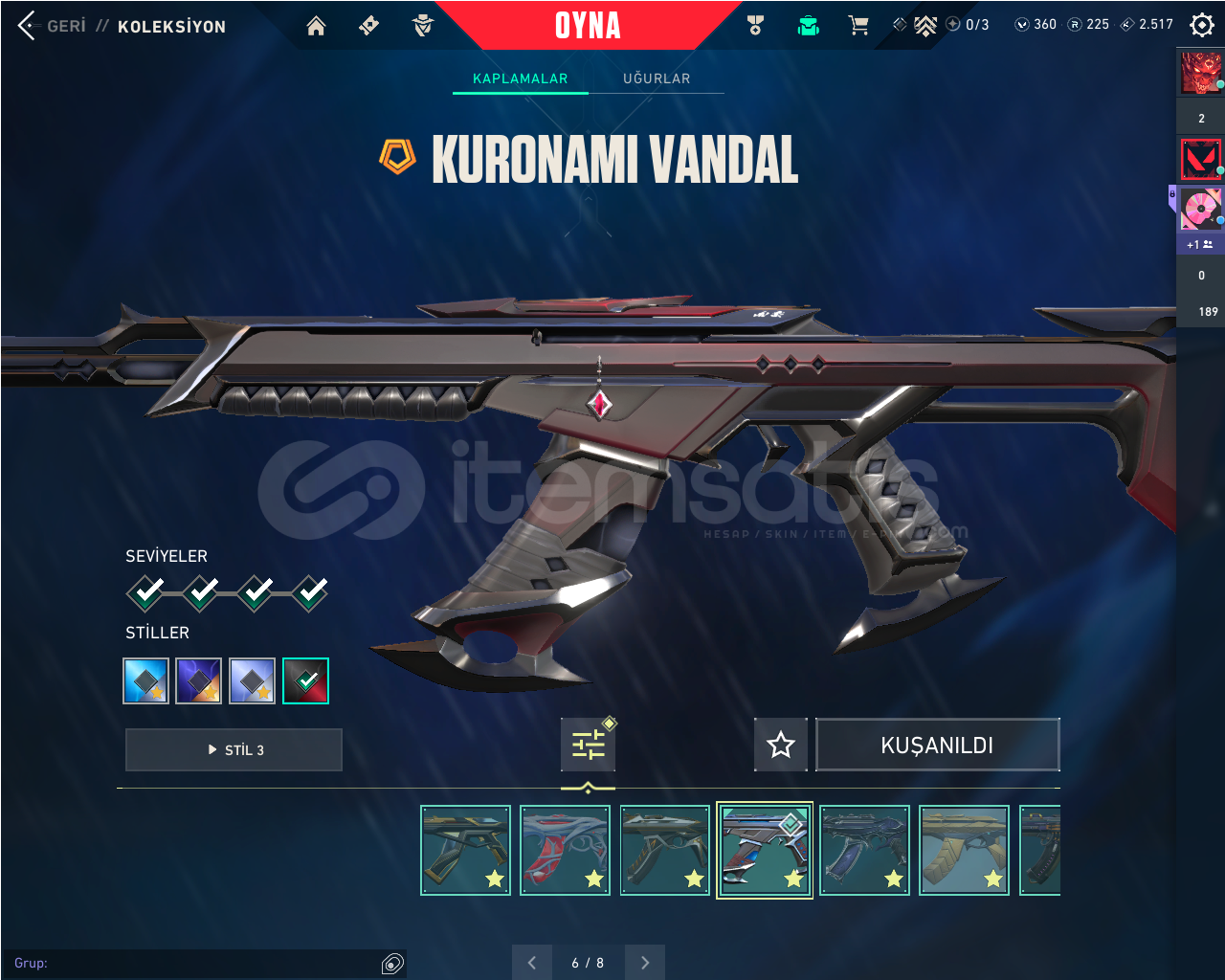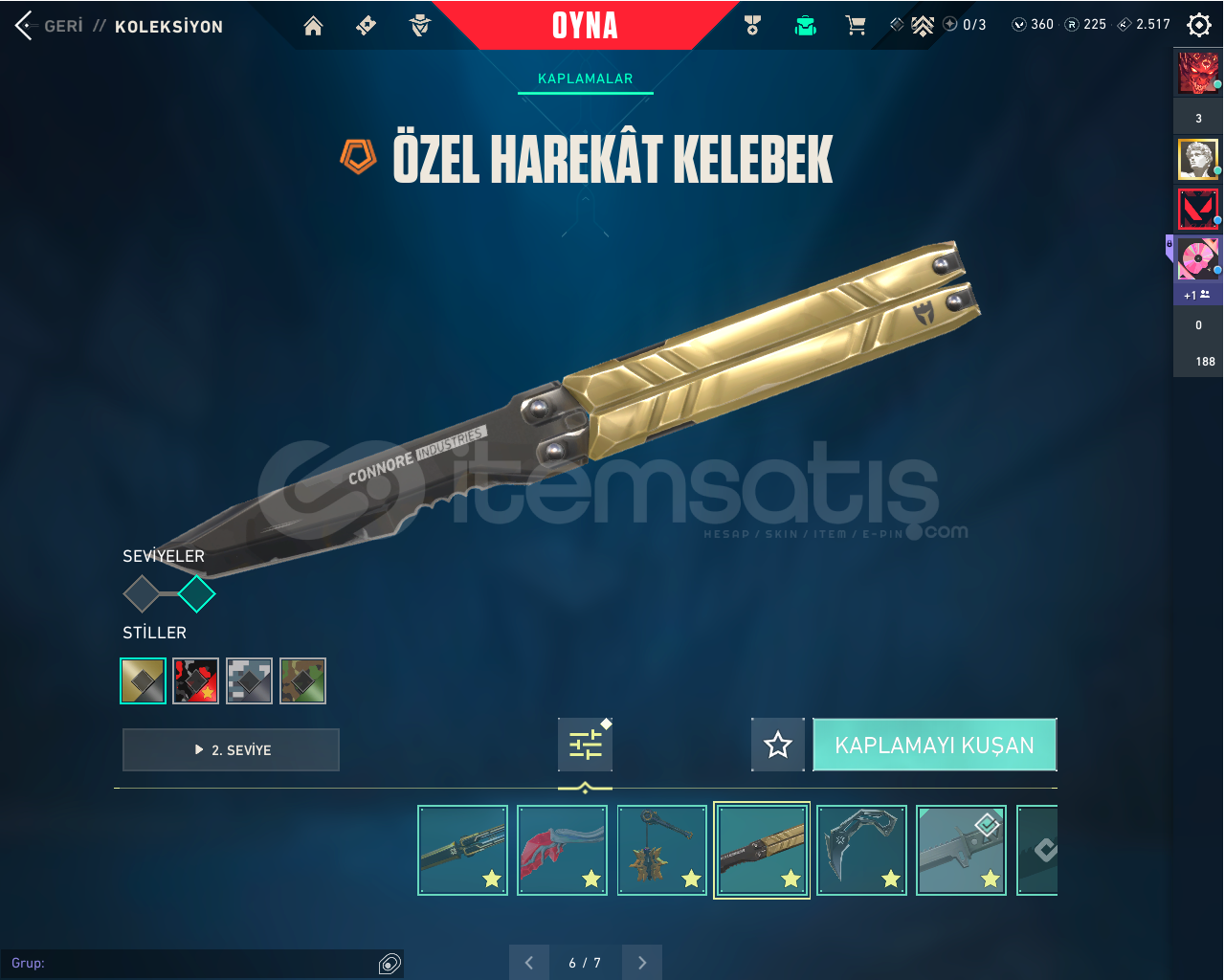 Bıçaklar: UZAYLI AVCISI, 2025 KELEBEK, 2025 VCT KARAMBİT, GAİANIN GAZABI,KAOS GÜRZÜ,ÖZEL HAREKAT KELEBEKVANDALLAR: KAOS, KURONAMİ, YAĞMACI , YILDIZ BELASI , IŞIK MUHAFIZLARI , GAİA, CHAMPİONS 2025PHANTOMLAR: İYON, ASİL ,FATİH, KAOSSHERİF: YAĞMACI, ANOMALİ , KAOSGHOST: FATİHCLASİC: ASİLSPECTERE : KAOS BULDOG: KAOS OPERATÖR: EJDERİN BUYRUĞURANK İMMO 1