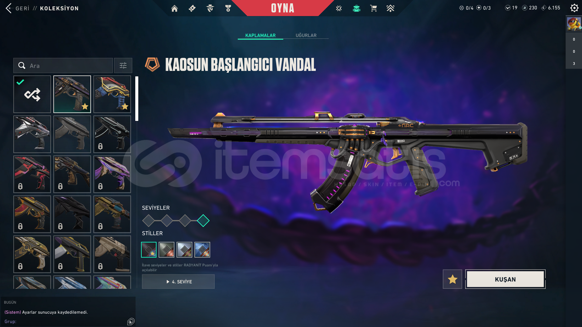 Hesaptaki skinler;KAOS VANDALONİ VANDALSİHİRPHUNK PHANTOM HIEROSCAPE BLADESBYTESHİFT KNİFEHesap benim tarafımdan teslim edilir E-postayı siz dilediğiniz gibi değiştirebilirsiniz Sorunsuz satıldıktan sonra tüm sorunlar size aittir Hesap sorunsuzdur