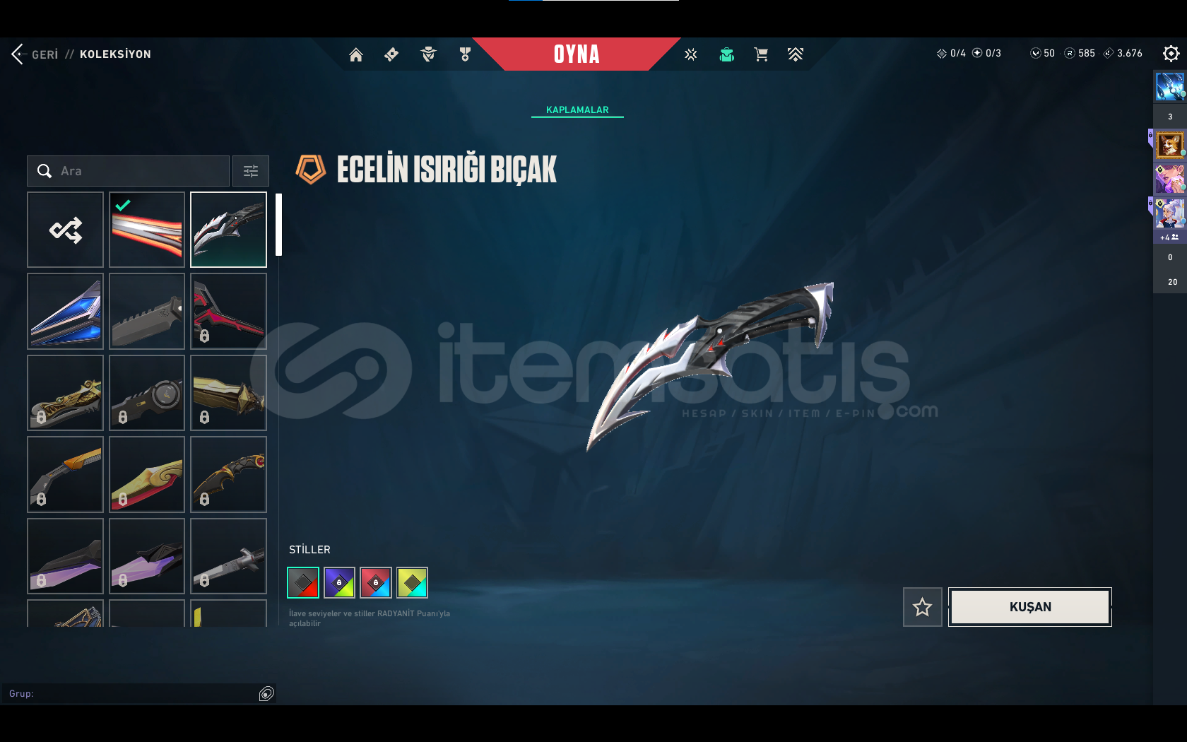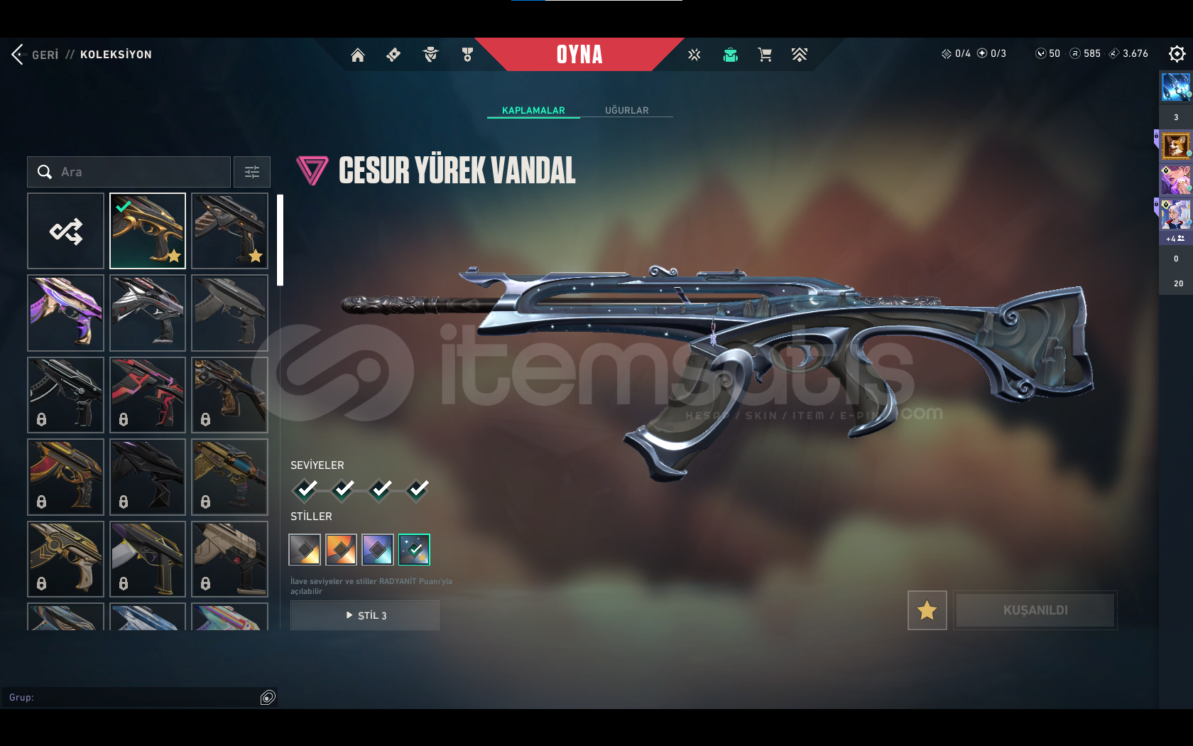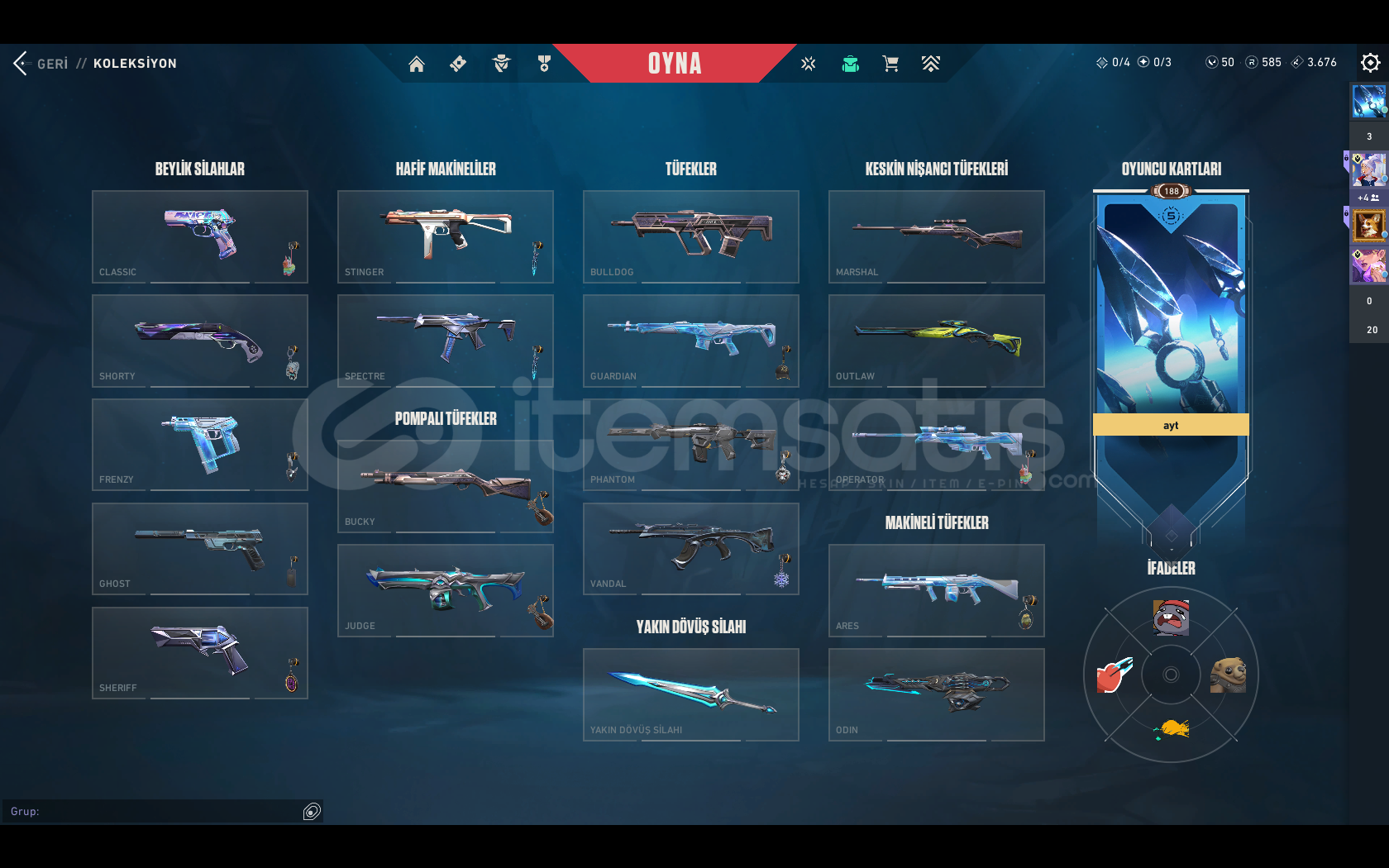 Fiyatda pazarlık yapabiliriz.Hesaptaki Skinler;-Cesur Yürek Vandal-Faz Koruyucu Vandal-Protokol 781-A Phantom-Yıkım Elçisi OdinBıçaklar;-Galaksi Muhafızı Kılıç -Ecelin Isırığı Bıçak-Solarex YadigarıAçıklama;-Ayrıca hesapta 3 tane savaş bileti açılmıştır onlardan gelen birçok skinde mevcutdur. Hesapta birçok oyuncu kartı, ü...
