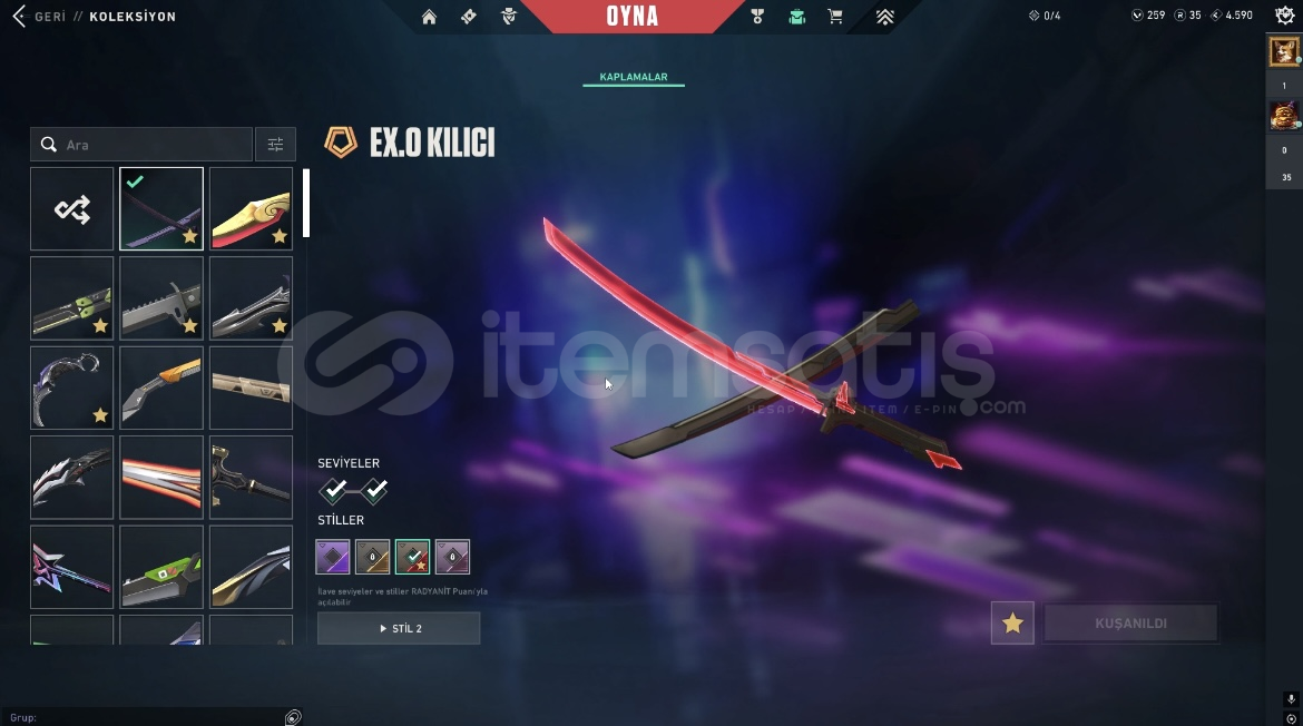 Hesapta battlepass skinleri dışında 40 tane skin, donatlar ve onlarca kart vardır