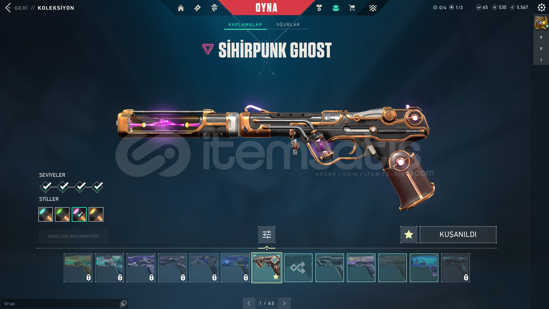 Hesaptaki Önemli Skinler:Phaseguard VandalRecon BalisongBlastX PhantomInterhelm SwordOrigin Crescent BladeReaver SheriffGravitational Uranium Neuroblaster ClassicPrime VandalReaver VandalIon PhantomForsaken SpectreMagepunk Ghost📌 Teslimat⚡Aktif olmamı beklemenize gerek yok! 7/24 otomatik teslimatla lazım olan tüm bilgilere anında ulaşacaksınız!🔐 Teslimat : ( Riot games bağlı Hesap: , Mail: ) şeklinde!🔒 G&uu...