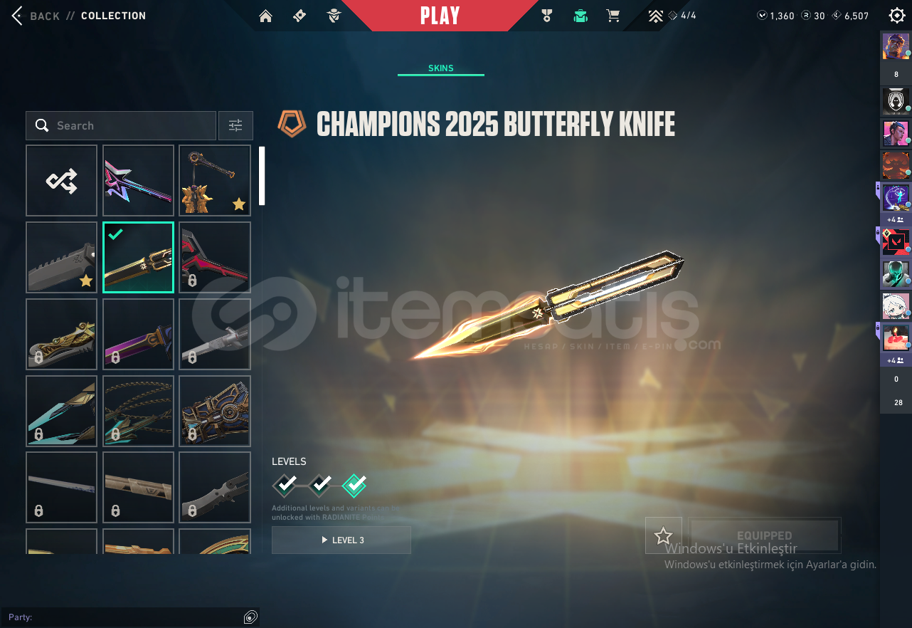 🎉🎉Bölge: TRSeviye: 70Kademe: Diamond 3VP: 1360Radyanit: 30Skinler;Champions 2025 KelebeğiChampions 2025 VandalKaos BıçakDolmir'in İntikamı VandalKaos PhantomKaos SheriffKaos SpectreYıldız Belası GuardianSezon 2025 Kısım 6 BattlePass Tamamlandıve 10 Adet Battle Pass SkinSatın alıp tüm işlemleri bitirip hesabı üstünüze aldığın...