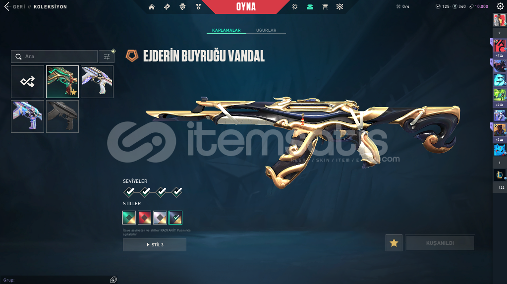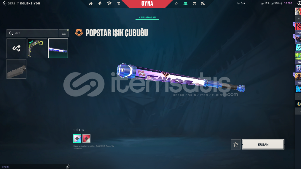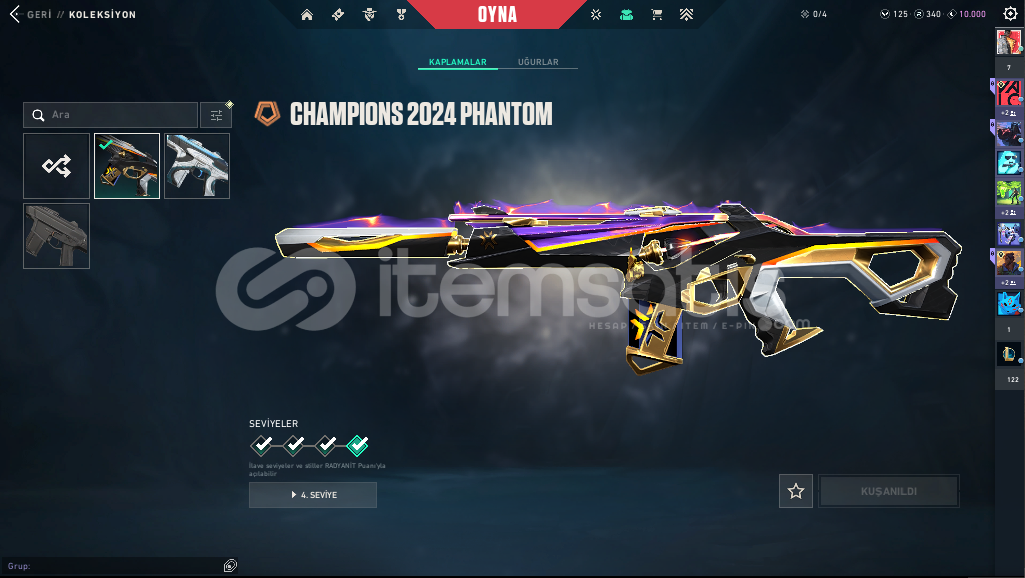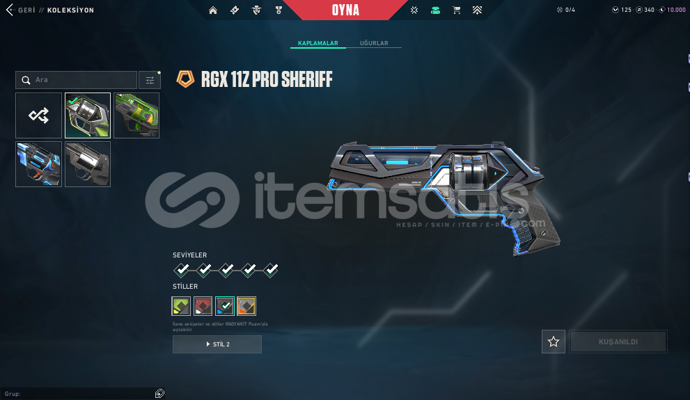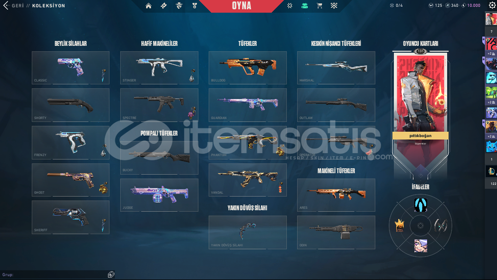 Hesapta bulunan kayda değer skinler:Evorî Rüyakanatlar VandalEjderin Buyruğu VandalChampions PhantomRGX SheriffRGX KarambitPopstar Işık ÇubuğuBunlara ek olarak Üstün ve Özel serileri bazı skinler de hesapta mevcvuttur fakat saydığım ve görselde gözüken skinleri baz alarak hesabı alınız.Skin kalitesi yüksek, koleksiyon değeri olan bir hesaptır. Alıc&#...