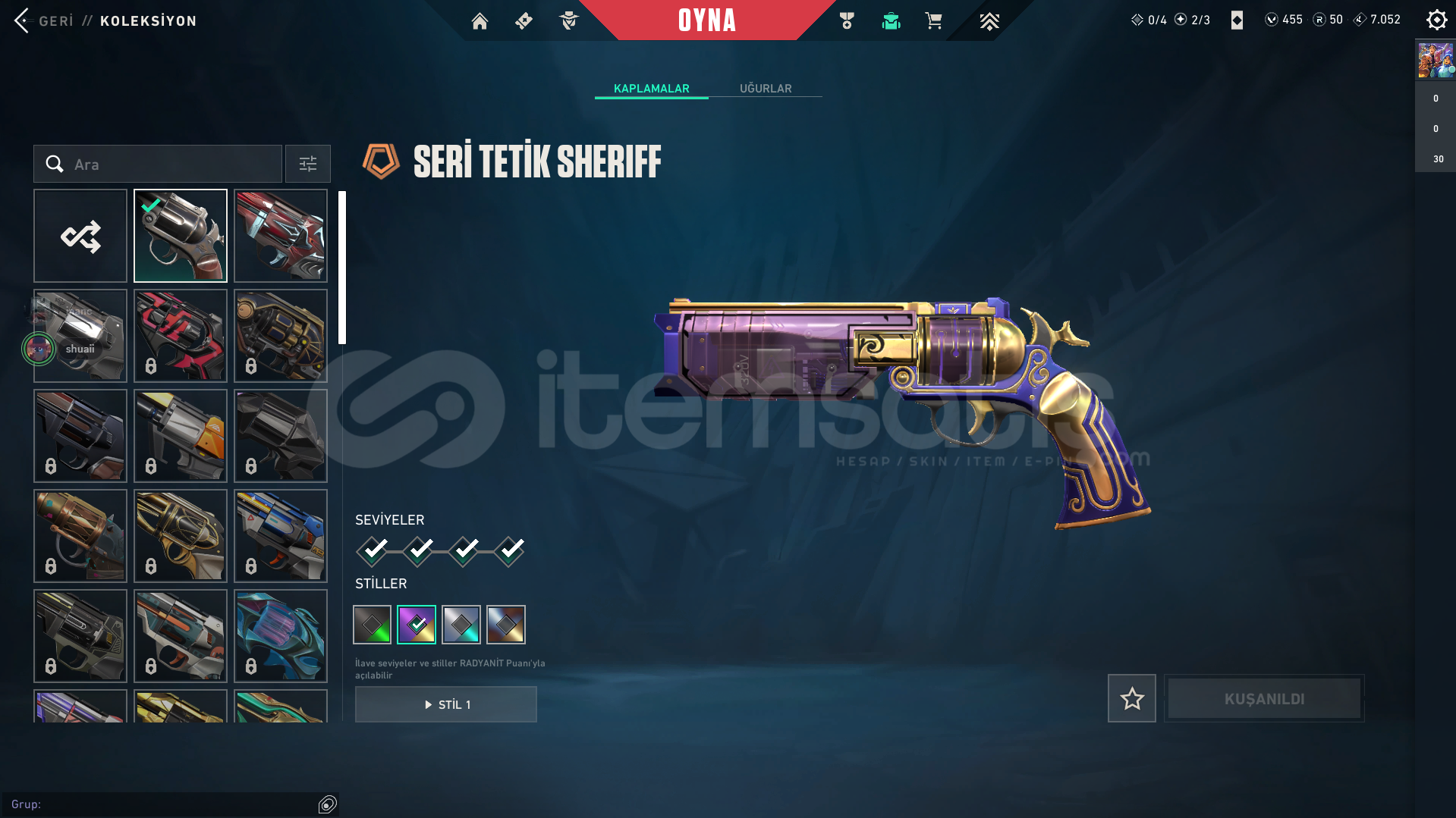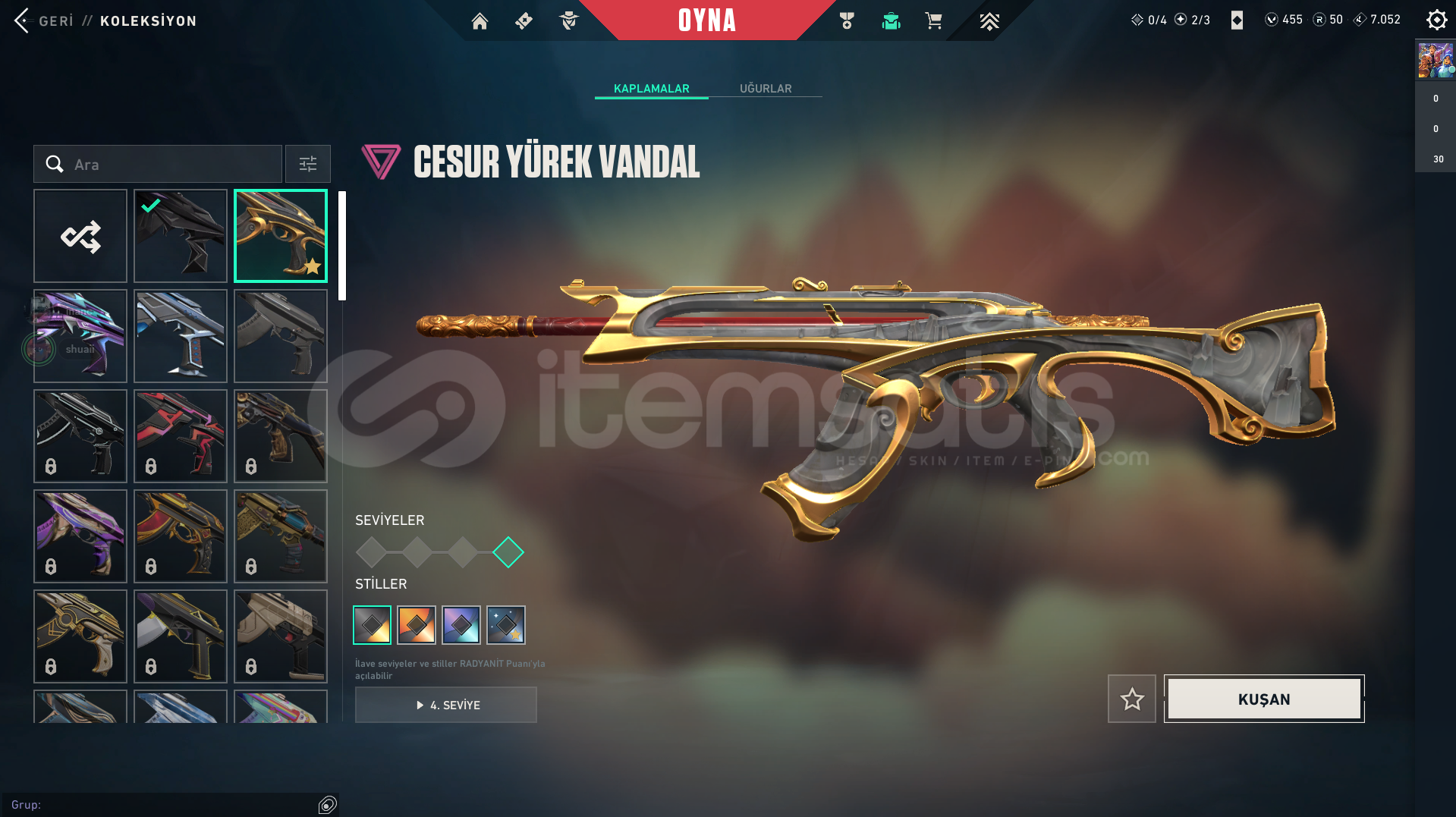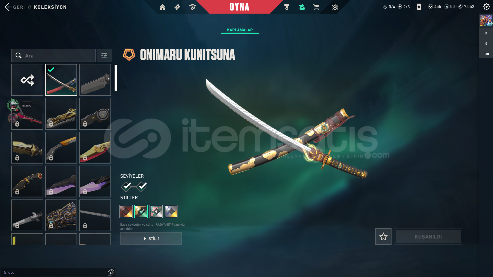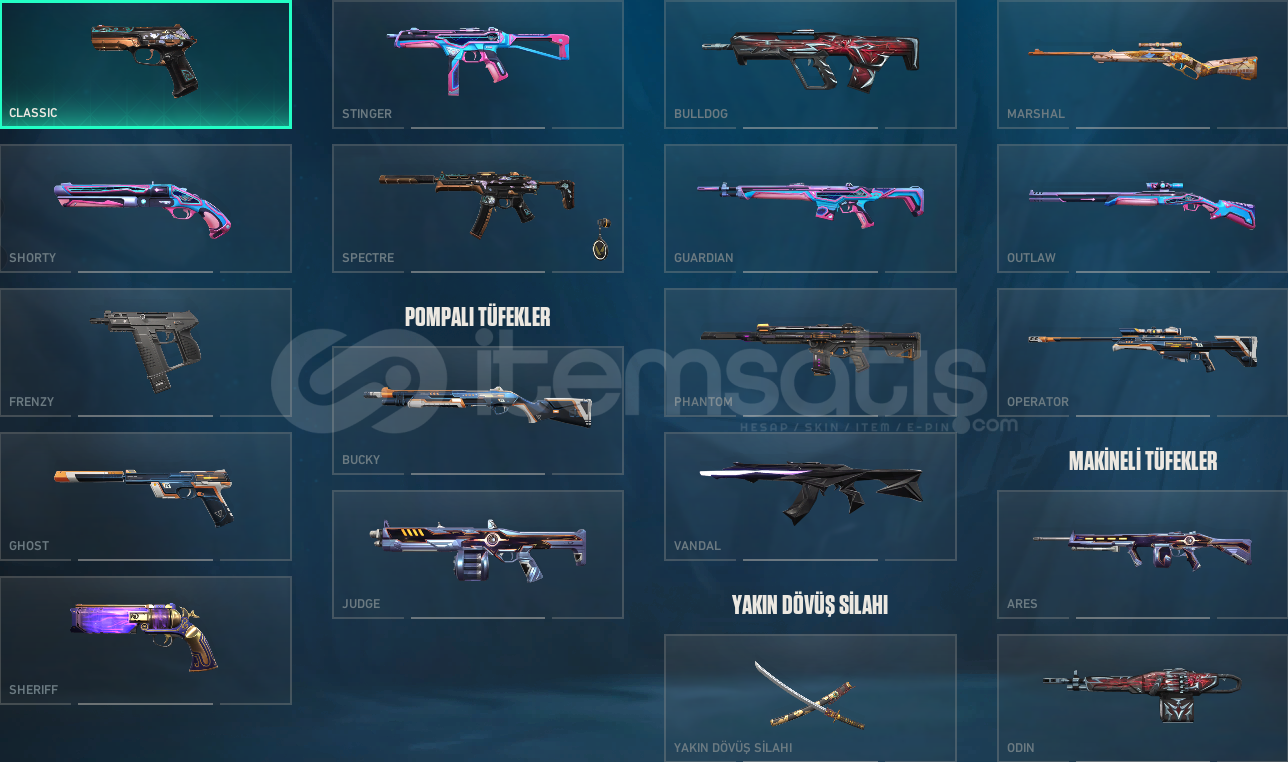Hesapta:Seri Tetik SheriffKaosun Başlangıcı PhantomYağmaacı PhantomAnomali VandalCesur Yürek VandalKuronami VandalOnimaru Kunitsuna KatanaEk olarak Battlepass bulunmaktadır.Hesapta herhangi bir sorun yoktur. Eğer bir sorun olursa 7/24 destek sağlanır. Pazarlık vardır. Alıcısına hayırlı olsun.