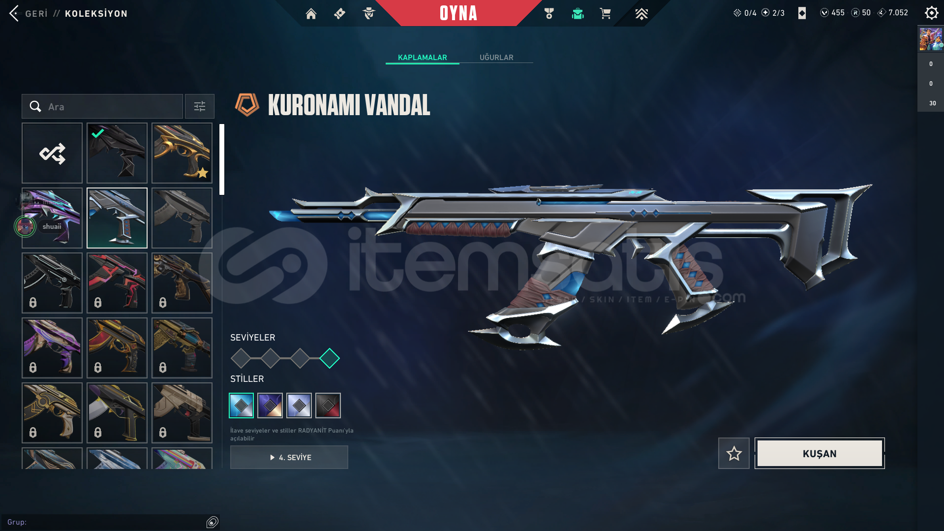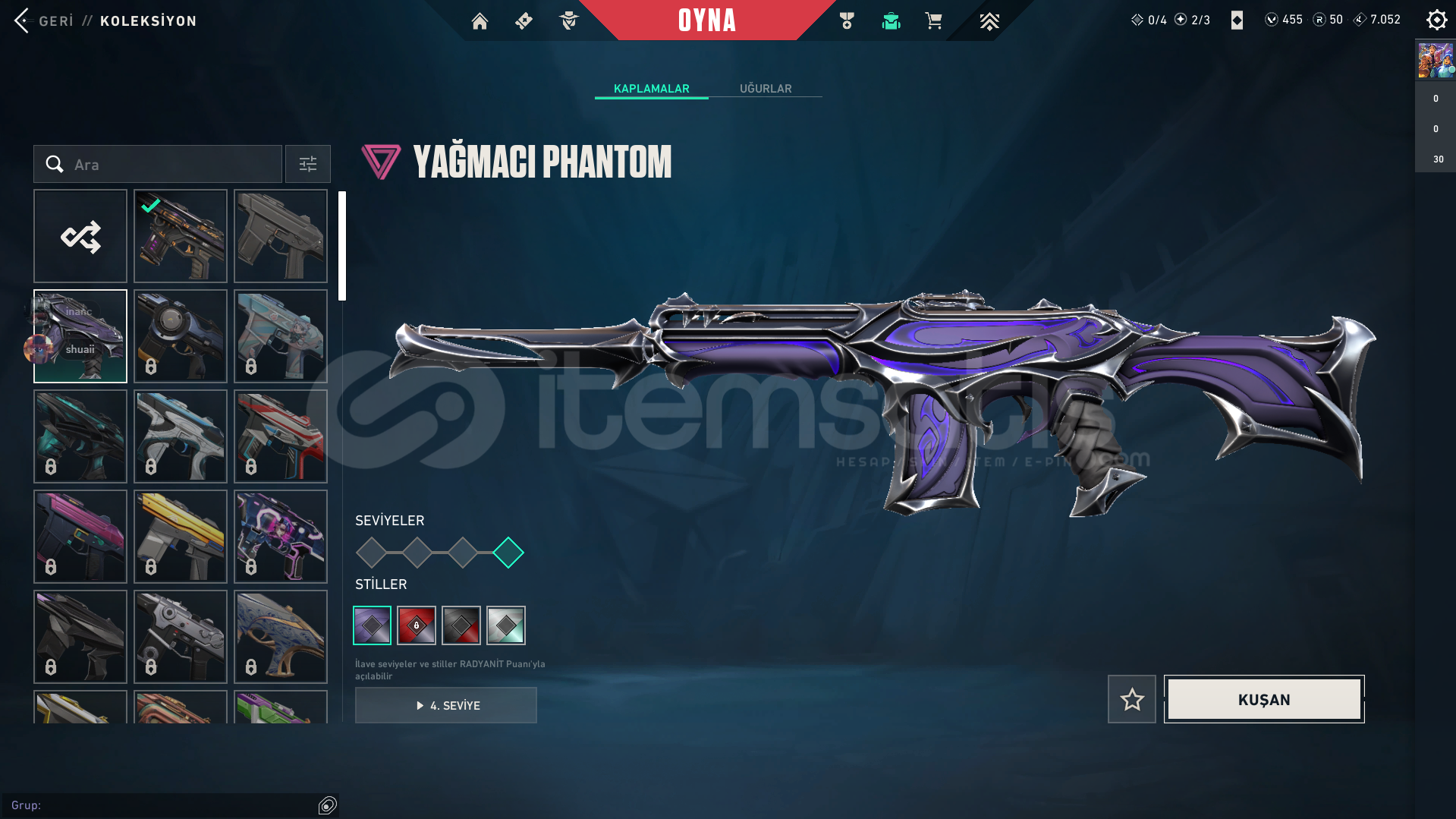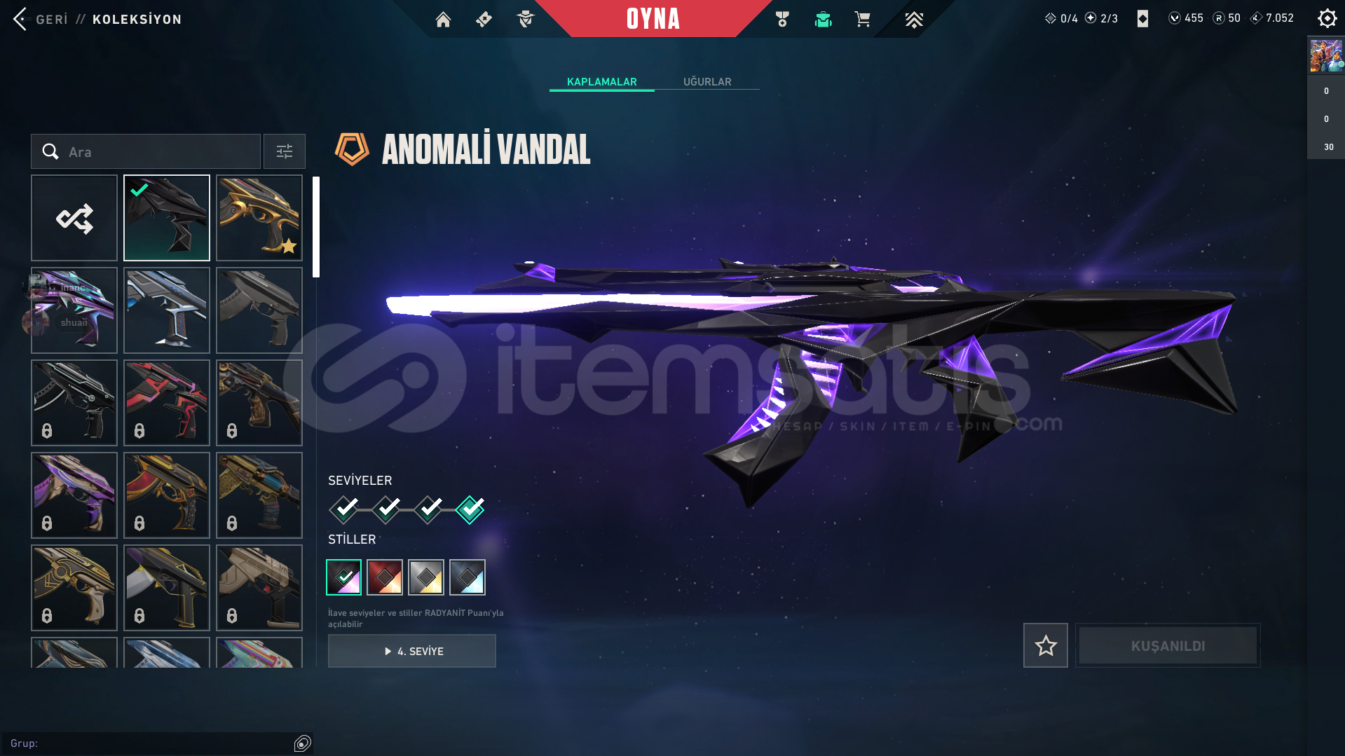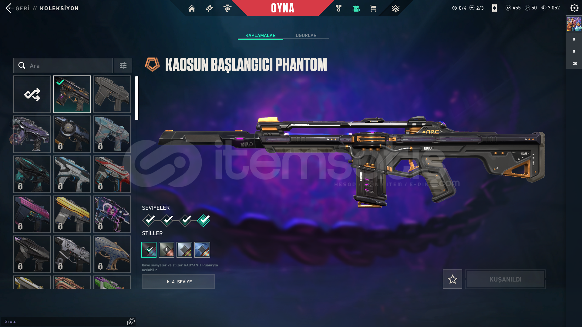 Hesapta:Seri Tetik SheriffKaosun Başlangıcı PhantomYağmaacı PhantomAnomali VandalCesur Yürek VandalKuronami VandalOnimaru Kunitsuna KatanaEk olarak Battlepass bulunmaktadır.Hesapta herhangi bir sorun yoktur. Eğer bir sorun olursa 7/24 destek sağlanır. Pazarlık vardır. Alıcısına hayırlı olsun.