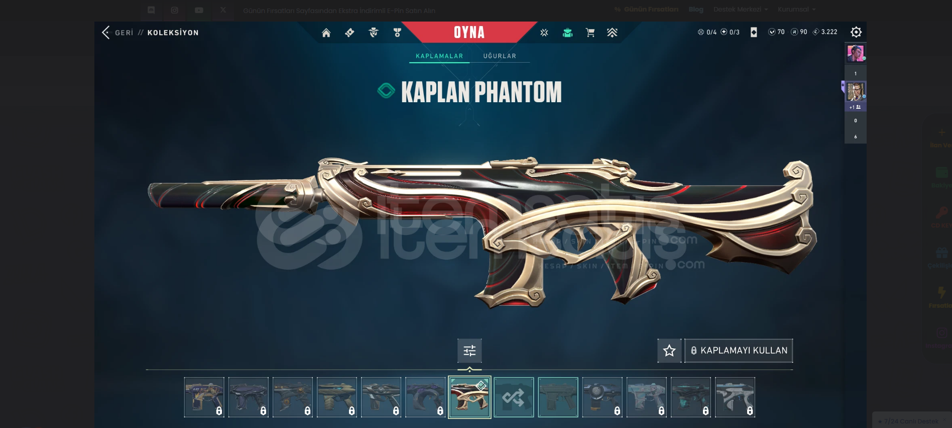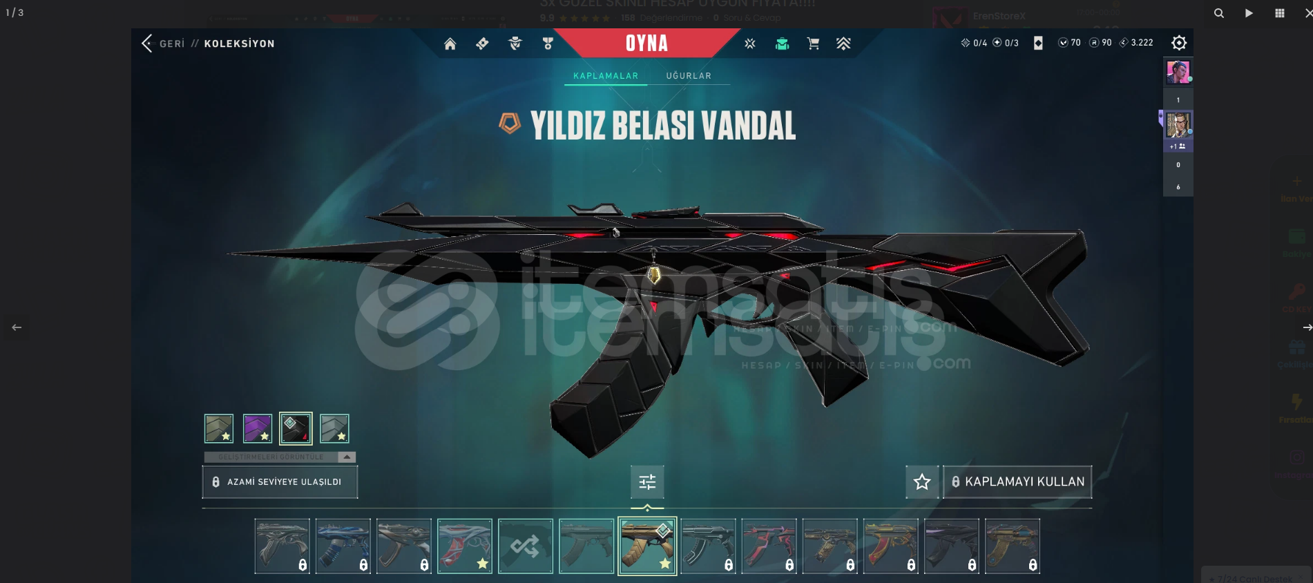 Hesapta 9 skin bulunmaktadır! Hesabın tüm bilgileri degisecektir (eposta-şifre.)Tr serverdırHesabı aldıgınızda aktif oldugum an hemen teslim edeceğim1 SKİNDE 4 FARKLI RENK VARSA VE 4 ÜDE ACIKSA O SKIN 1 DEGIL 4 SKIN OLARAK SAYILMAKTADIR!!MAİLİN TÜM BİLGİLERİNİ VERİCEGİMİZ İCİN İADE YOKTUR!!!1OTAMATİK TESLİMAT DEGILDIR HESABIN BILGILERINI AKTIF OLDUGUM ZAMAN VEREC...
