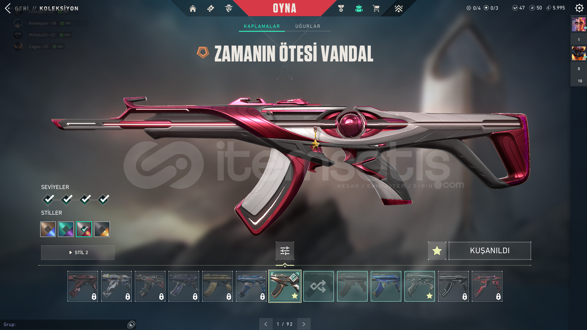 Vandal : Zamanın Ötesi , YitikPhantom : İyonSpectre : RGXSheriff : ProtokolClassic : RGXBıçak : YağmacıHepsi full skin ve çoğunun rengi vardırPazarlığa açıktır .