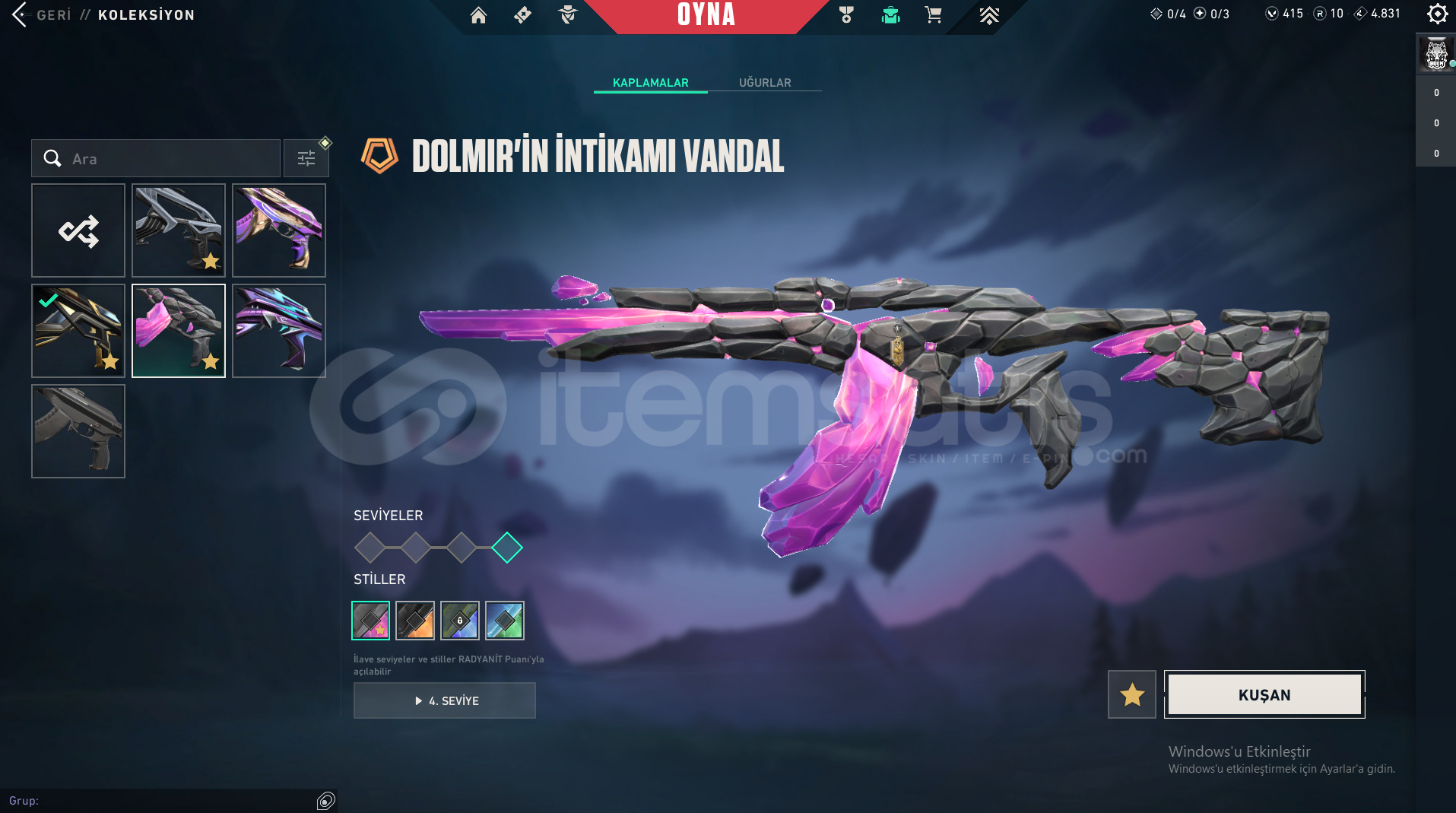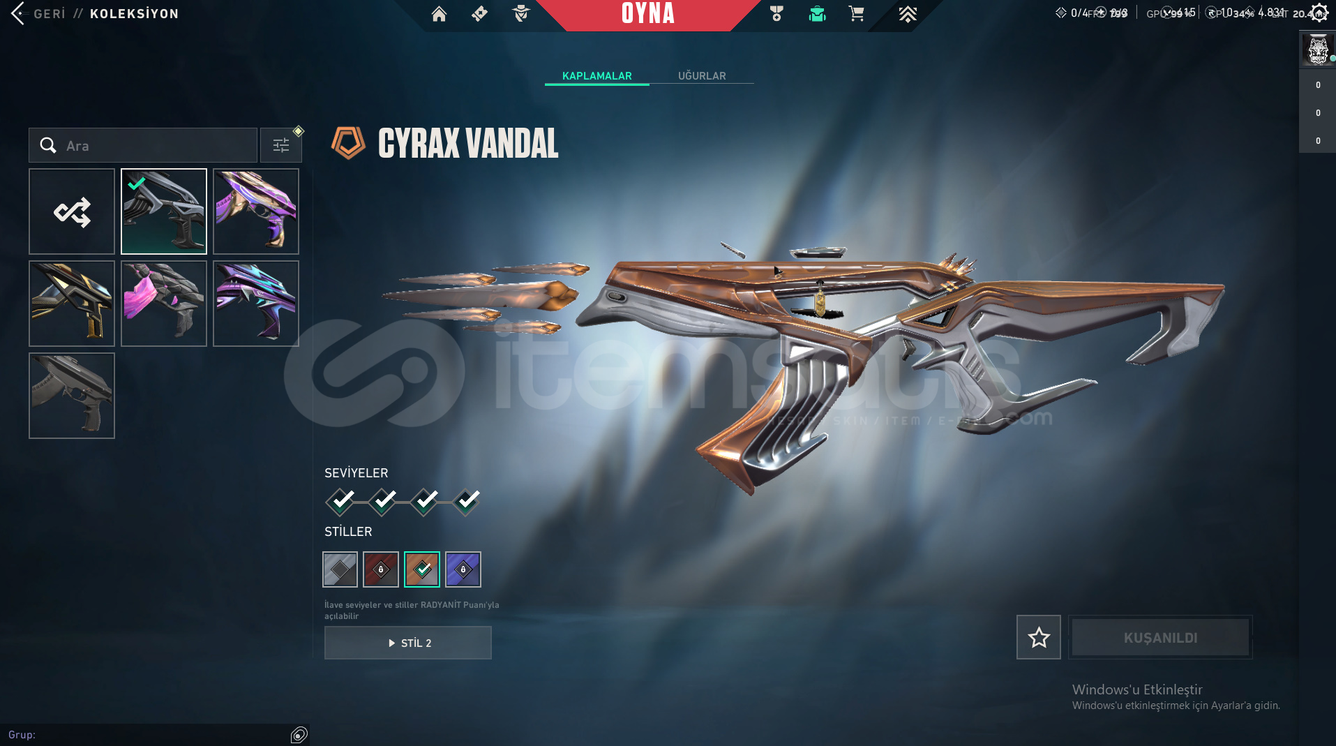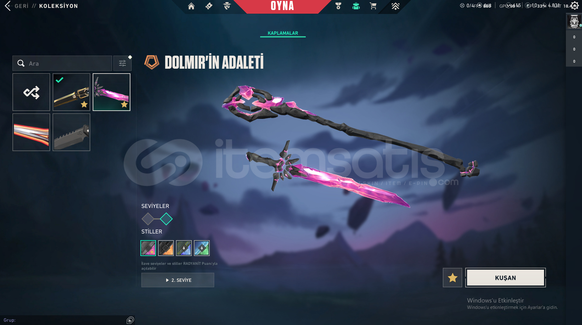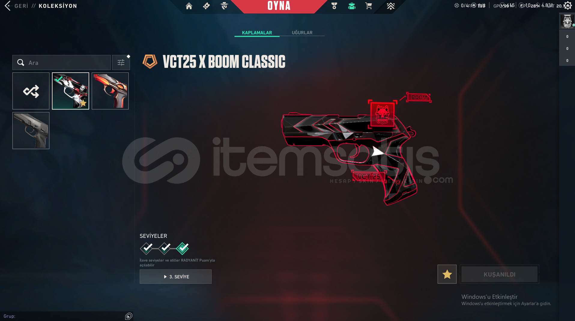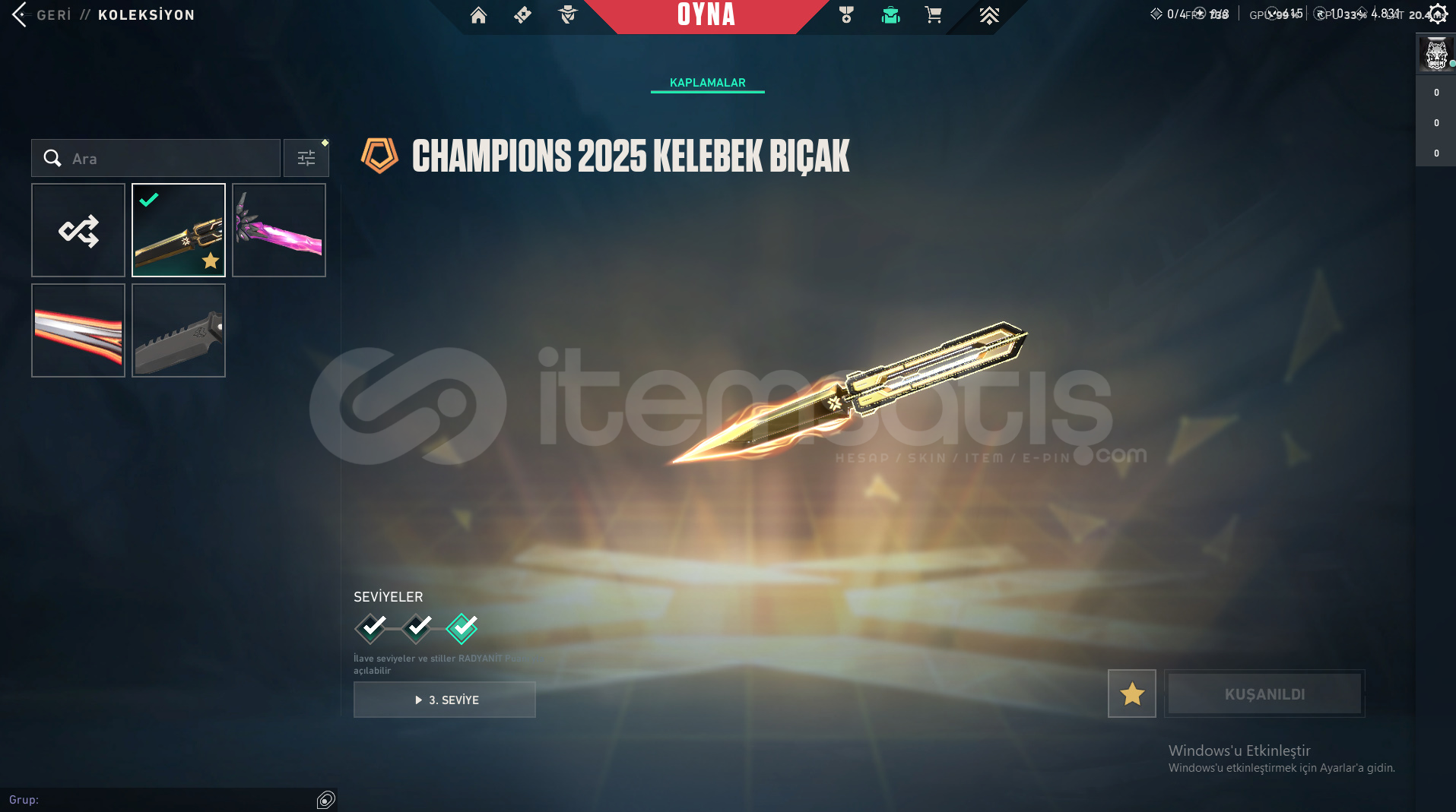 • Skinler: Champions 2025 Vandal - Dolmir's Revenge Vandal - CYRAX Vandal / Reaver Guardian / RGX 11z Pro Phantom / Singularity Sheriff / VCT25 x BOOM Classic / Dolmir's Judgement - Interhelm Sword - Champions 2025 Butterfly Knife VE DAHA SAYAMADIKLARIM İLE BİRLİKTE TOPLAM 32 SKİN MEVCUTTUR.