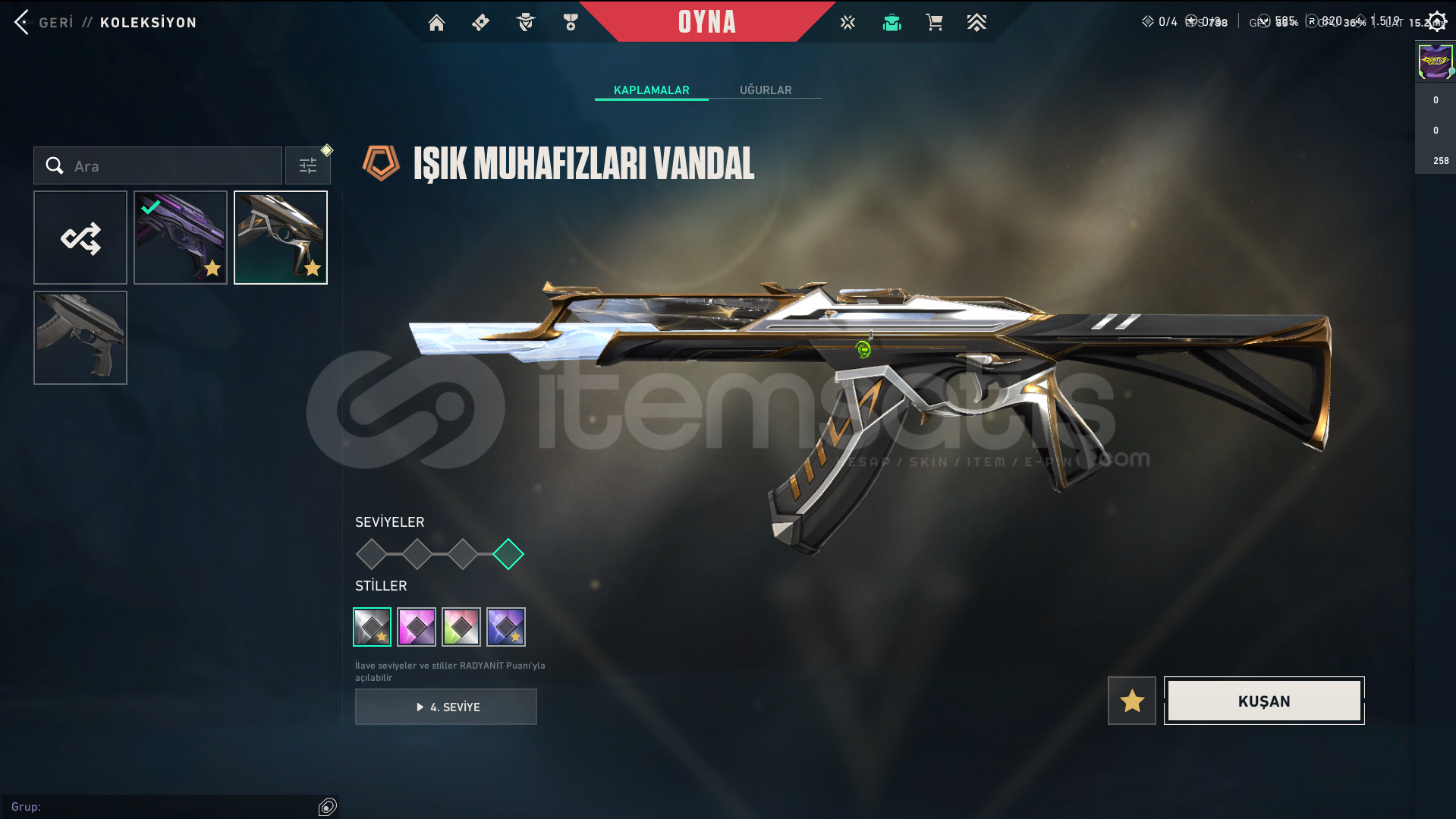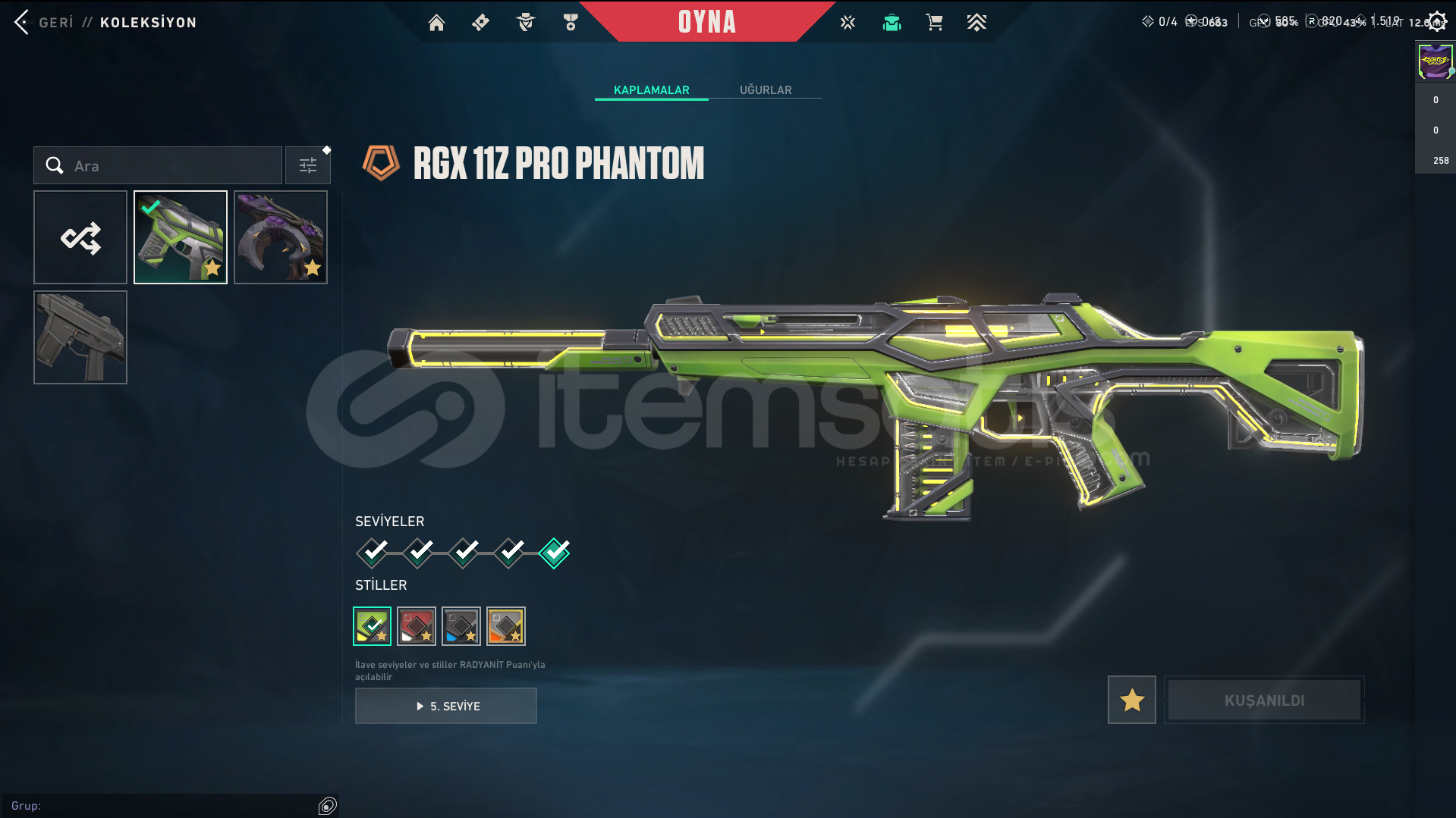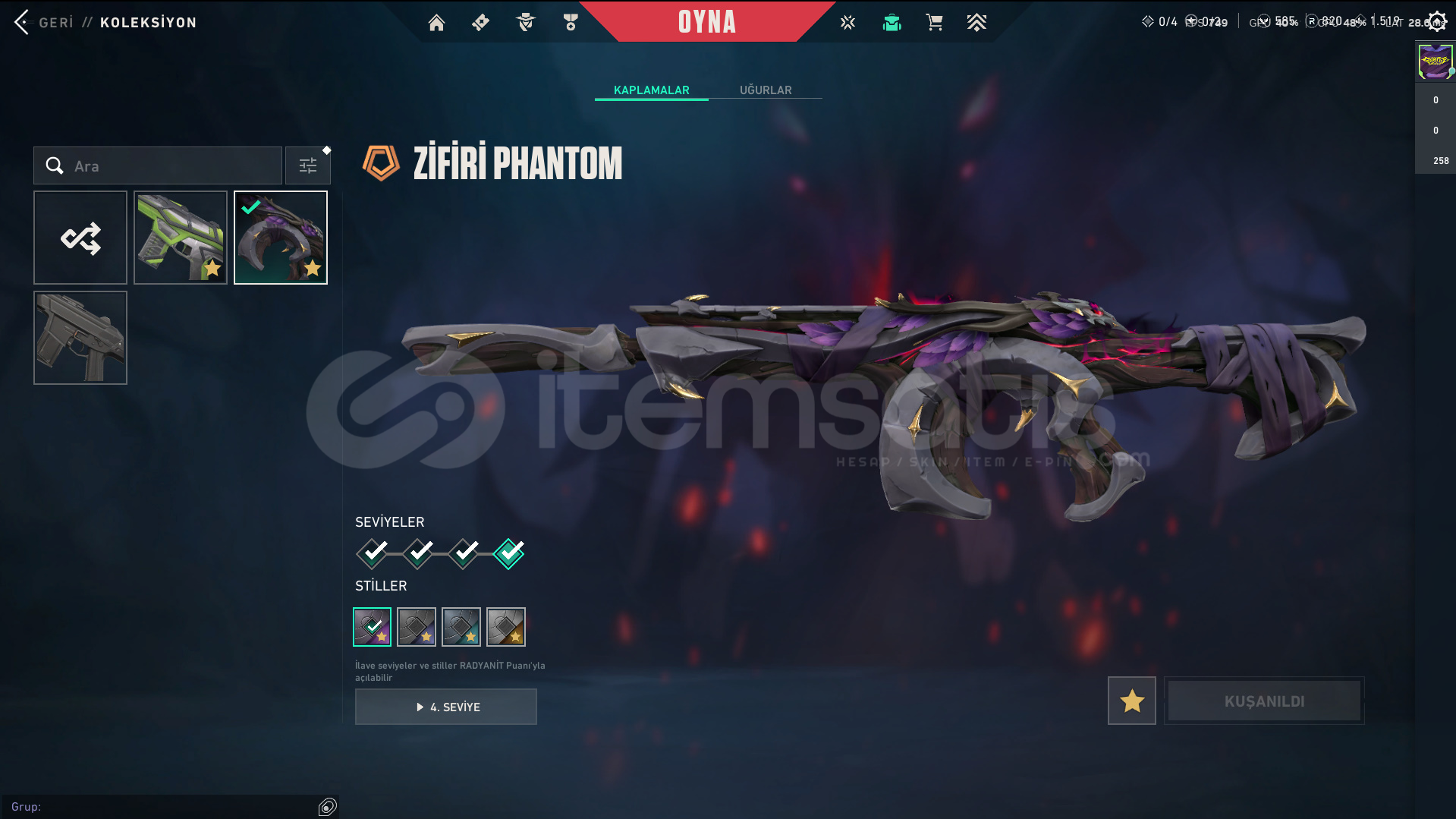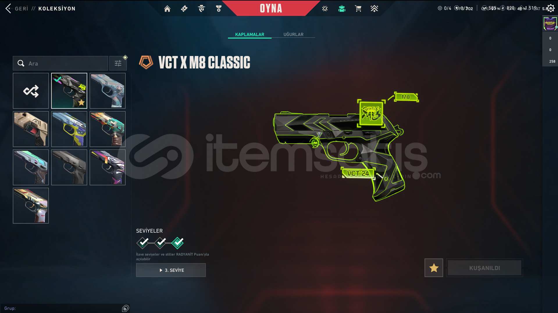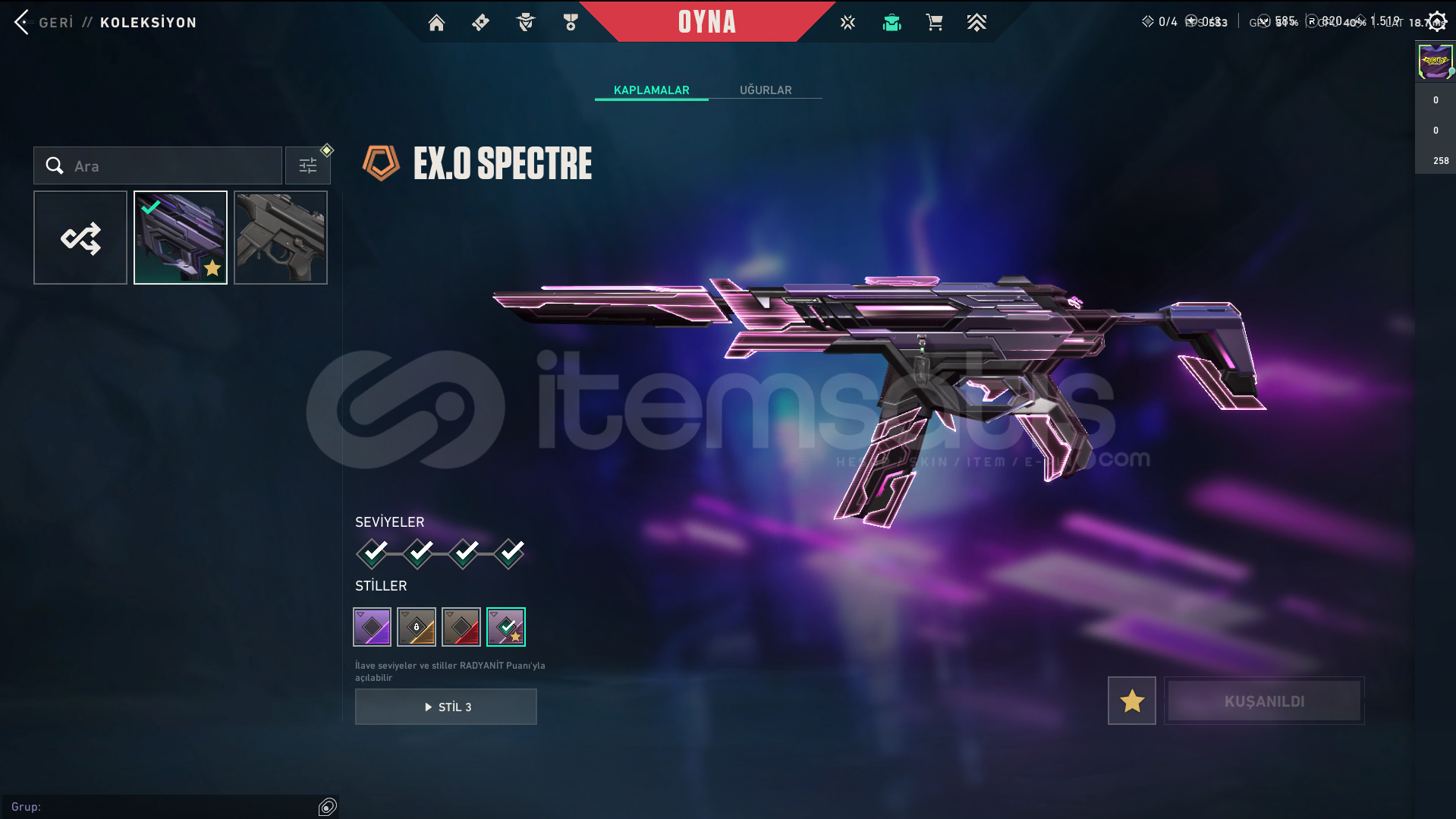 • Skinler: Sentinels of Light Vandal - EX.O Vandal / Nocturnum Phantom - RGX 11z Pro Phantom / EX.O Spectre / VCT x M8 Classic VE DAHA SAYAMADIKLARIM İLE BİRLİKTE TOPLAM 34 SKİN MEVCUTTUR.