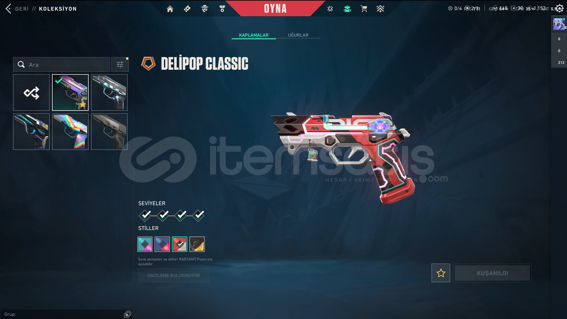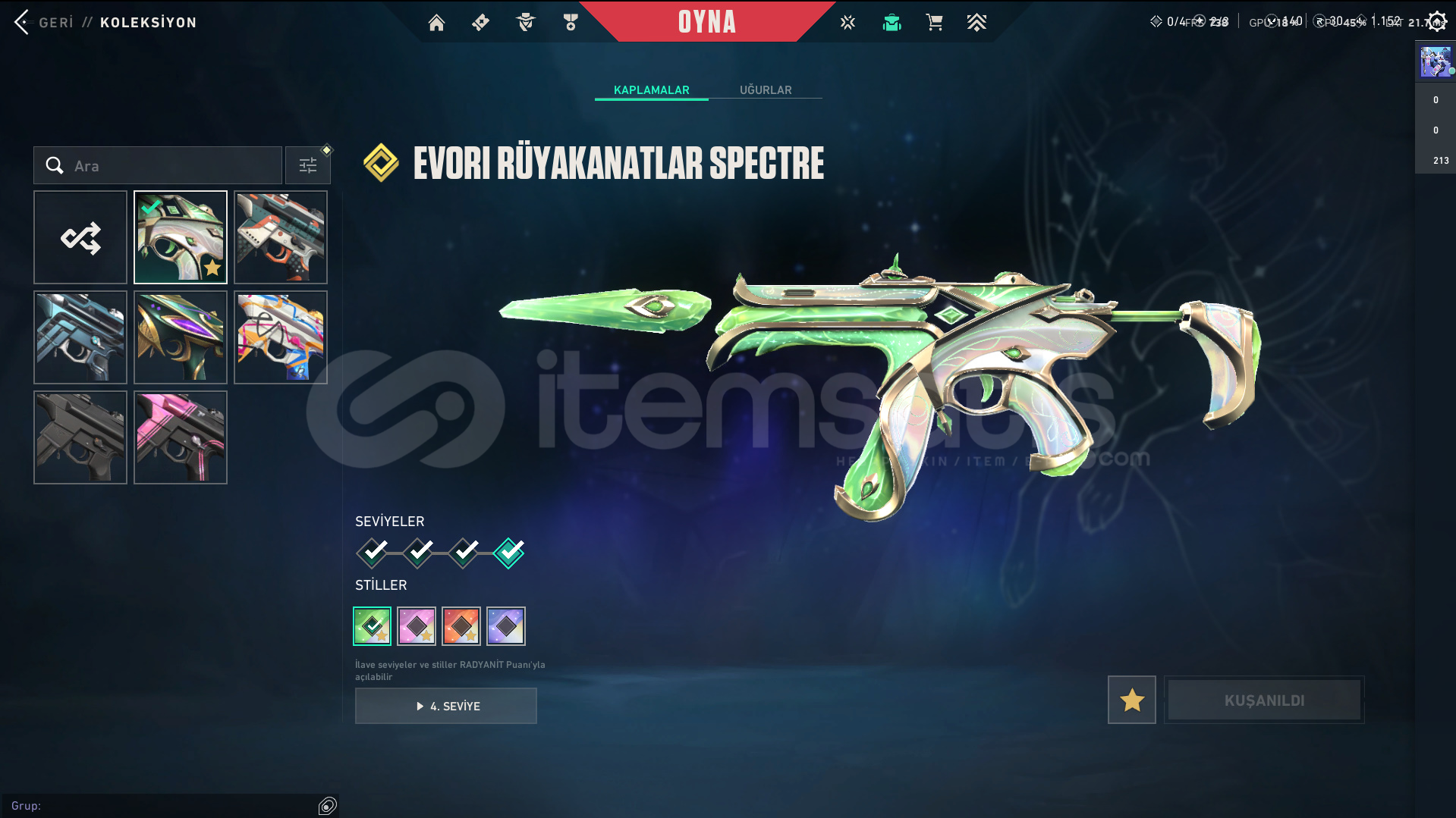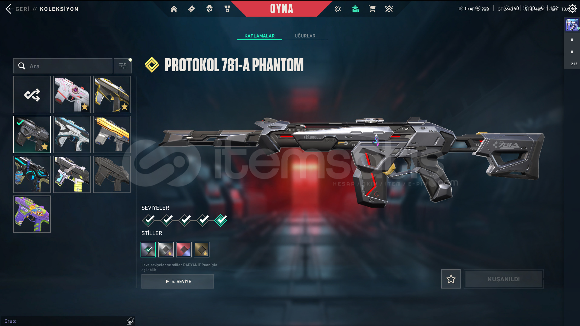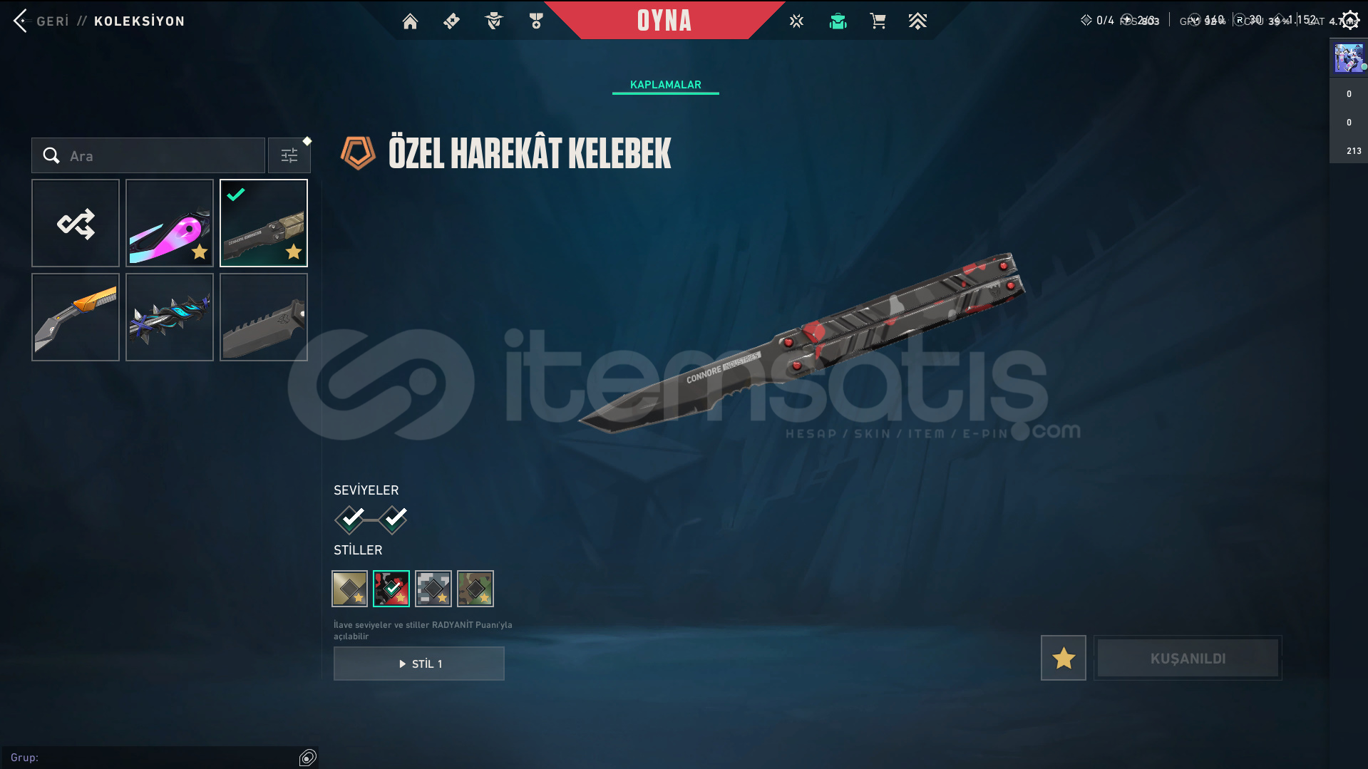 • Skinler: Kuronami Vandal - Imperium Vandal - Gaia's Vengeance Vandal / Prime//2.0 Phantom - Spectrum Phantom - Protocol 781-A Phantom / Evori Dreamwings Spectre / Glitchpop Classic / Ion Sheriff / Neptune Guardian / Bound - Transition Knife - Composite Knife - Recon Balisong VE DAHA SAYAMADIKLARIM İLE BİRLİKTE TOPLAM 80 SKİN MEVCUTTUR.