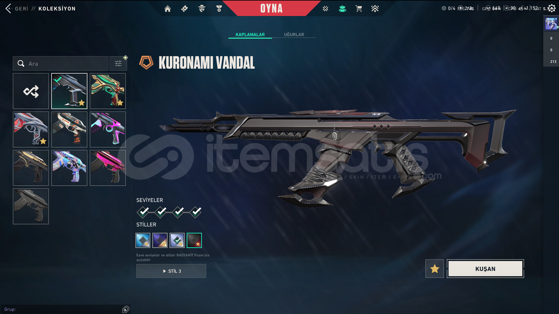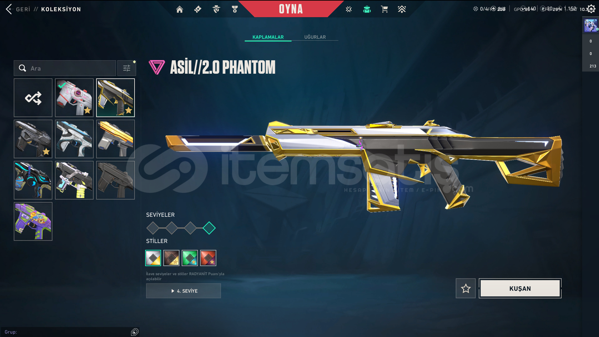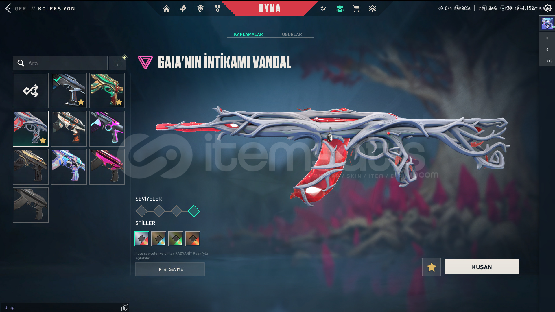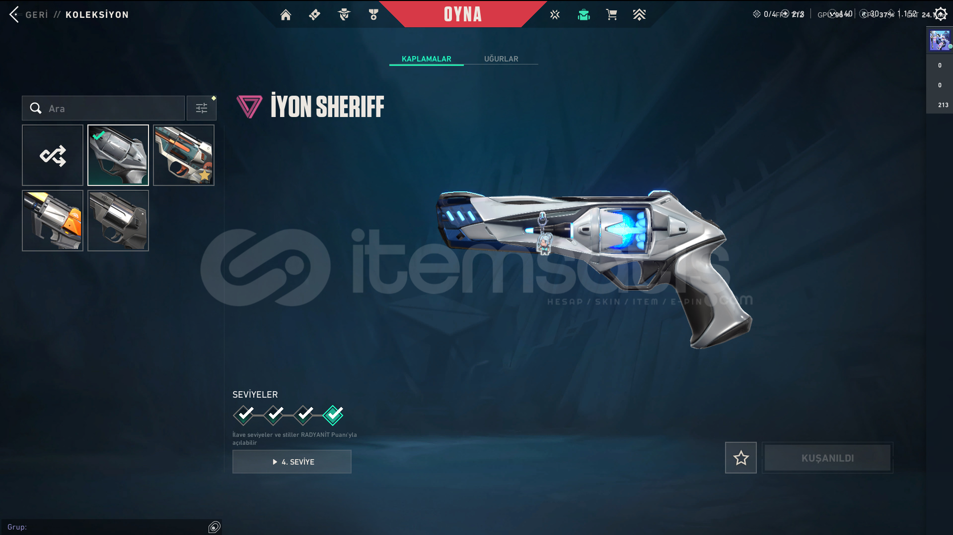 • Skinler: Kuronami Vandal - Imperium Vandal - Gaia's Vengeance Vandal / Prime//2.0 Phantom - Spectrum Phantom - Protocol 781-A Phantom / Evori Dreamwings Spectre / Glitchpop Classic / Ion Sheriff / Neptune Guardian / Bound - Transition Knife - Composite Knife - Recon Balisong VE DAHA SAYAMADIKLARIM İLE BİRLİKTE TOPLAM 80 SKİN MEVCUTTUR.