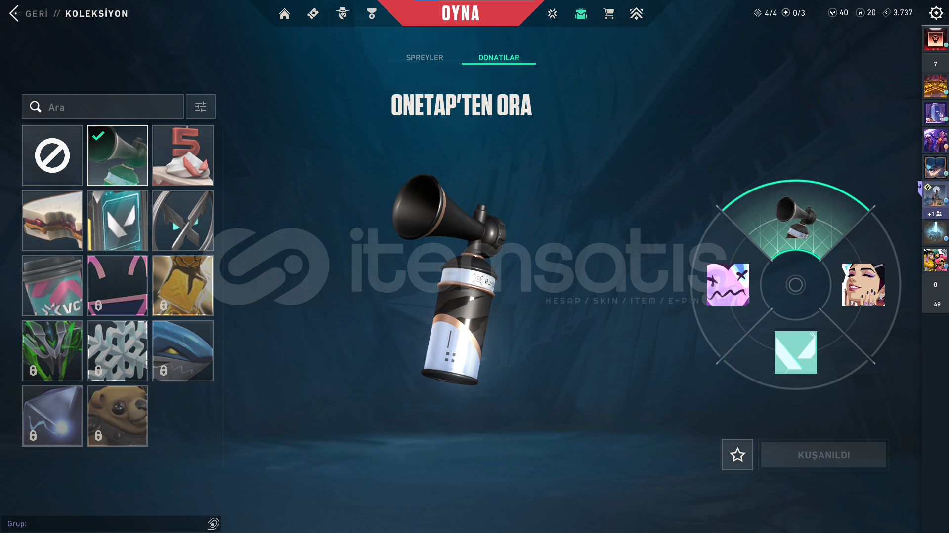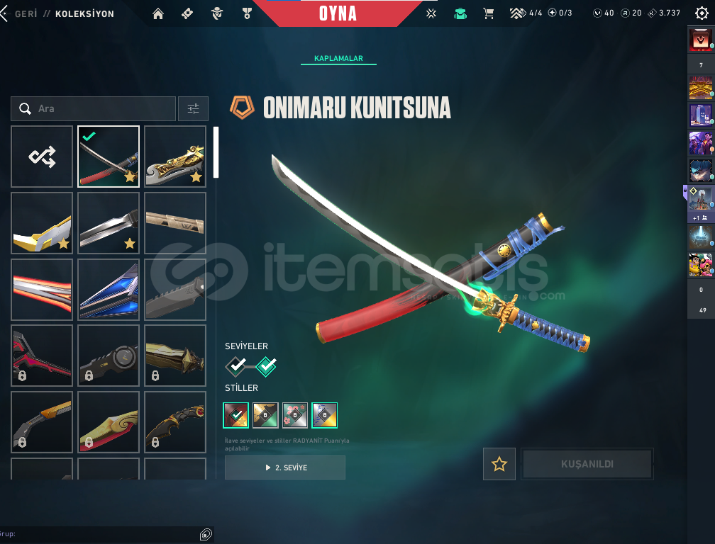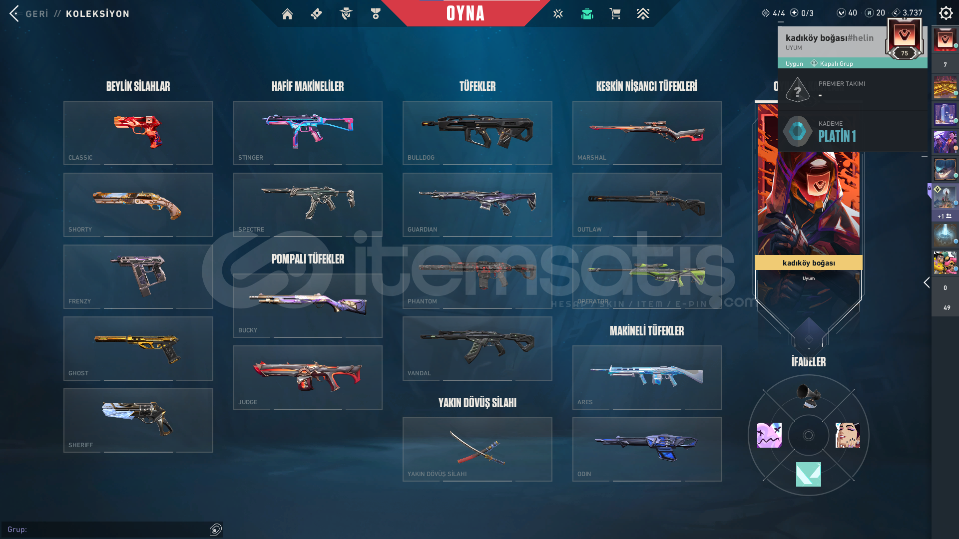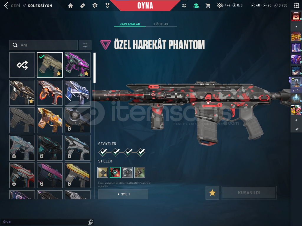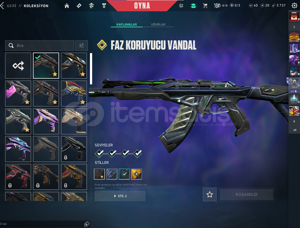 vandallar:kaos,oni,2025champ,faz,yiğitik,dolmirin intikamı, phantom:özel harekat,ponçik ecel,zamanın ötesiSherif:ışık muhafızlarıGhost:faz koruyucusu guardian:yağmacıbulldog:fazoutlaw:fazclassic:e-spor bi tane classicoperatör:rgx spectre:yiğitikBıçaklar:oni katana,faz koruyucusu,asil karambit,5 years remastered bıçak.