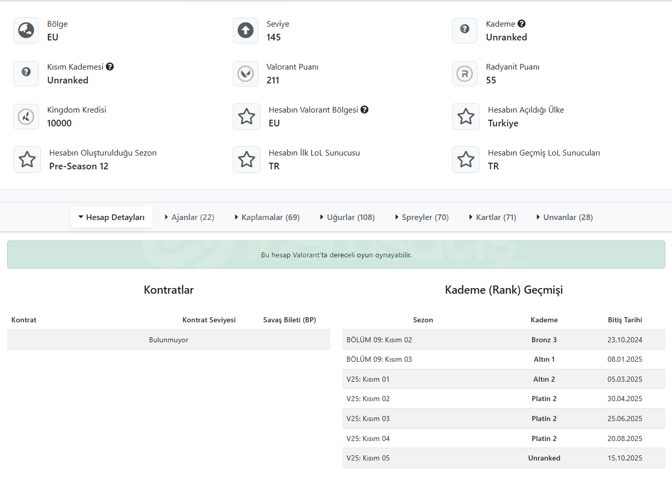 Hesap plat elodur bu sezon dereceli oynanmamıştır, tüm değerli skinler görselde mevcuttur, kafanıza takılan soruları sorabilirsiniz.