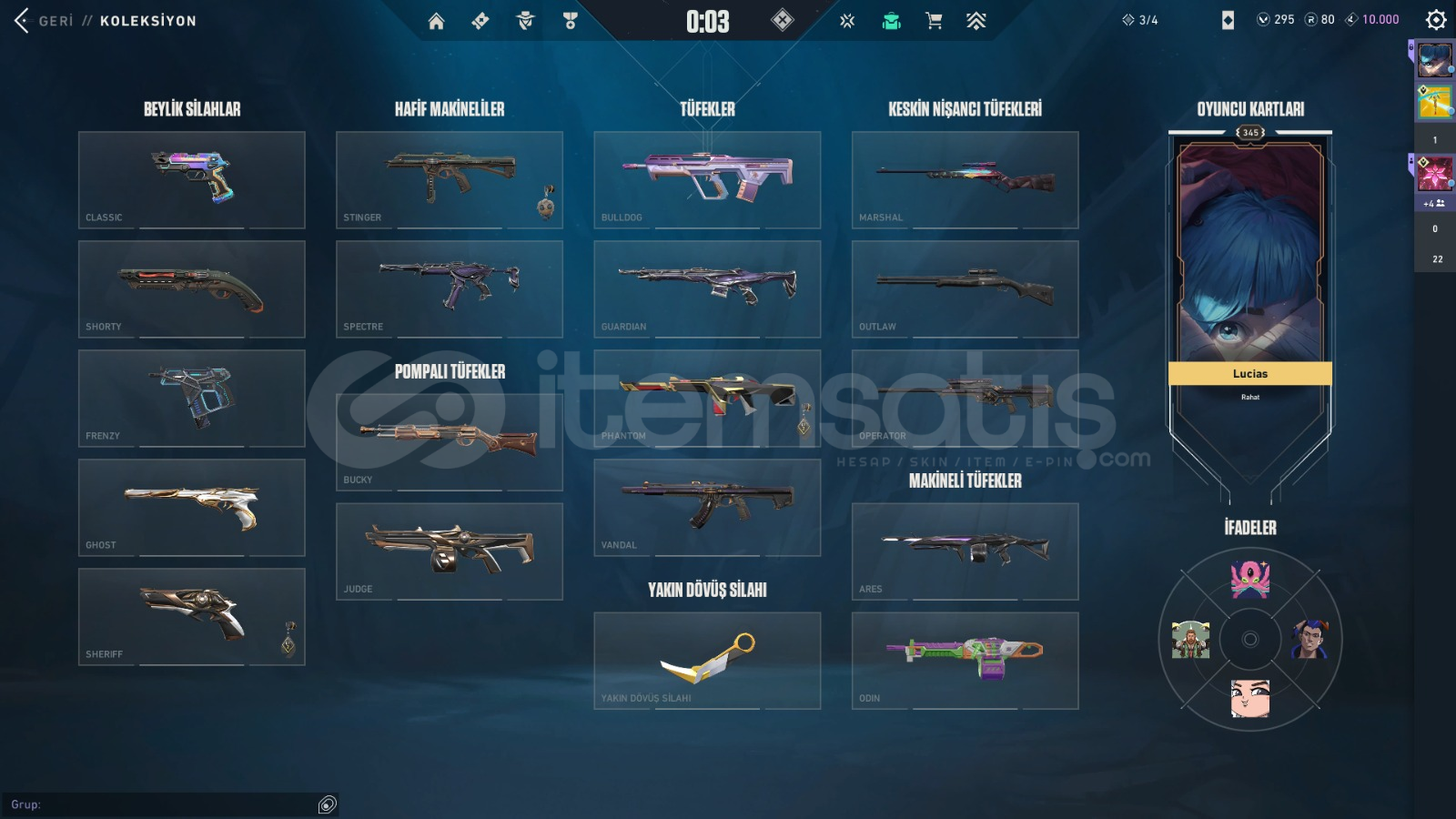 Resimlerdeki ve daha ekleyemediğim bir çok skin mevcutİlk maili olup betadan beri bende olan hesaptır mail devri yapılacak8 Bıçak5 Vandal7 Pahntom6 Sherif7 Ghost1 Guardian2 Spectre1 Judge2 Classic1 Shorty2 Operatör2 Odin1 AresSadece animasyonluları yazdım