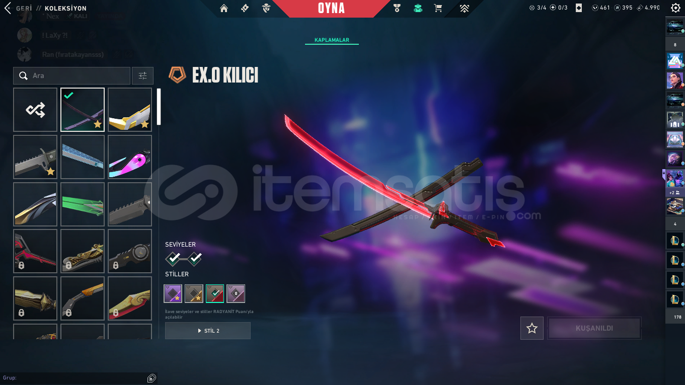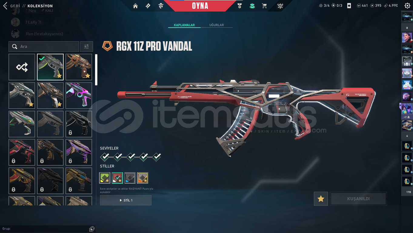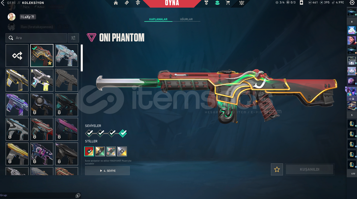 Hesaptaki Yükseltilebilir skinler:RGX VandalShirpunk VandalZamanın Ötesi VandalYitik Vandal----------------------------------------Oni PhantomAsil 2.0 Phantom----------------------------------------İyon Operator----------------------------------------Yağmacı Spectre---------------------------------------Ejderin Buyruğu Judge--------------------------------------Onı Bucky--------------------------------------Protocol Sheriff---------------------------------...