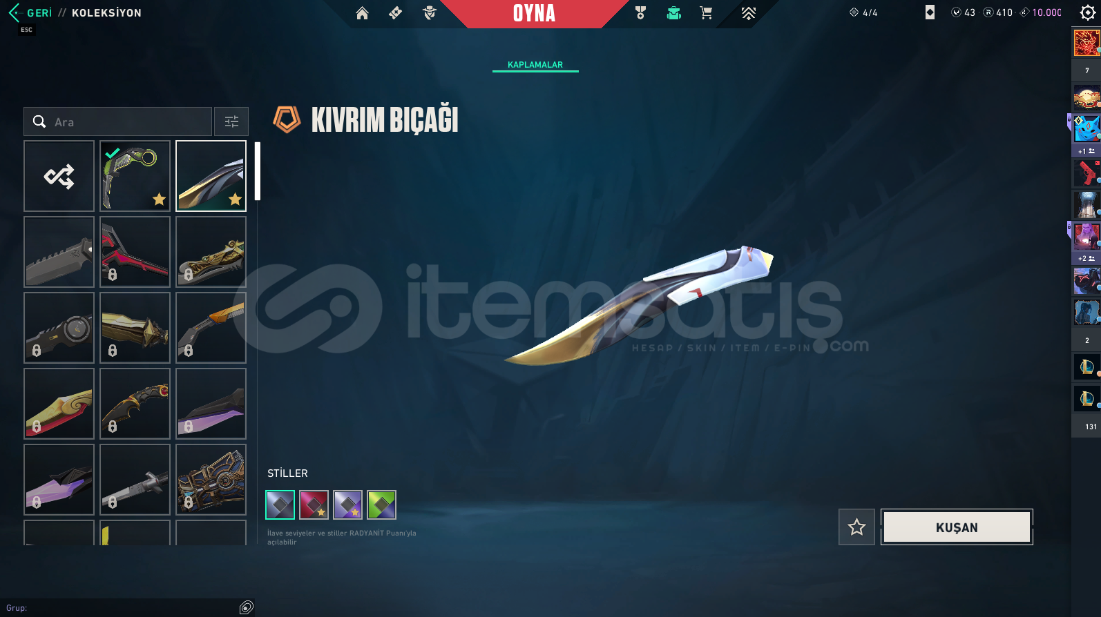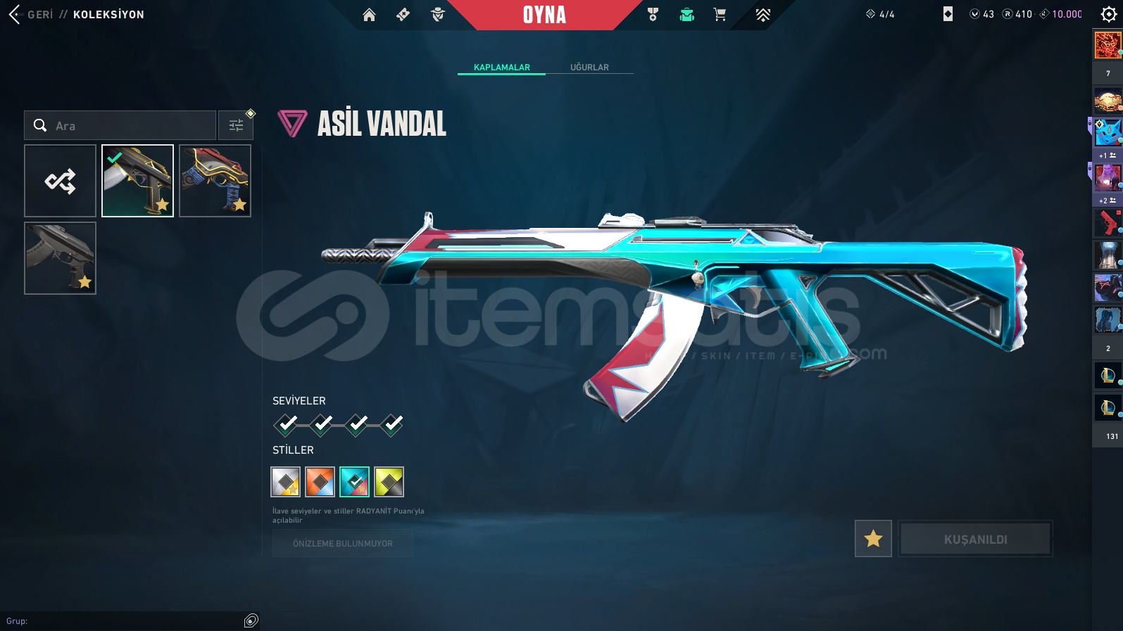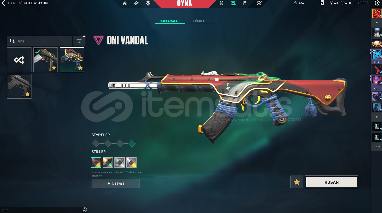 Fiyat Belirleyici En Önemli Unsur Radyanit Puanıdır Pazarlık Var Ciddi Alıcılar Yazsın Lütfen!!! Hesapta Nerdeyse 9k Değerinde Radyanit Puanı Var1. Vandal Skinleri (2 Adet):Oni Vandal (Full Seviye) Asil Vandal (Full Seviye) 2. Phantom Skinleri (2 Adet):İyon Phantom (Full Seviye) Sırçiçeği Phantom (Full Seviye) 3. Bıçaklar (2 Adet): RGX 11Z PRO Karambit Kıvrım Bıçağı .ㇺ...