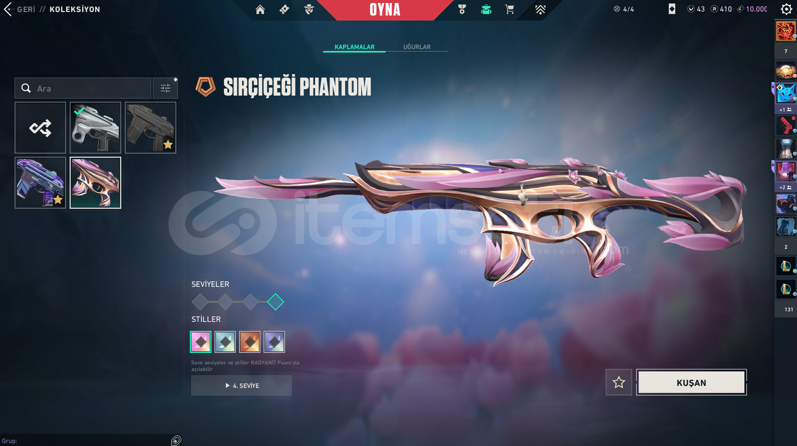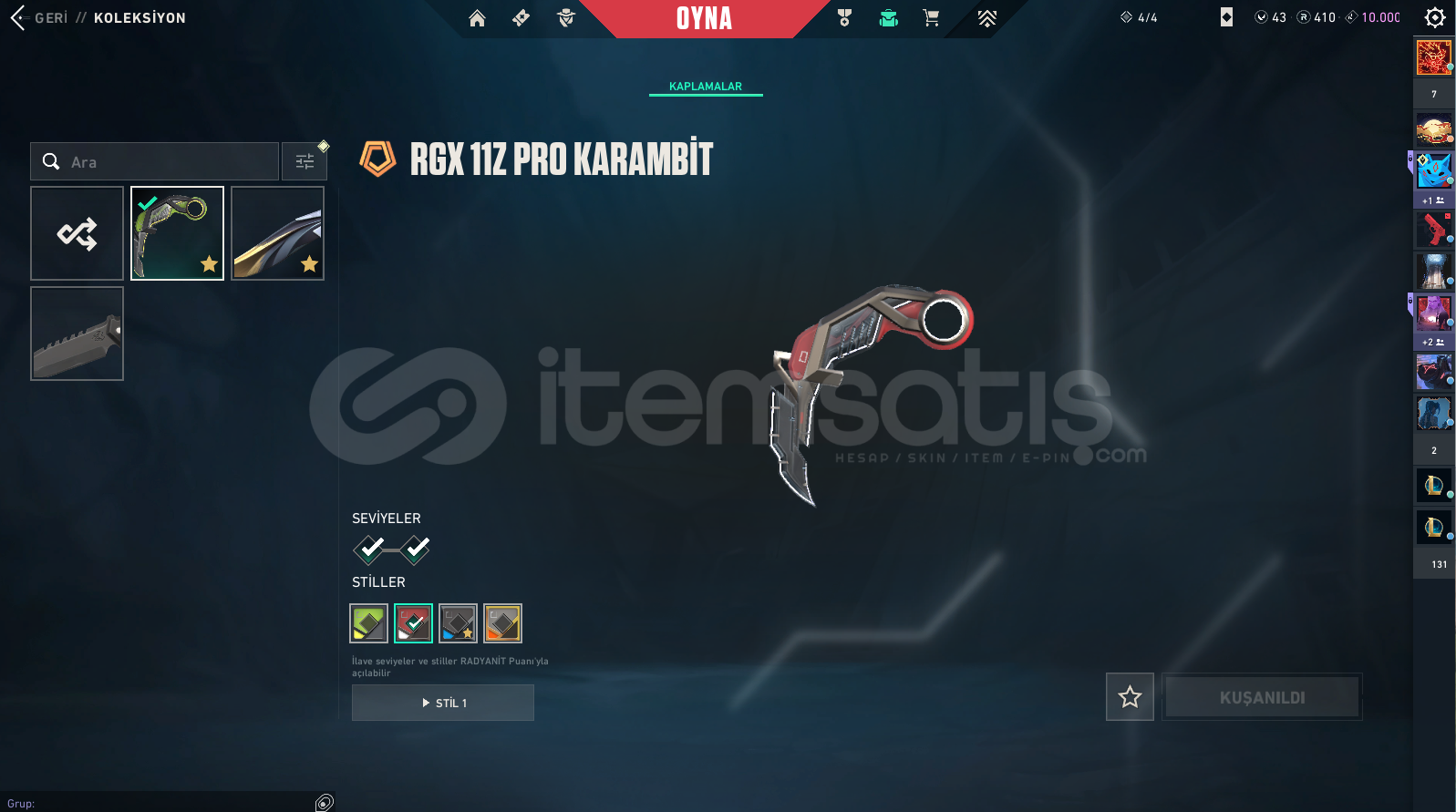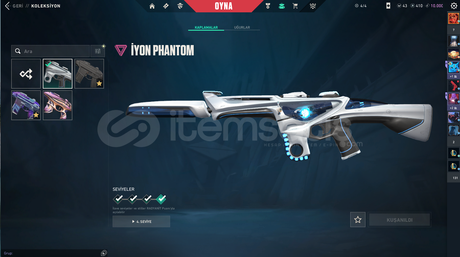 Fiyat Belirleyici En Önemli Unsur Radyanit Puanıdır Pazarlık Var Ciddi Alıcılar Yazsın Lütfen!!! Hesapta Nerdeyse 9k Değerinde Radyanit Puanı Var1. Vandal Skinleri (2 Adet):Oni Vandal (Full Seviye) Asil Vandal (Full Seviye) 2. Phantom Skinleri (2 Adet):İyon Phantom (Full Seviye) Sırçiçeği Phantom (Full Seviye) 3. Bıçaklar (2 Adet): RGX 11Z PRO Karambit Kıvrım Bıçağı .ㇺ...