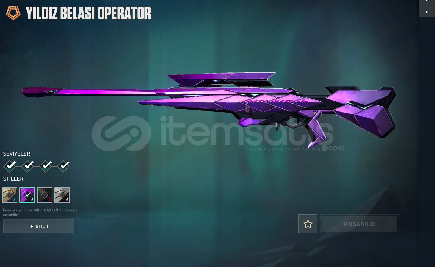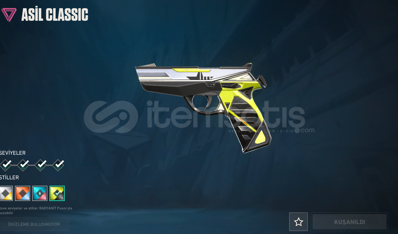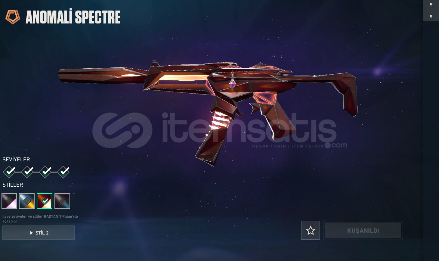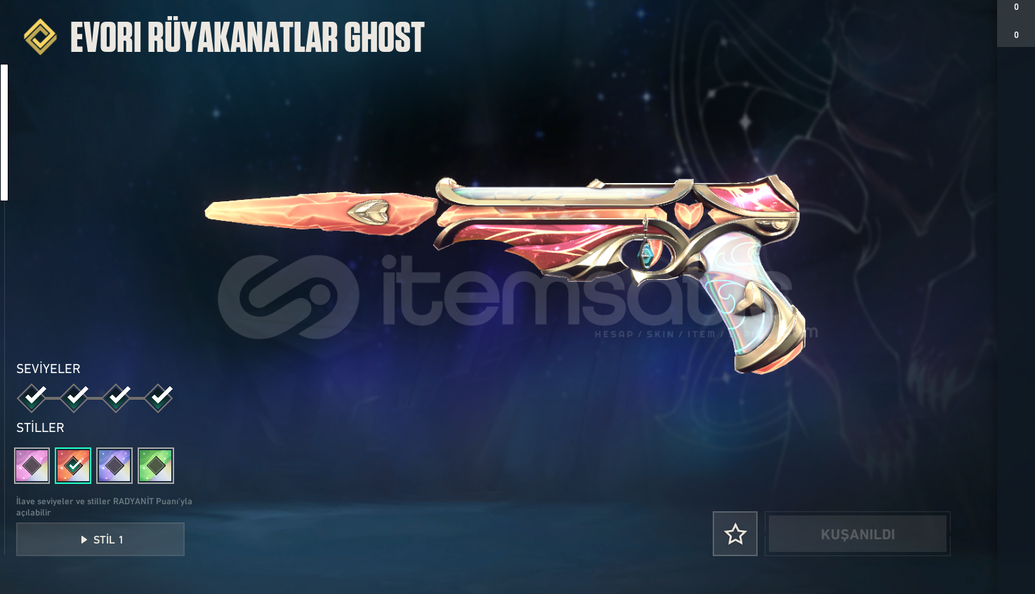 RGT KARAMBİT , İYON PHANTOM , ASİL VANDAL , ASİL CLASSİC , EVORİ RÜYA KANATLAR GHOST , İYON SHERİFF , ANOMALİ SPECTRE , YILDIZ BELASI OPERATOR VE BP DEN BİR KAÇ SKİN MEVCUTTUR