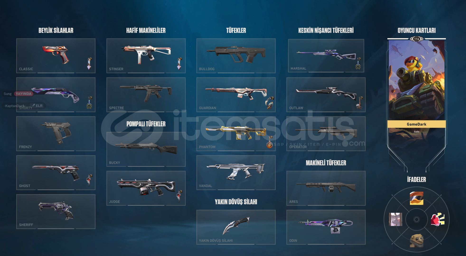 Asil PhantomKuronomi VandalYağmacı Sheriff 1 battlepass toplam 2k yatırılmış hesapLoL hesabı var ama düşük seviyeTüm Ajanlar Açık110 LvLİsim değişim hakkı var (yoksa bir hafta maks kalmıştır)