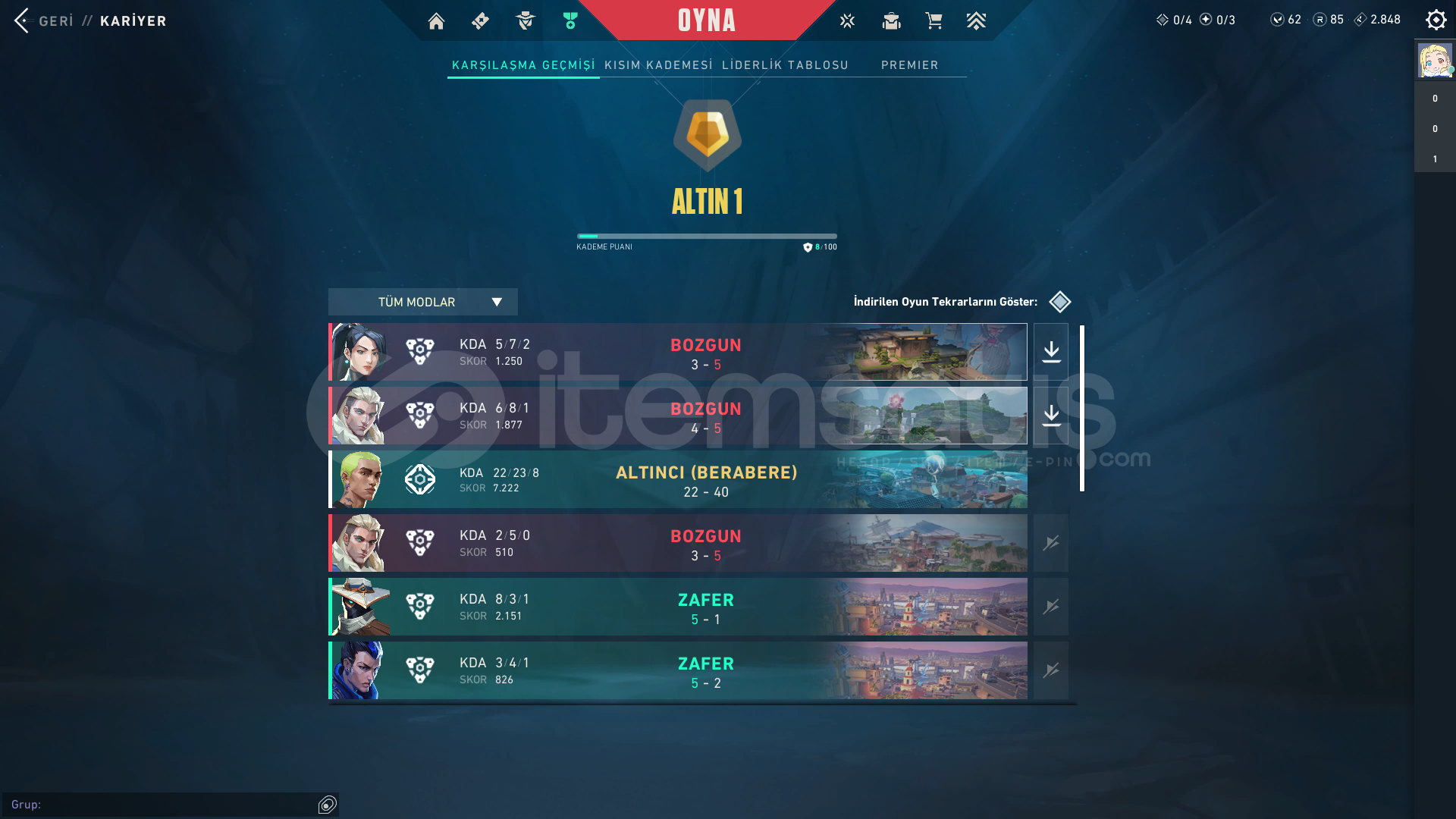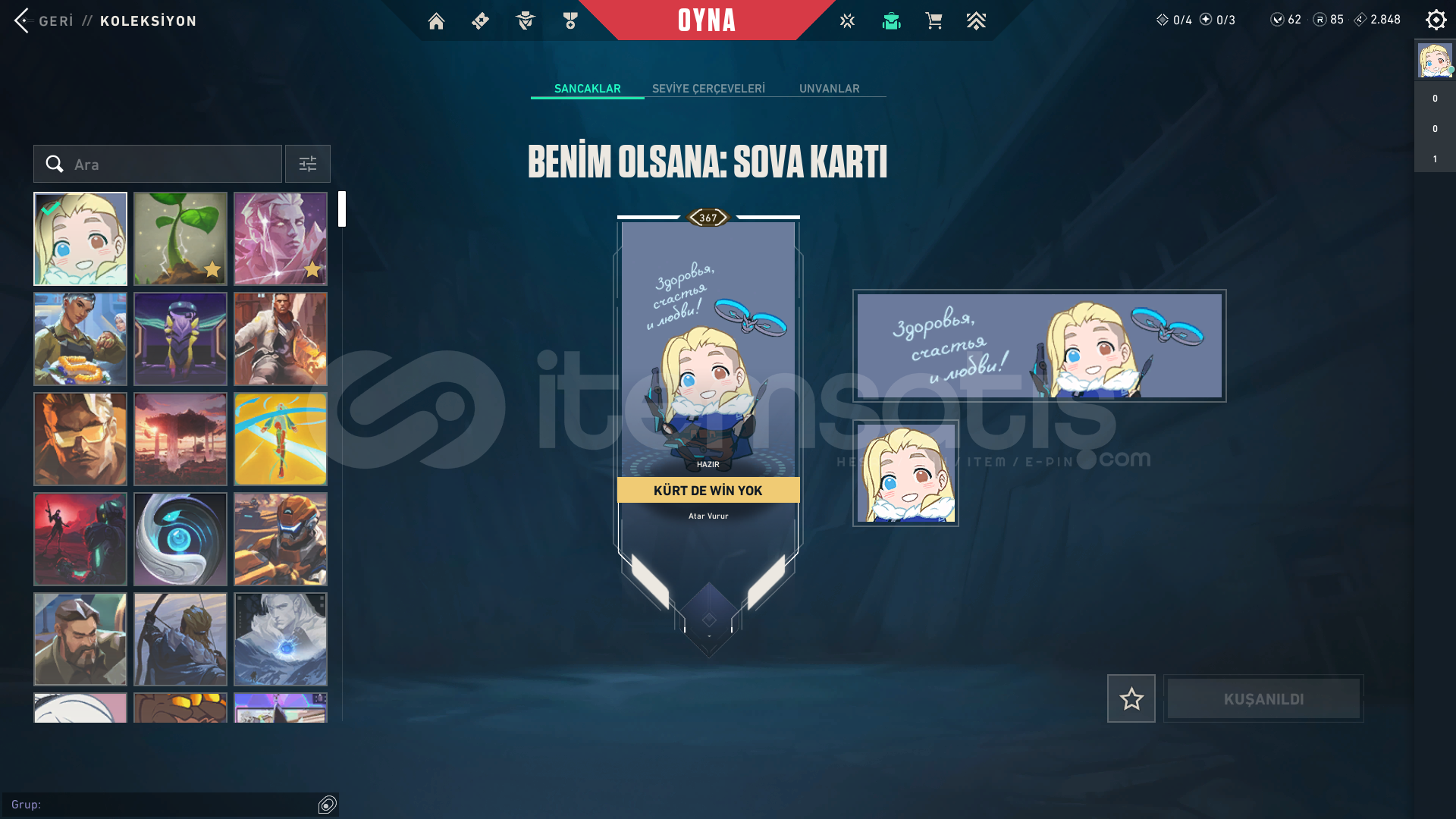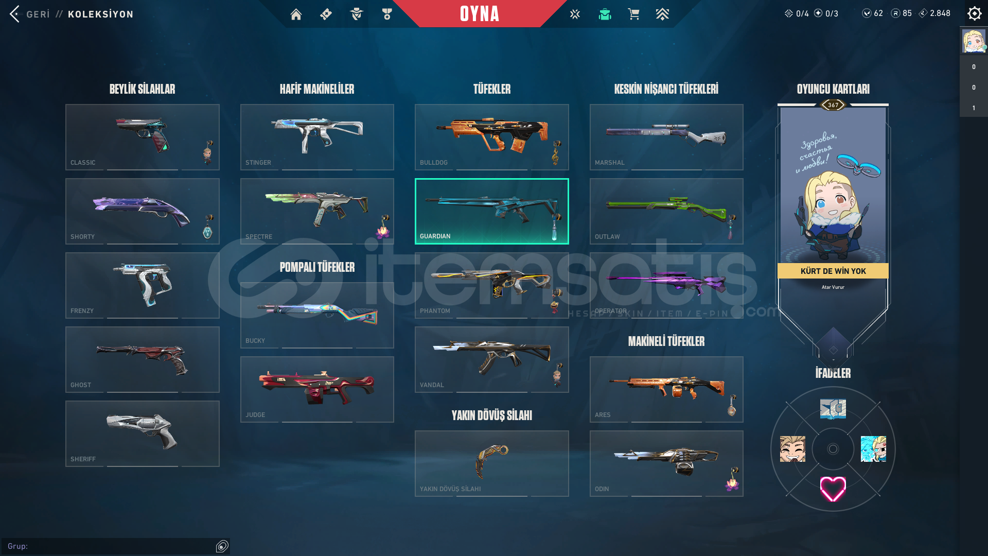 Hesap şahsi hesabımdır oyuna vakit bulamadığım için satıyorum Fotoğraflar da kısıtlı skinleri gösterebileceğim için çoğunluğun oynadığı skinleri alta yazıyorumVandal Skinleri -Yıldız Belası(Tüm Renkler Açık )-Yüksek İrtifa (Sova desenli)-Yağmacı Vandal (Tüm Renkler Açık)-Devinim-Himaye-Işık Muhaf...
