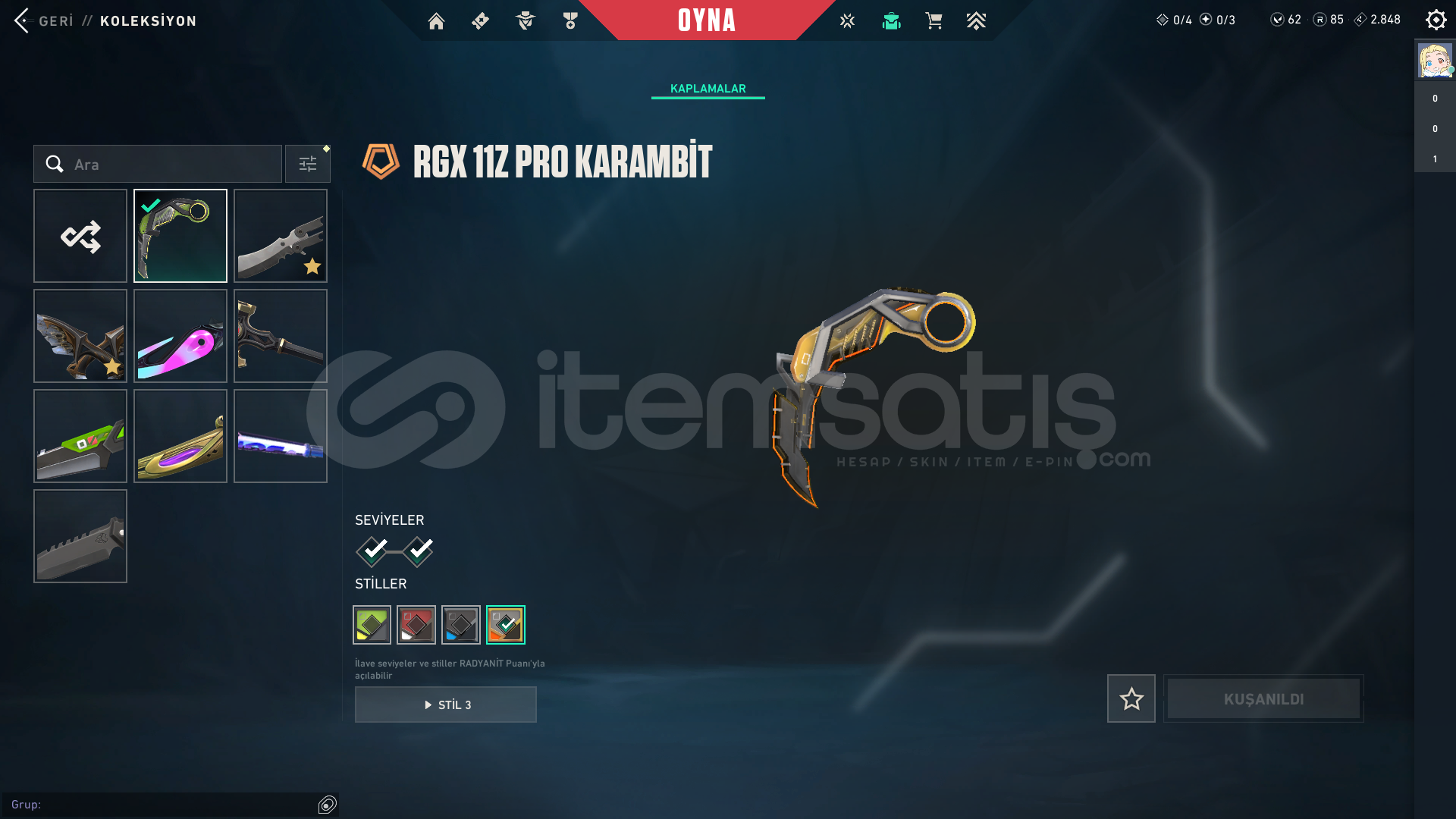 • Bıçak Skinleri -RGX Karambit (Tüm renkler açık)-Karaborsa Kelebek-Işık Muhafızı Hançerleri (Tüm renkler açık)-Devinim -Himaye-Kartuş-Kum Fırtınası-Popstar sopası Skinleri vardır