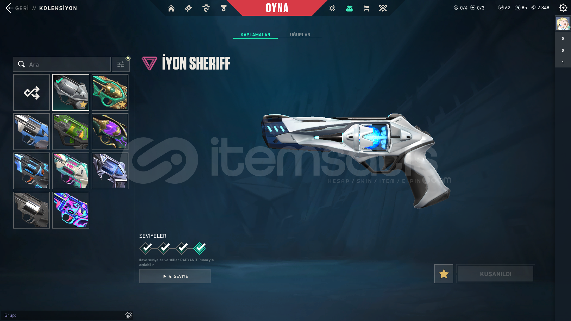 • Sherif Skinleri -İyon Geliştirmeleri açık -Ejderin buyruğu ( Tüm renkler açık)-Gözeteci-Kartuş-Kum Fırtınası -Nanokırılma-Renk deryası-Tarz Skinleri vardır