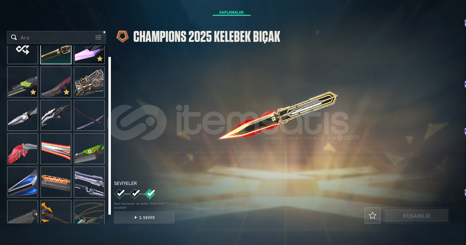 CHAMPIONS 2025 BİCAK ZİFİRİ TIRPAN YILDIZPARÇALAYAN YIKIM ELÇİSİ BİCAK RGX 11Z PRO BİCAK GAİANIN GAZABI EX.0 KILIÇ CYRAX YELPAZE ARCANE ELDİVENLERİ ANOMALİ KELEBEK BİÇAK