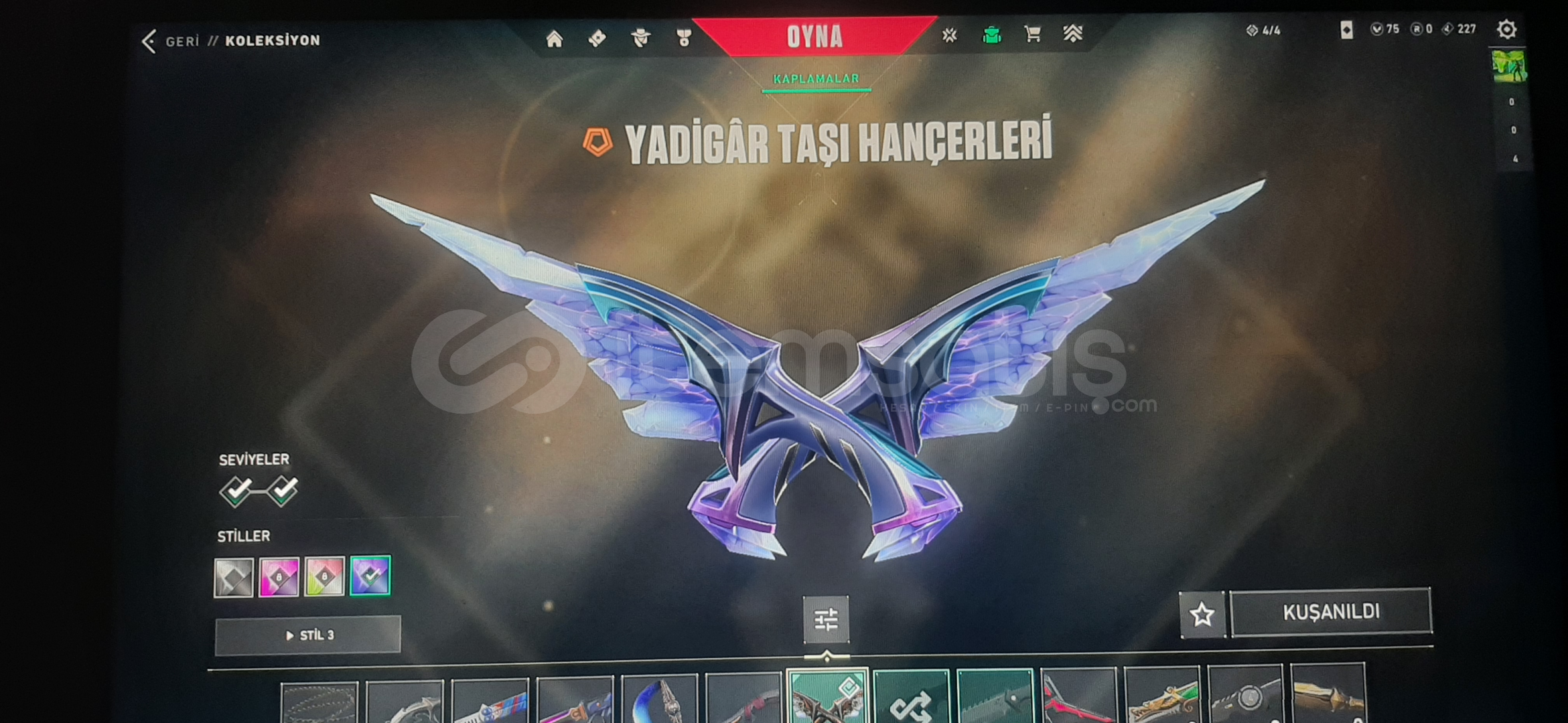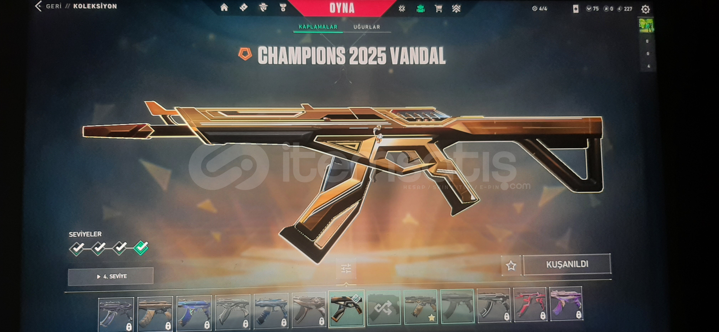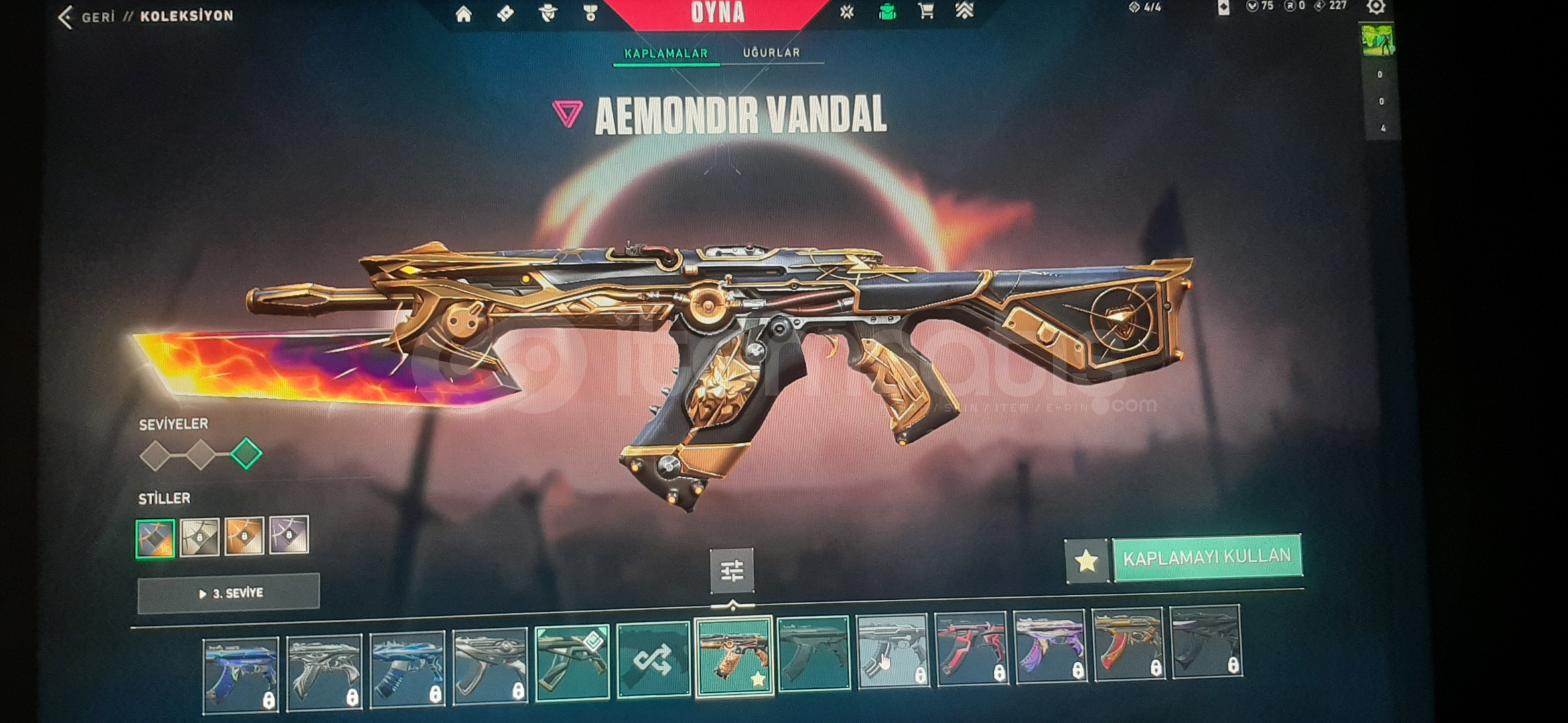 Satılık valorant hesabı Rank: Gold 2-AEMONDIR VANDAL-2025 CHAMPİONS VANDAL-KAOS PHANTOM -YADİGAR TAŞI HANÇERLERİ BIÇAK