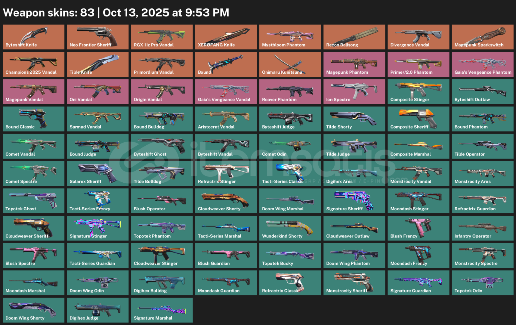 Hesaptaki Skinler; Champions 2025 Vandal Ruh Çiçeği Phantom Sihirpunk Phantom Asil 2.0 Phantom Gaia Phantom Sihirpunk Vandal Oni Vandal Köken Vandal Gaia Vandal Yağmacı Phantom İyon Spectre Rgx Vandal Seri Tetik Sheriff Xerofang Bıçak Özel Harekat Kelebek Sihirçakı Oni Katana 7 Bıçak 83 Skin + 1123 VP Ve çok daha fazlası!