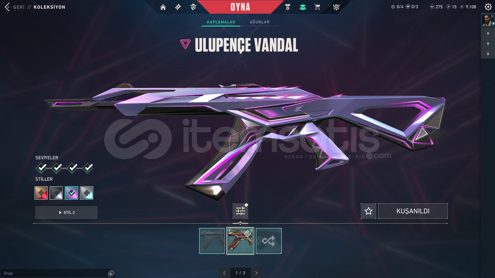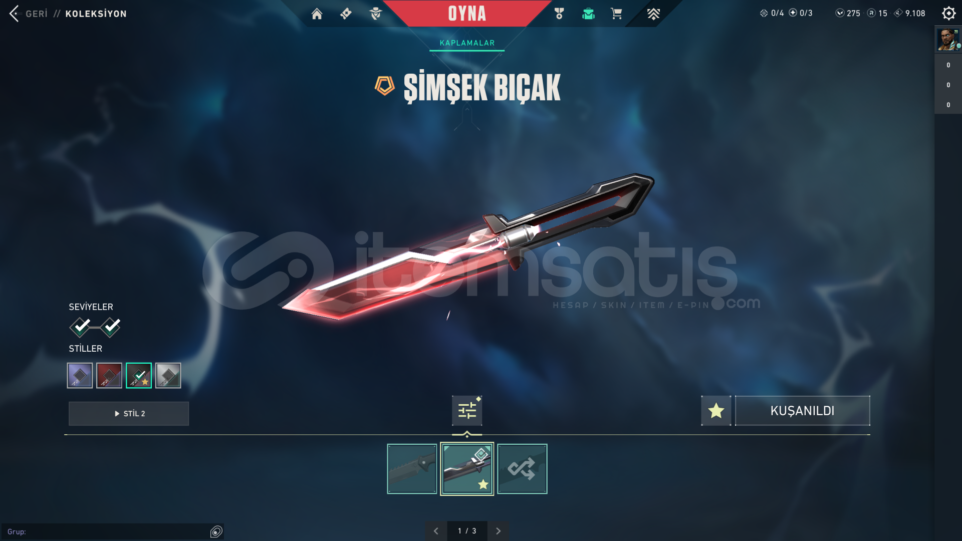 Hesap TR serveri, Ban yok, mail şifre değişir, fiyatta pazarlık vardır, hesap içerisinde 275 VP vardır, rank gümüş2, Sorularınız için mesaj atınız, hesap içerisindeki skinler :BIÇAK : Şimşek bıçak (tüm renkler açık)VANDAL : Ulupençe Vandal (Tüm renkler açık)PHANTOM : Sırçiçeği phantom (Tüm Renkler açık...