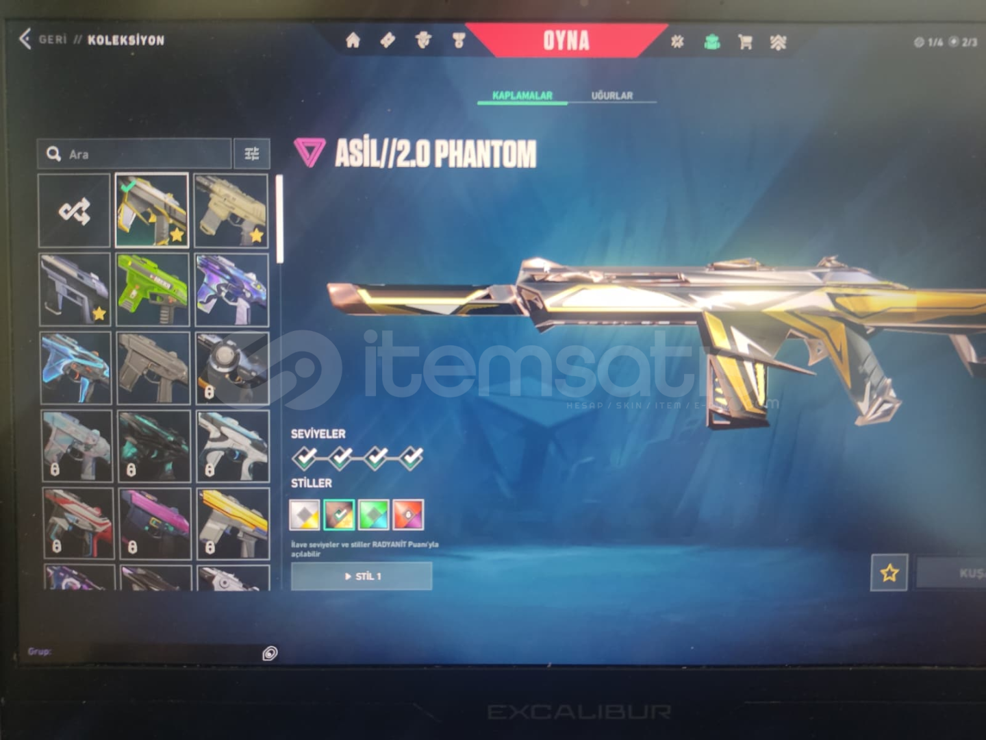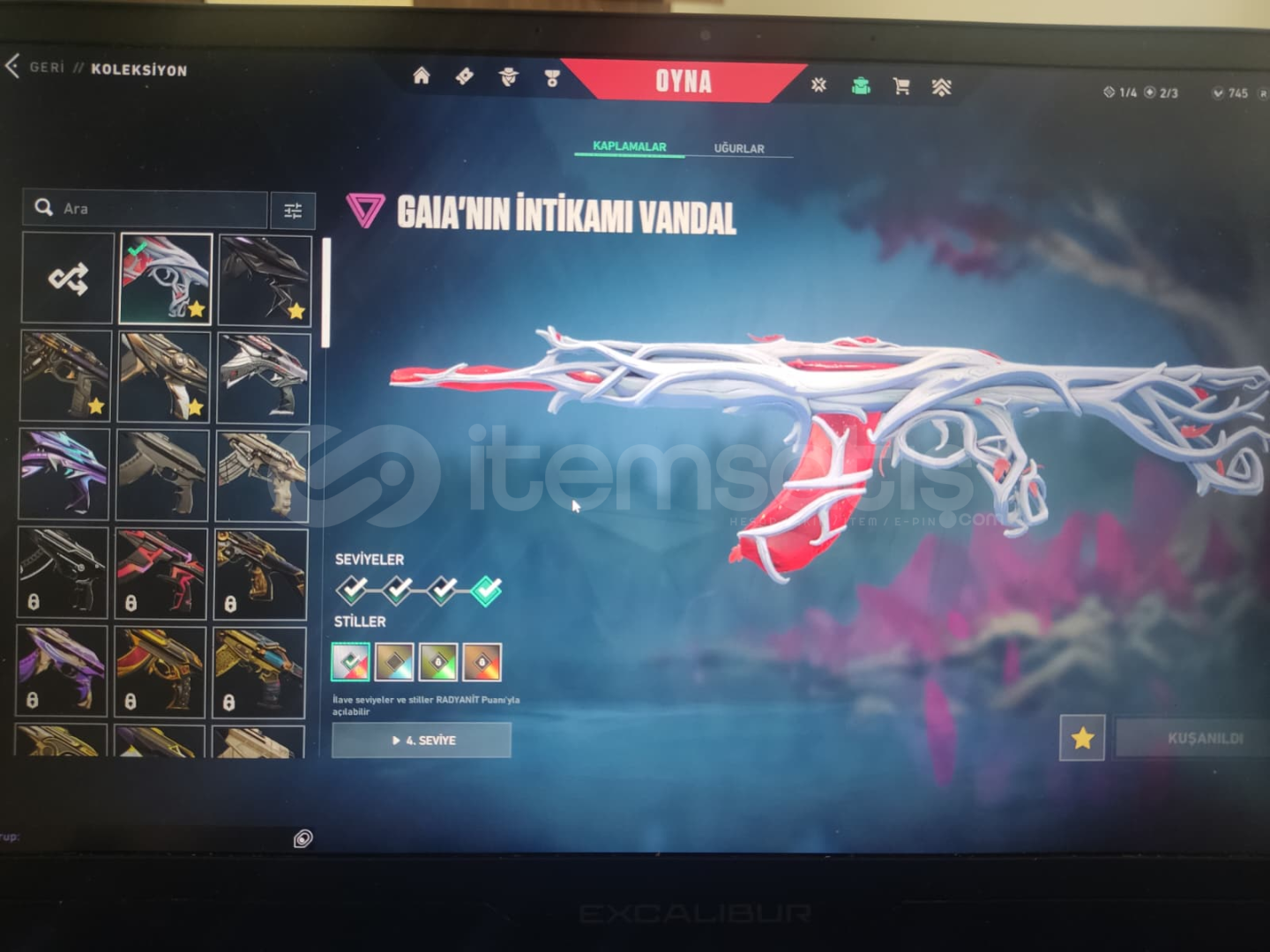 Asil 2.0 Phantom (Full seviye + tüm stiller)Gaia’nın İntikamı Vandal (4. seviye, efektli)Yağmacı Sheriff Full seviye beyaz rengi açıkEfektli ve animasyonlu silah kaplamalarıYüksek değerli skinlerOyuncu kartları ve ifadeler mevcut745 VP bulunuyorHesap bilgileri güvenli şekilde teslim edilir.Pazarlık vardır.İsteyenlere detaylı ekran görüntüsü / video atabilirim.