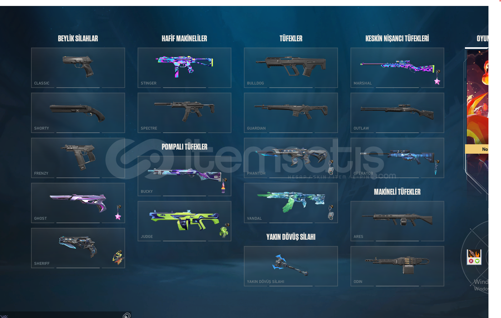 Yıkım Elçisi phantom,bıçak,şerifdolmir vandal var içinde ayrıyetten battel pass skinleride var hesapta 3. parti yazılım hiçbir şekilde kullanılmadı ilk maille teslim edilicekpazarlığa varım