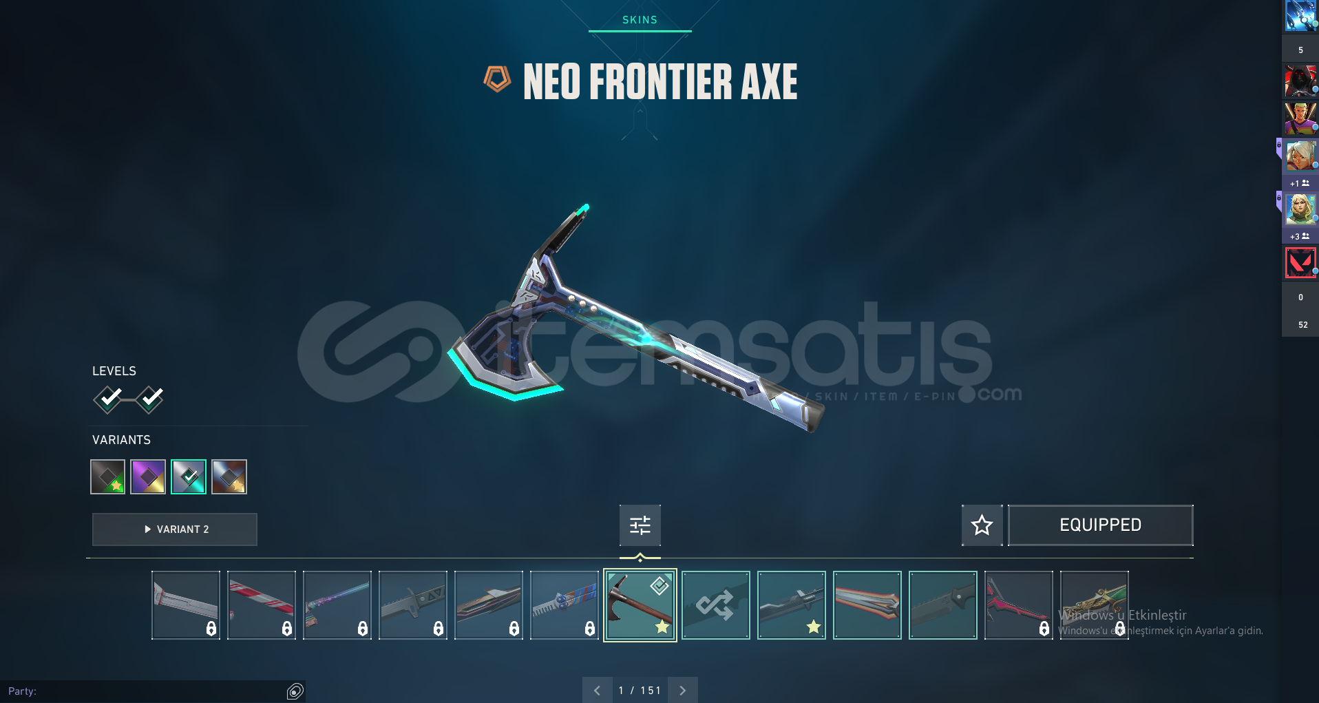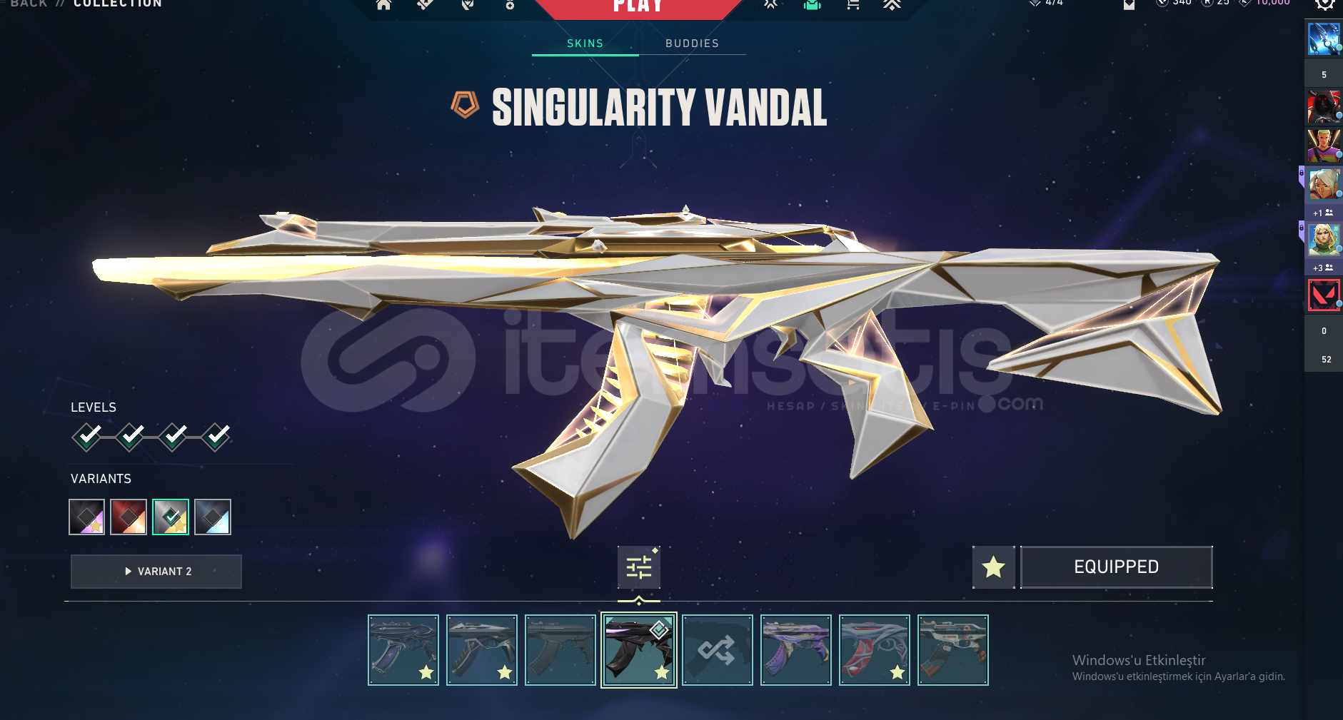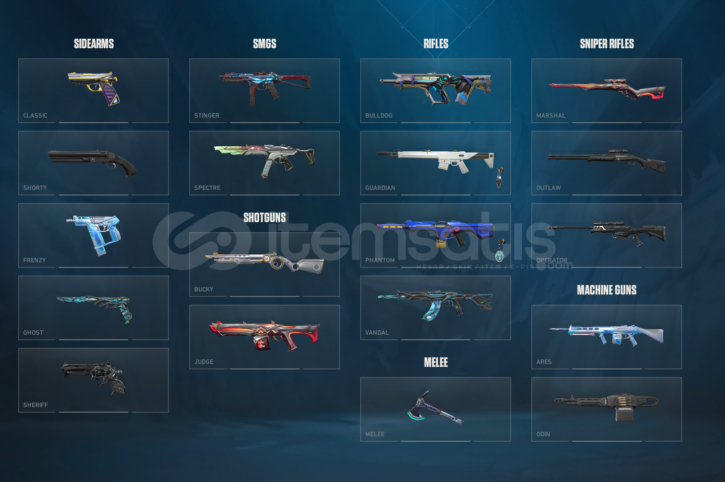 • Vandallar : Işık muafızı Gaia Yağmacı Anomoli vandallar +2 pass mevcut Phantom : İyon Radiant Elementi +2 Phoantom Ghost : Gaia Şerif : Yağmacı Spectra: Işık Muafızı classic : Asil Guardian : Neptün OP : Yağmacı bucky : Köken bıçaklar : Şimşek Bıçak Seri Tetik Balta +1 Battle pass NOT : Tüm silahlarda battle pass skini vardır odin harici şuanki sezon battle passi açıktır ekstra hesapta 340 Vp mevcuttur