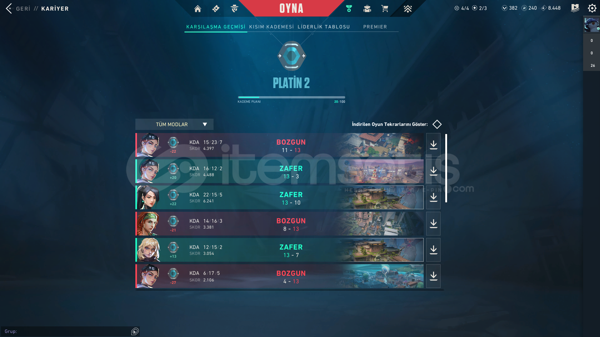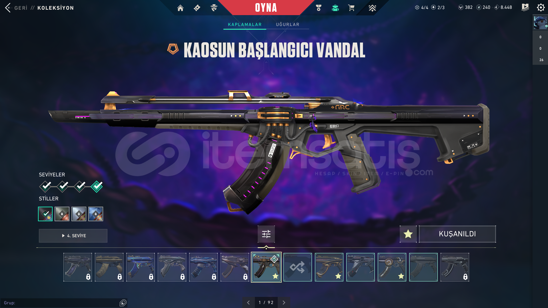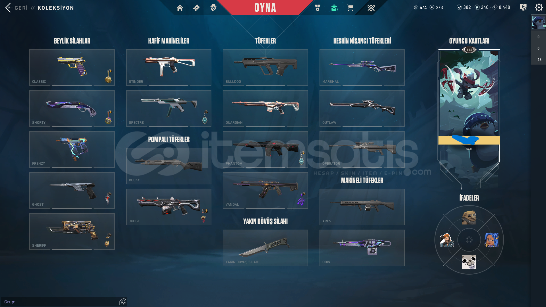 Hesabın içindeki skinler:Köken VandalKaosun Başlangıcı VandalCesur Yürek VandalCyrax GhostAsil ClassicAemondır SheriffŞimşek SpectraYıldız Belası PhantomOni PençeXenohunter BıçakHesaba toplam 5070TL yatırılmış hesap şuan gold 2