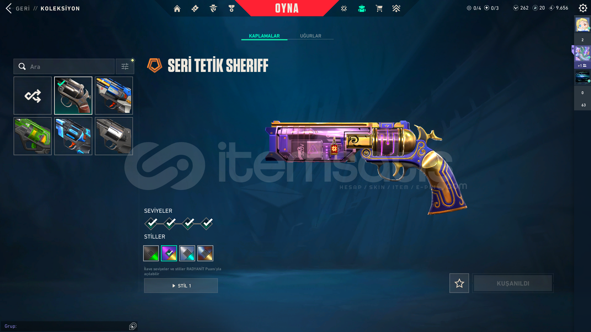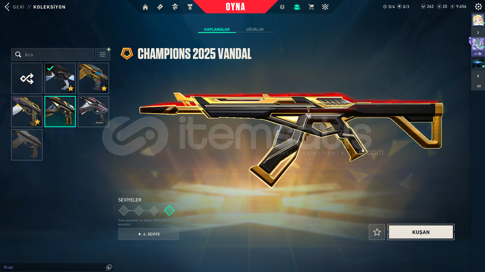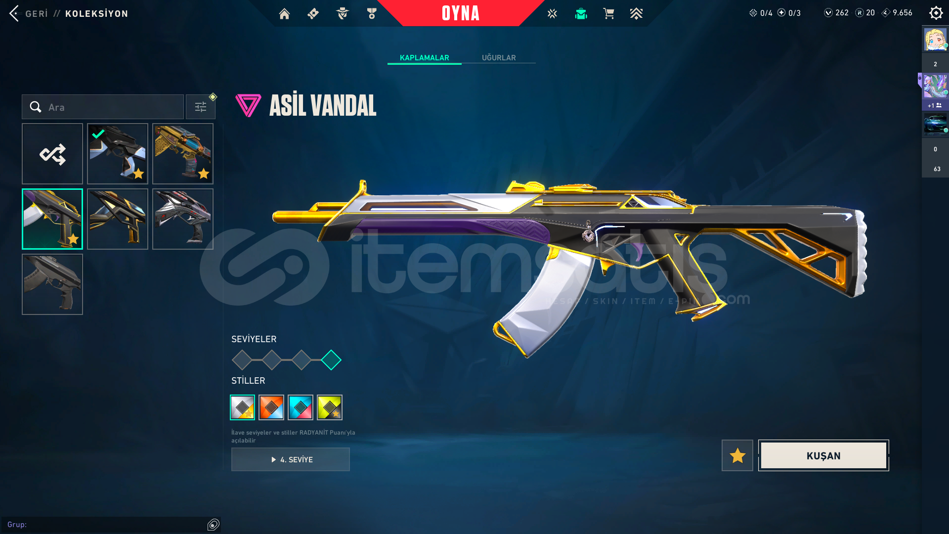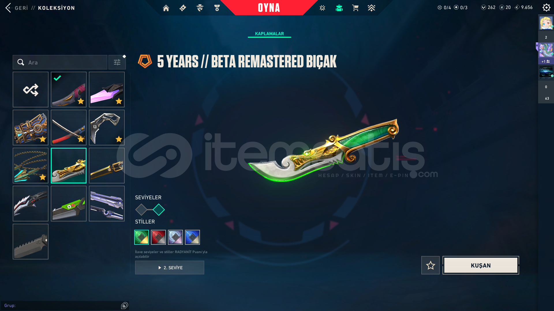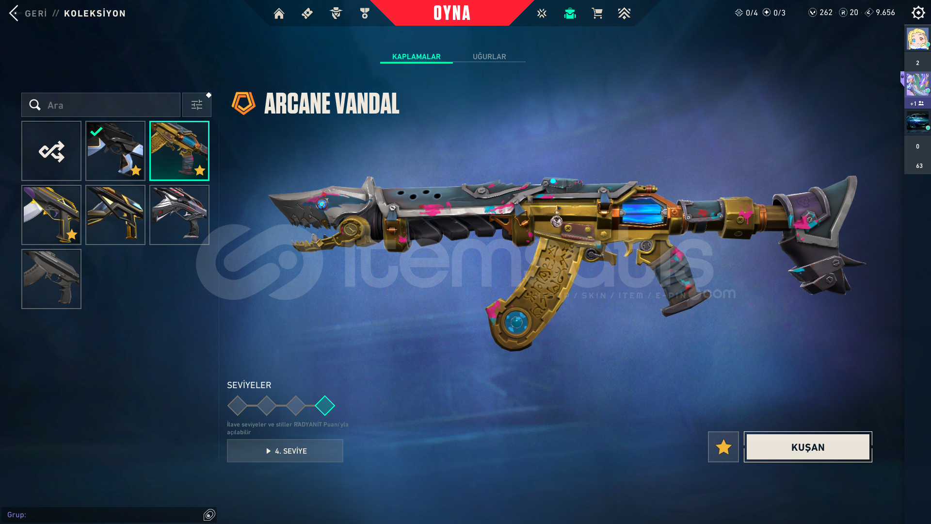 Kendi Hesabım Ranked Kasmadım Asil vandal ;1775Arcane Set;5925radiant entertainment system phantom;2975Seri Tetik şerif;2175El Yapımı Phantom;1275Yıldızparçalayan;5350Anomali kelebek;4350*3battle pas;3000 Oni katana:5;350VCT 2025 set:58505 years beta seti:3915Champions 2025 set:6640Zifiri tırpan 5350Ora vandal 2475TOTAL:56.405