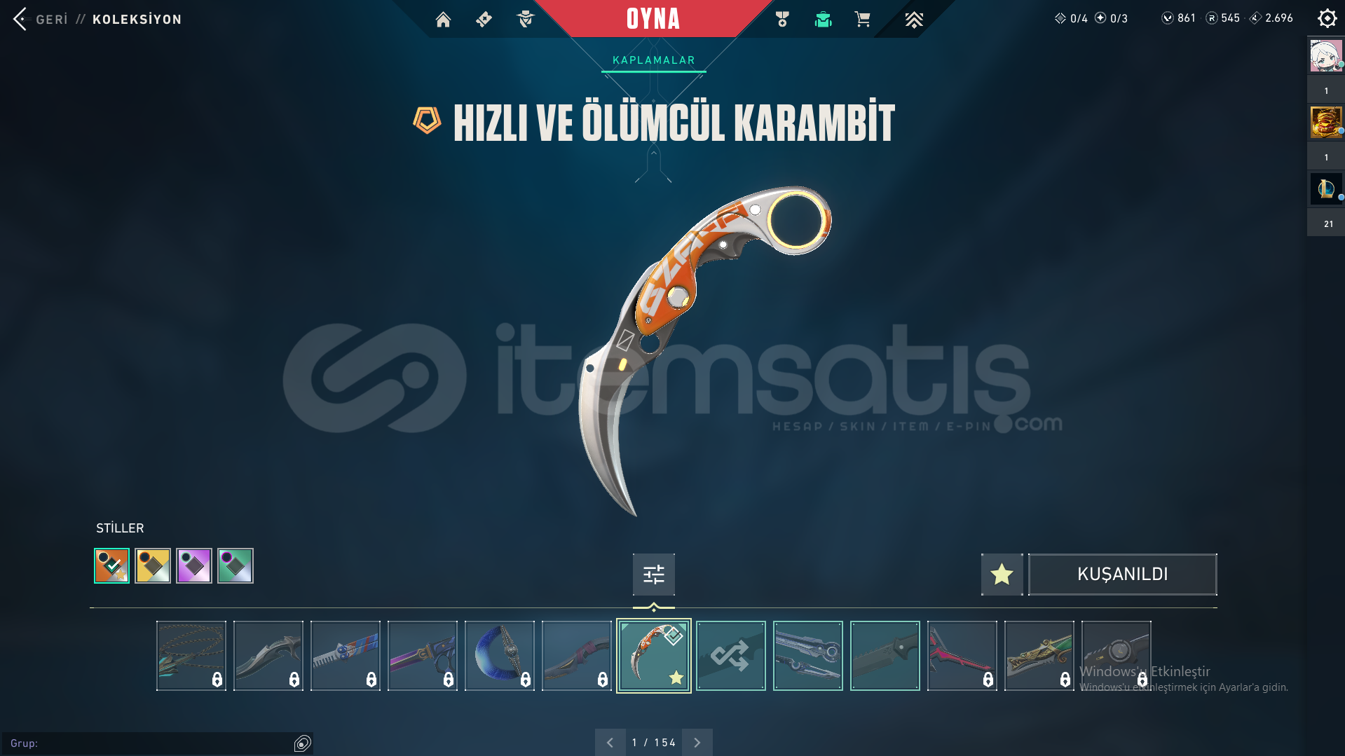 ANOMALİ PHANTOM,İYON VANDAL,ULUPENÇE VANDAL,YİTİK OPERATÖR,KAOSUN BAŞLANGICI OPERATÖR,2 ADET SAVAŞ BİLETİNDEN HIZLI VE ÖLÜMCÜL KARAMBİT VE UZAY GEÇİDİ BIÇAKLARI VARDIR HESAPTA 861 VP BULUNMAKTADIR. PHANTOM VE VANDALDA SAVAŞ BİLETLERİNDEN SİKİNLER DE VAR GÖRDÜGÜNÜZ ÜZERE . PAZARLIK DÜŞÜNÜLÜR.