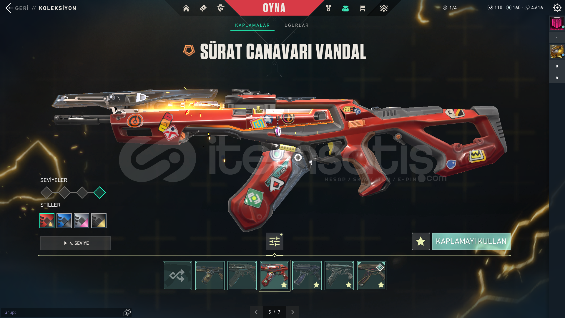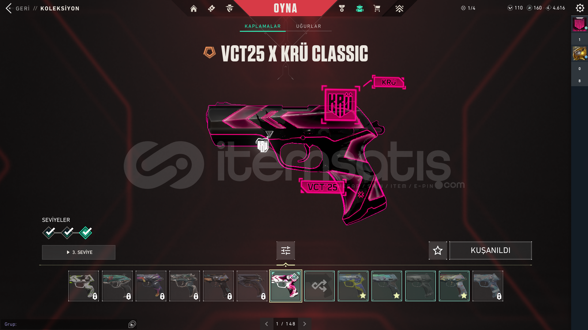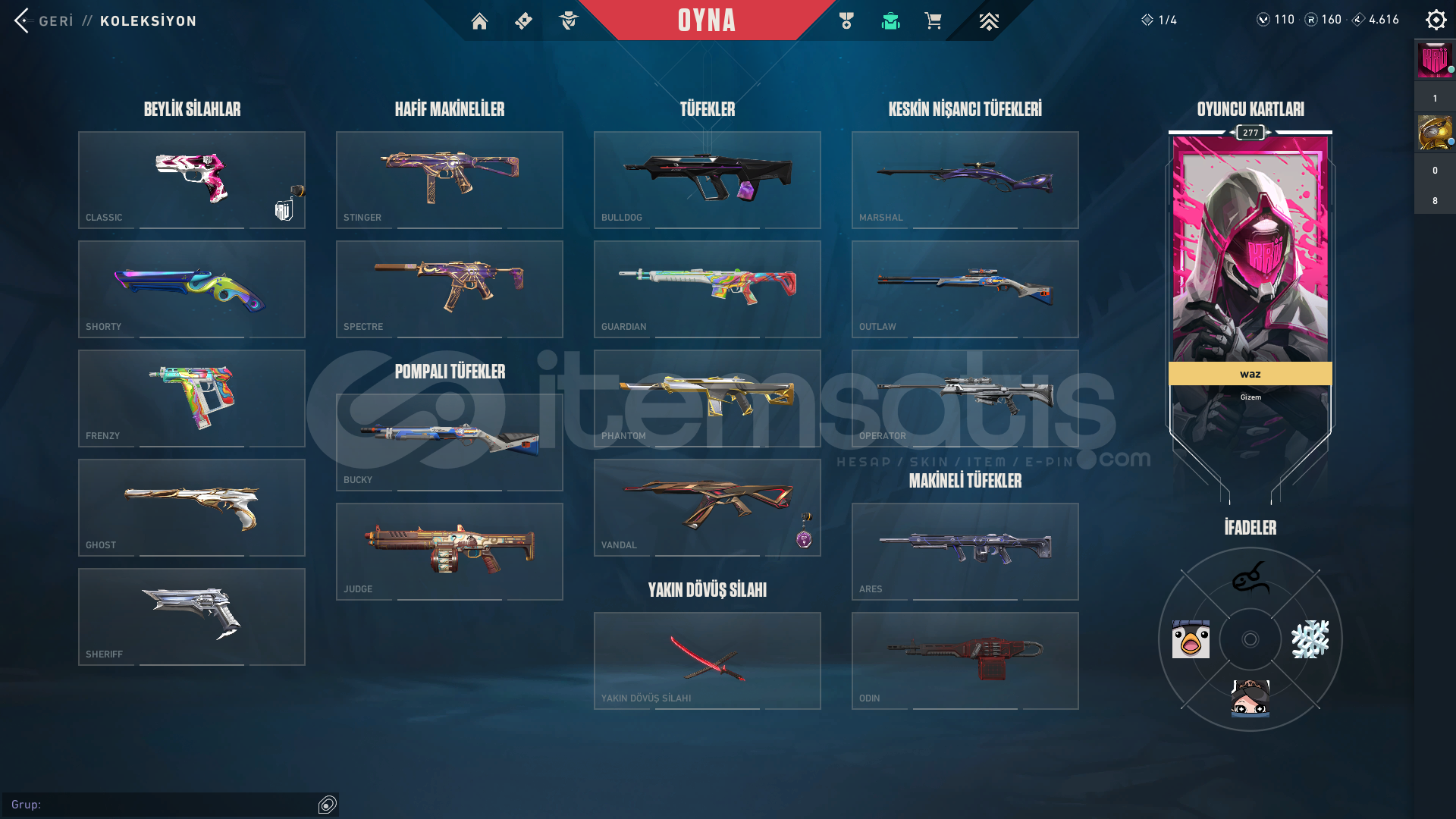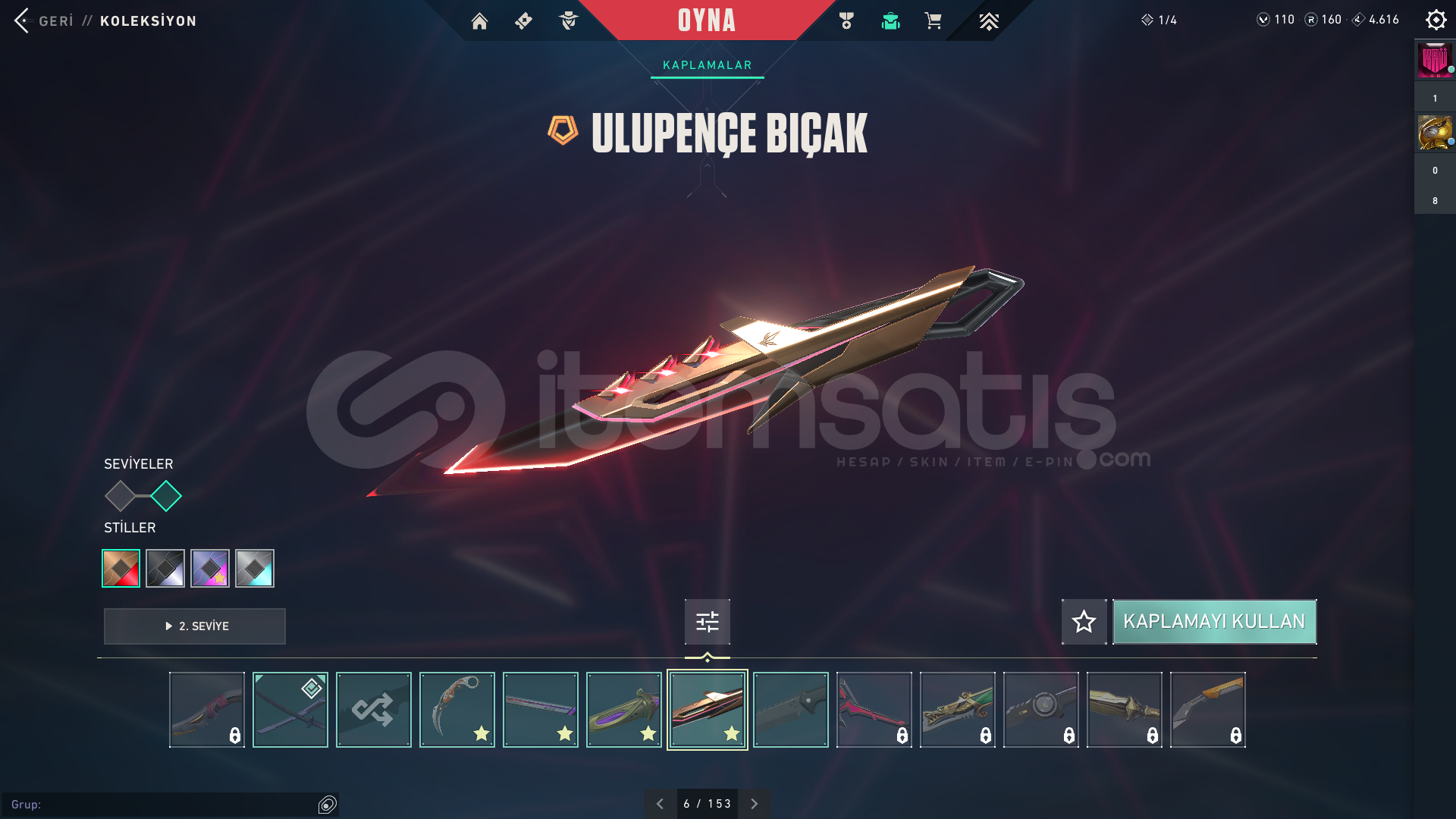 hesapta 3 sezon battlepass alınmış ve fullenmiştirtoplamda 2si bıçak toplam 14 tane yükseltilebilir skin vardır:vandal:aemondır, soğuk çelik, sürat canavarı, yağmacı, ulupençe ve yitikphantom:asiloperatör:yağmacıbıçak:EXO katana, ulupençe bıçak, hızlı ve ölümcül karambit, K/TAK katana, kum fırtınası hançerclassic: VCT25...