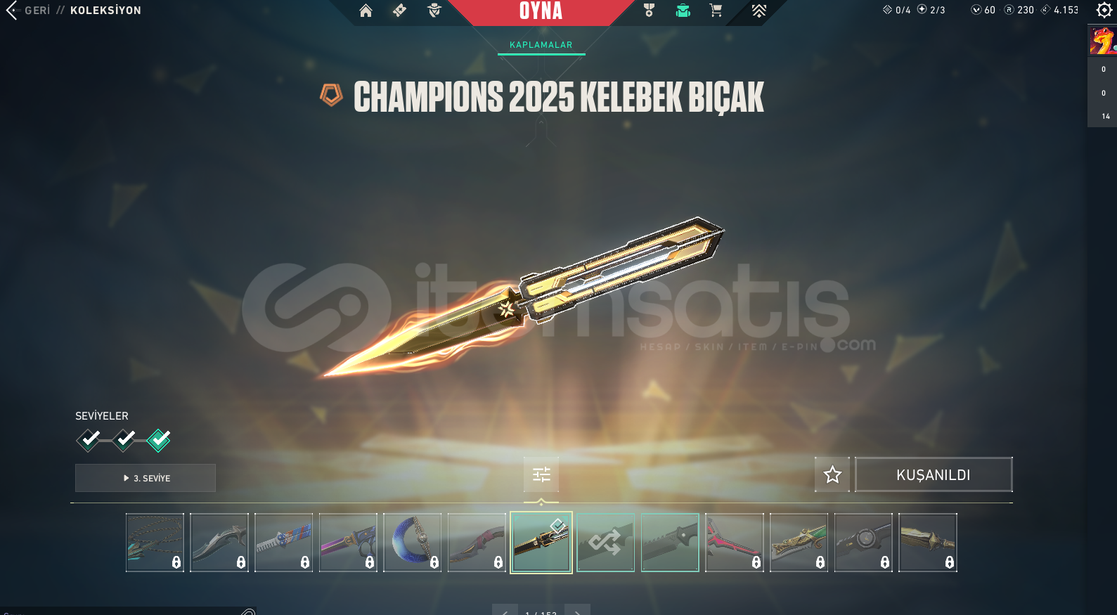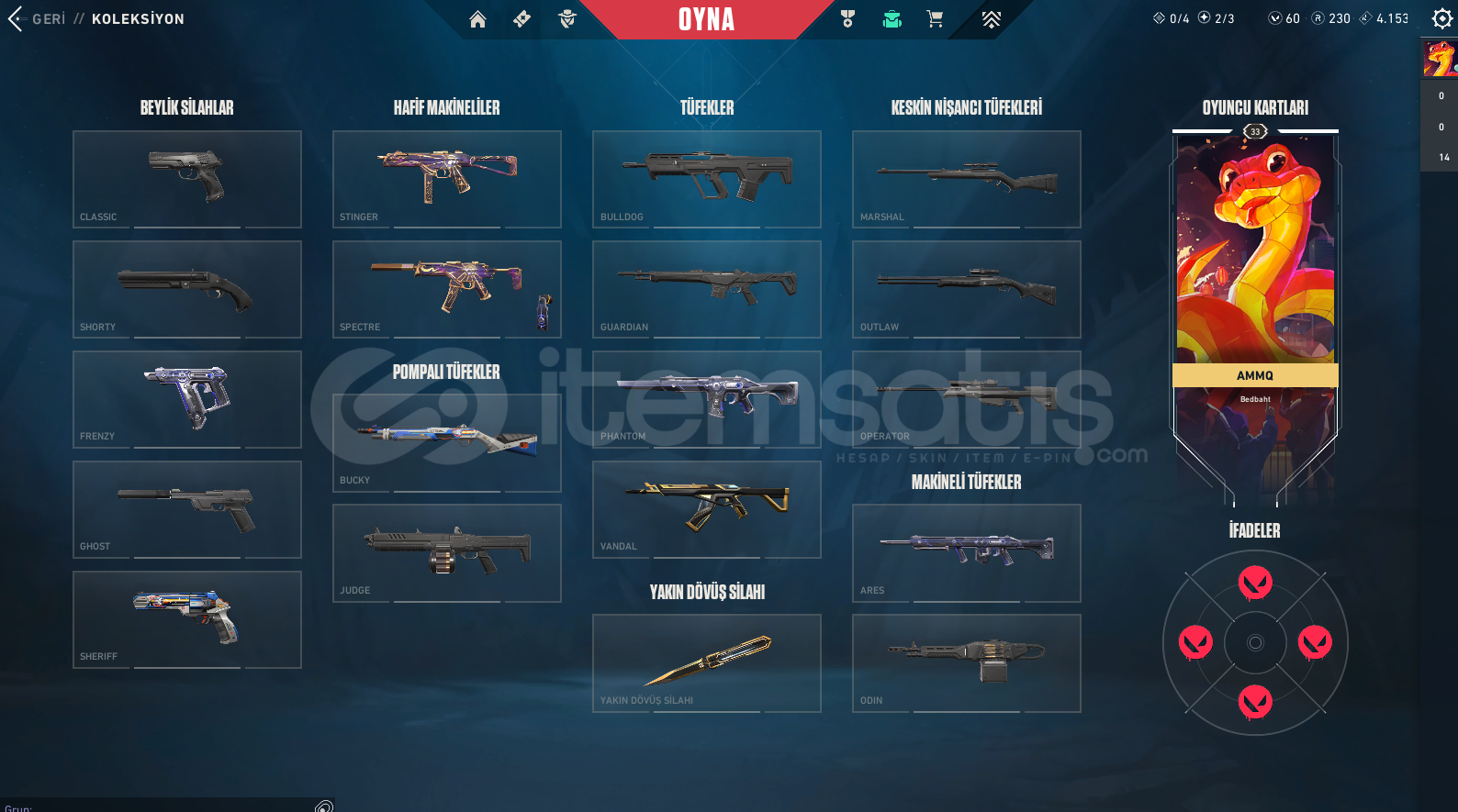 ALACAĞINIZ HESABIN MAİL ŞİFRE TÜM BİLGİLERİ DEĞİŞİR.GÖRSELDE GÖRDÜĞÜNÜZ HESAP TESLİM EDİLECEKTİR.SİLAH RENKLERİNİ SKİN OLARAK SAYMIYORUZ.SUNUCULAR TÜRKİYEDİR PİNGSİZ OYNANIR.DİĞER BÜTÇEYE UYGUN İSTEK SKİNLİ İLANLAR İÇİN BİZE ULAŞIN.